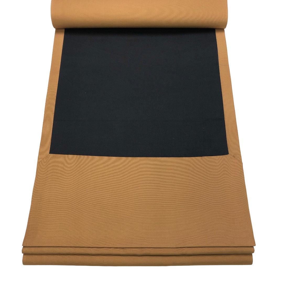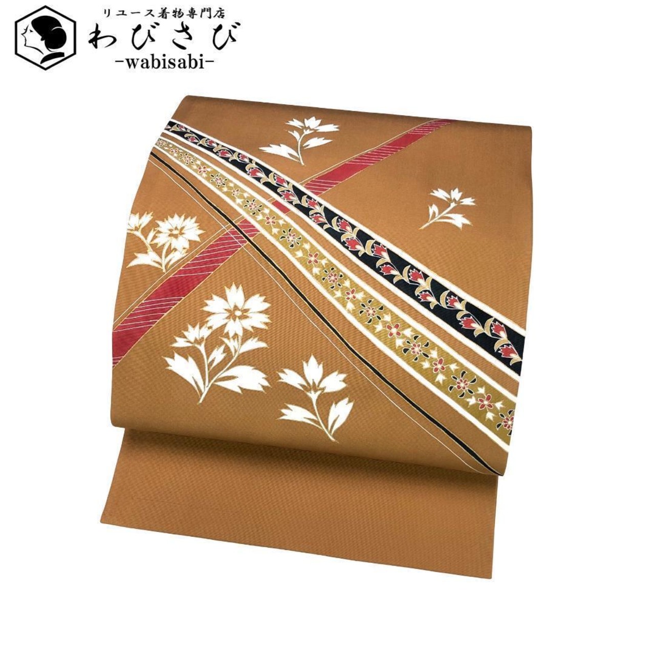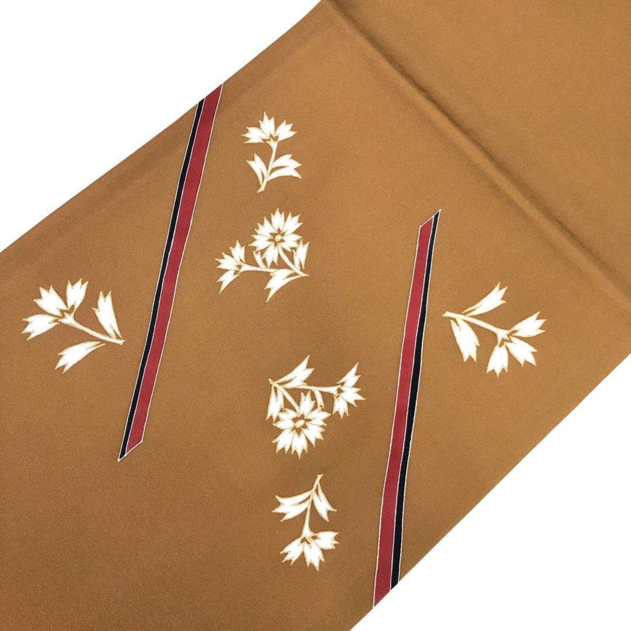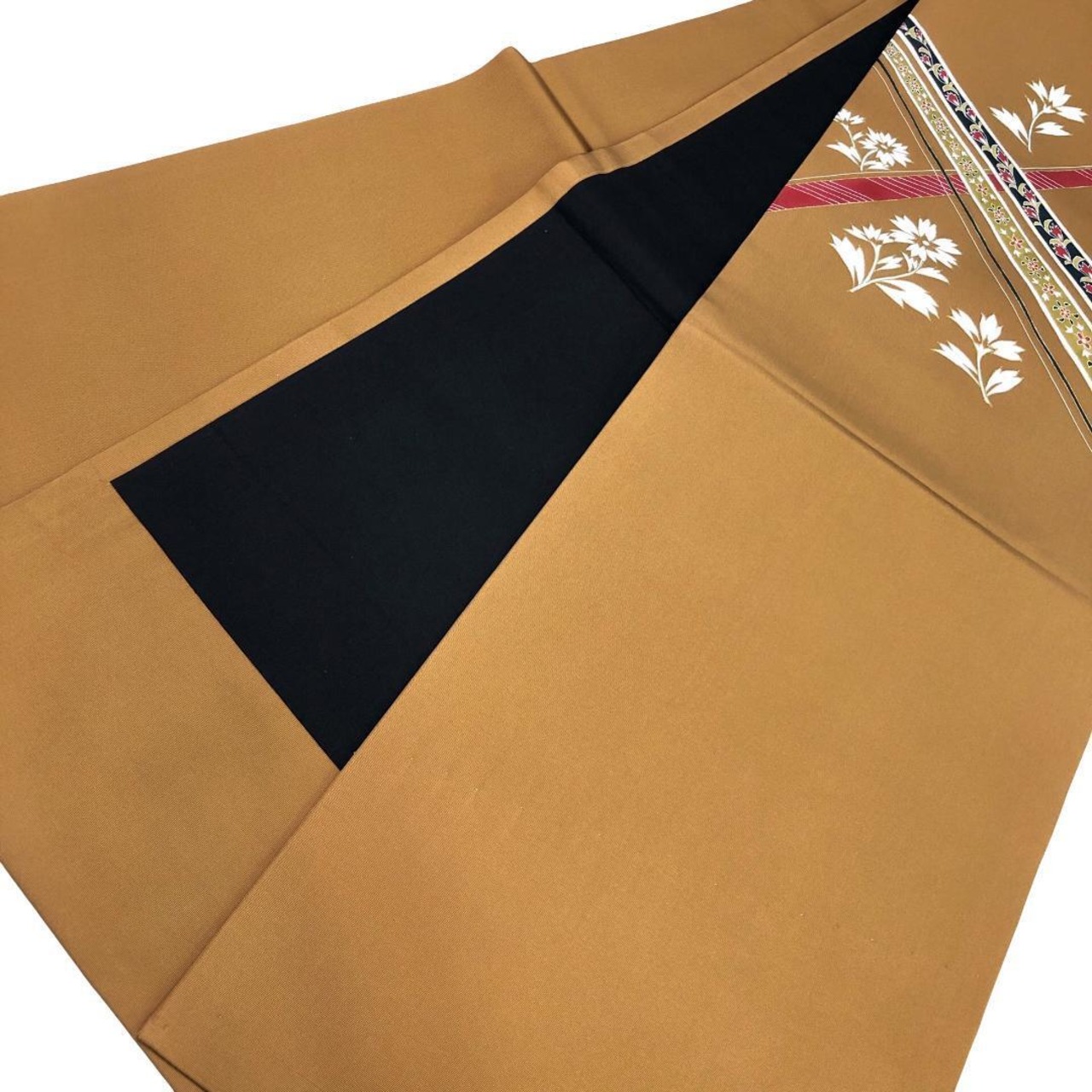 琥珀色のお色味に金彩が使われた花柄模様がデザインされた雰囲気の良い素敵な柄裄のお品でございます。