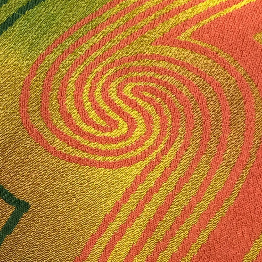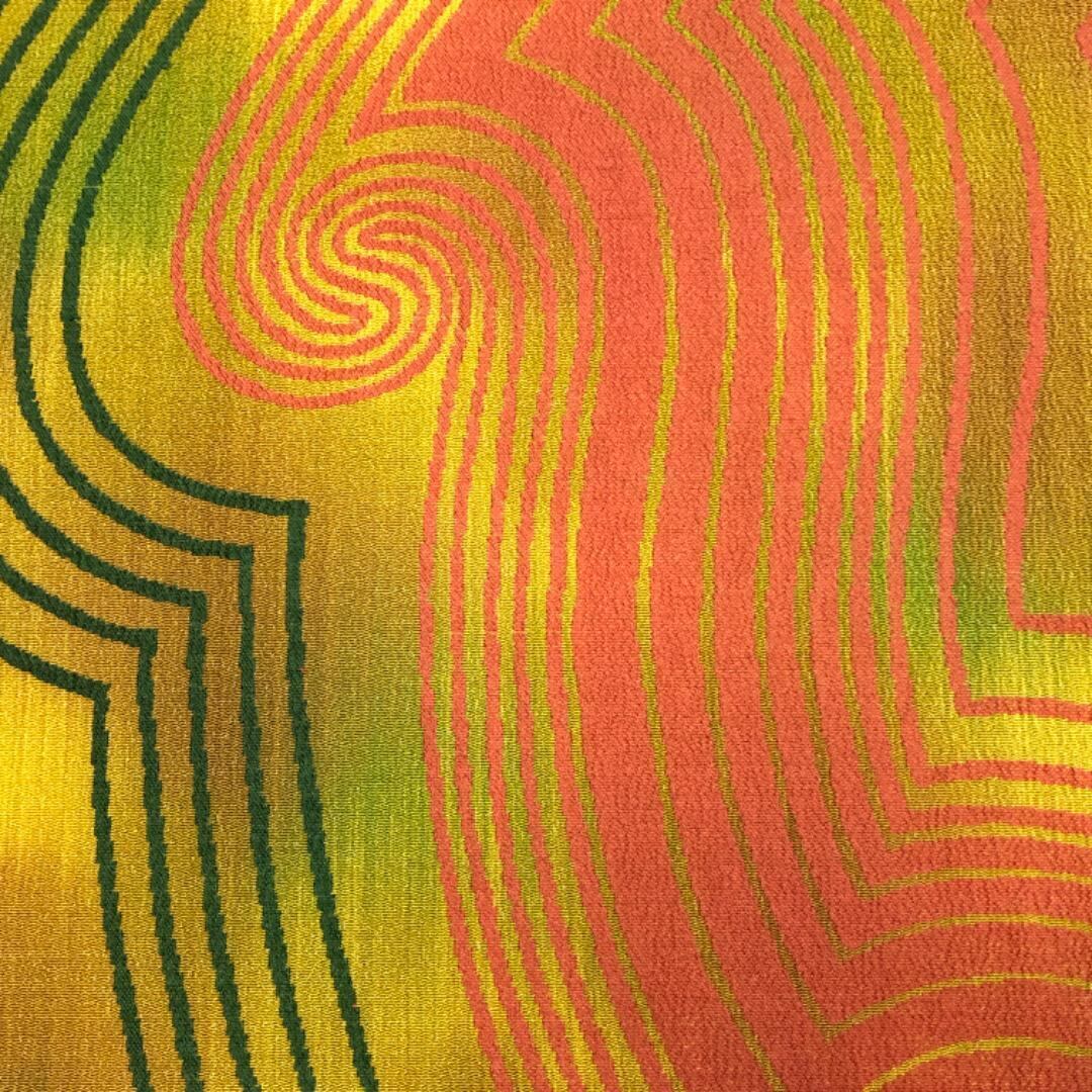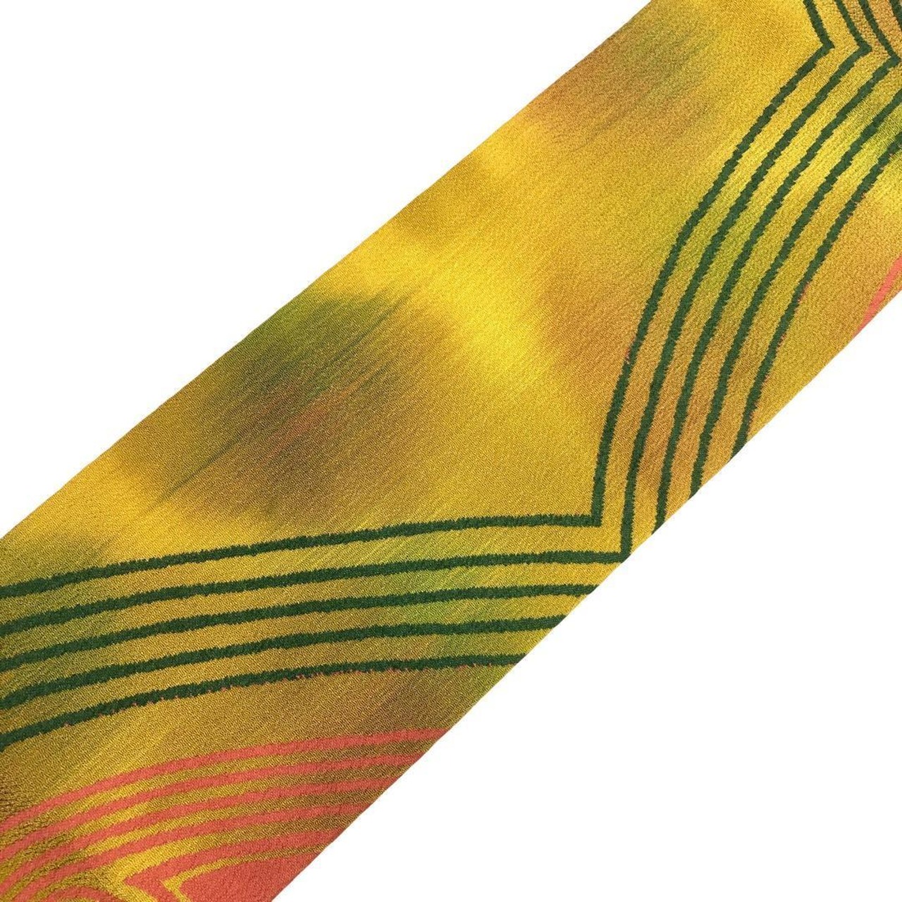 黄支子色ベースに暈しの縮緬地に曲線模様がデザインされた素敵な柄裄のお品でございます。