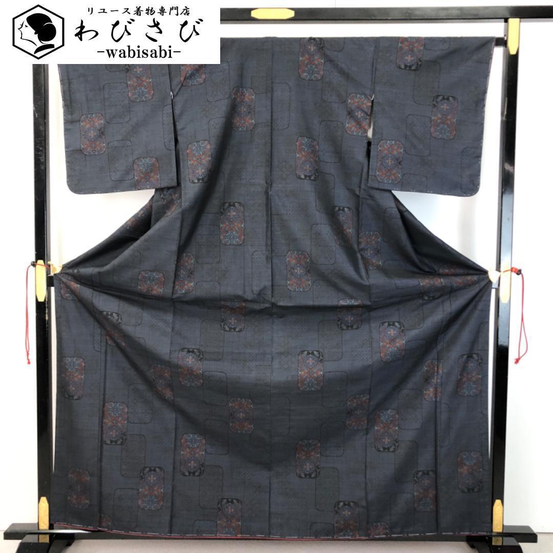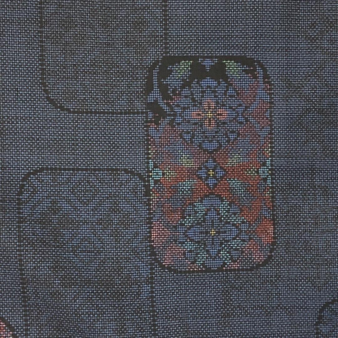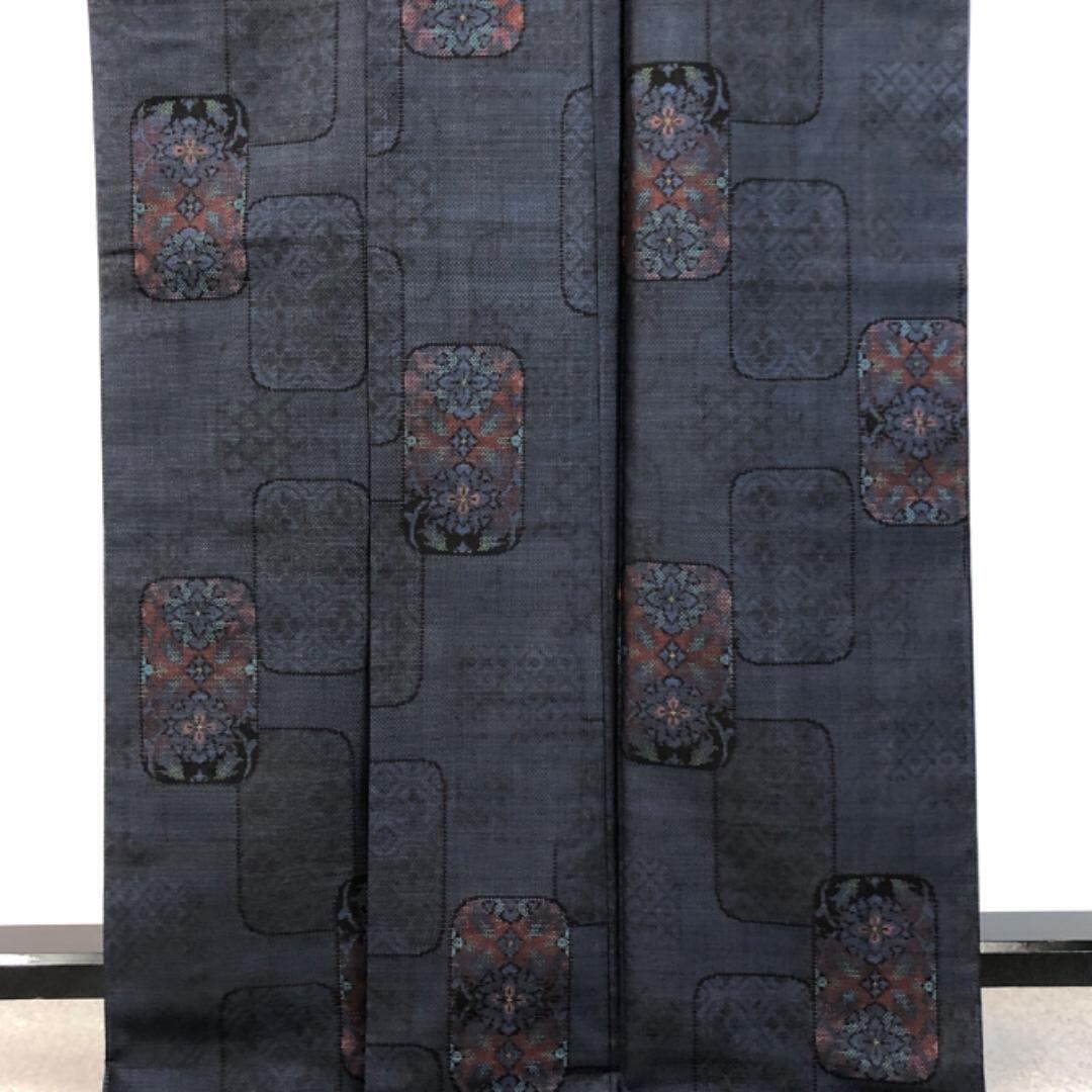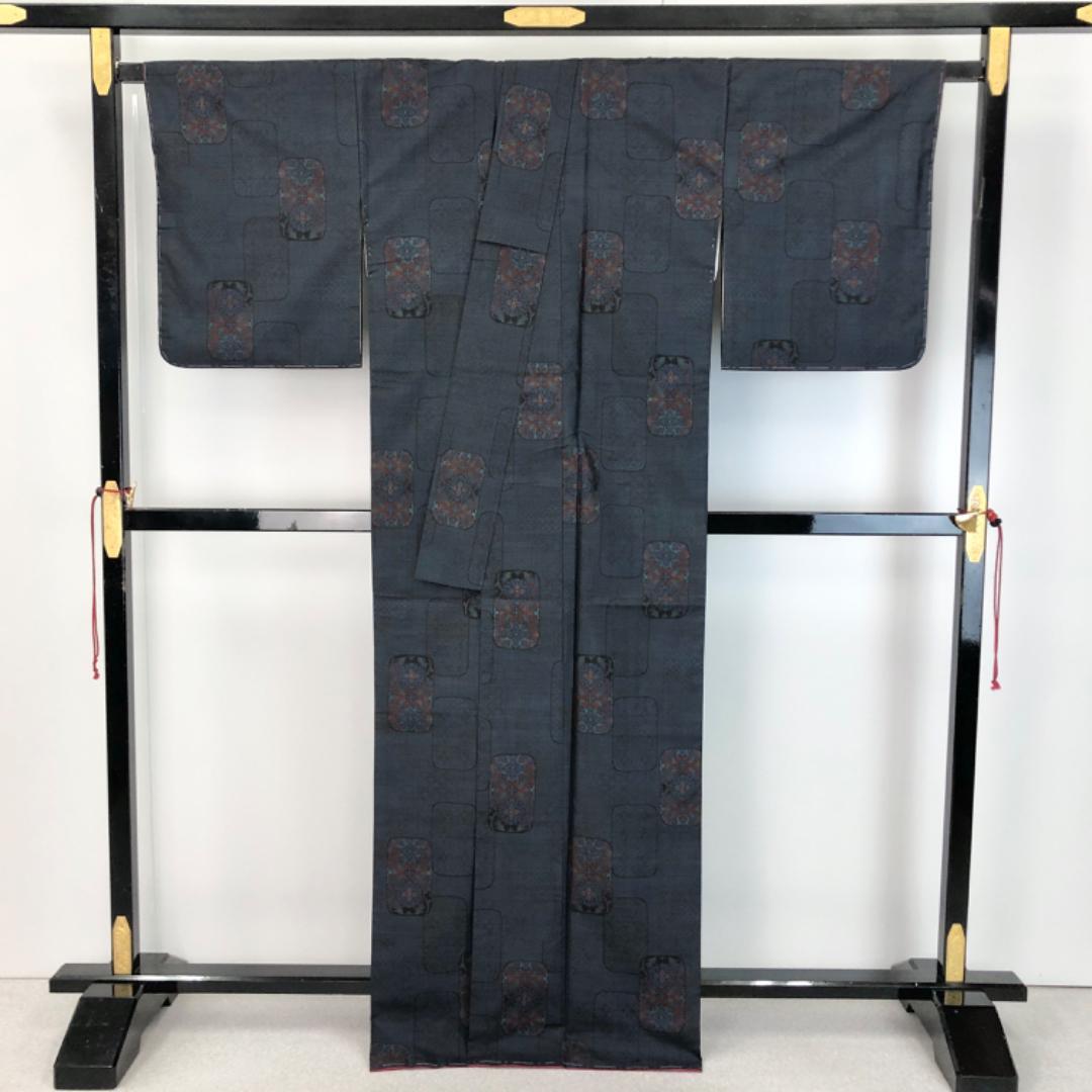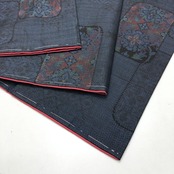 藍泥染のお色味に四角に花模様がデザインされた素敵な柄裄のお品でございます。