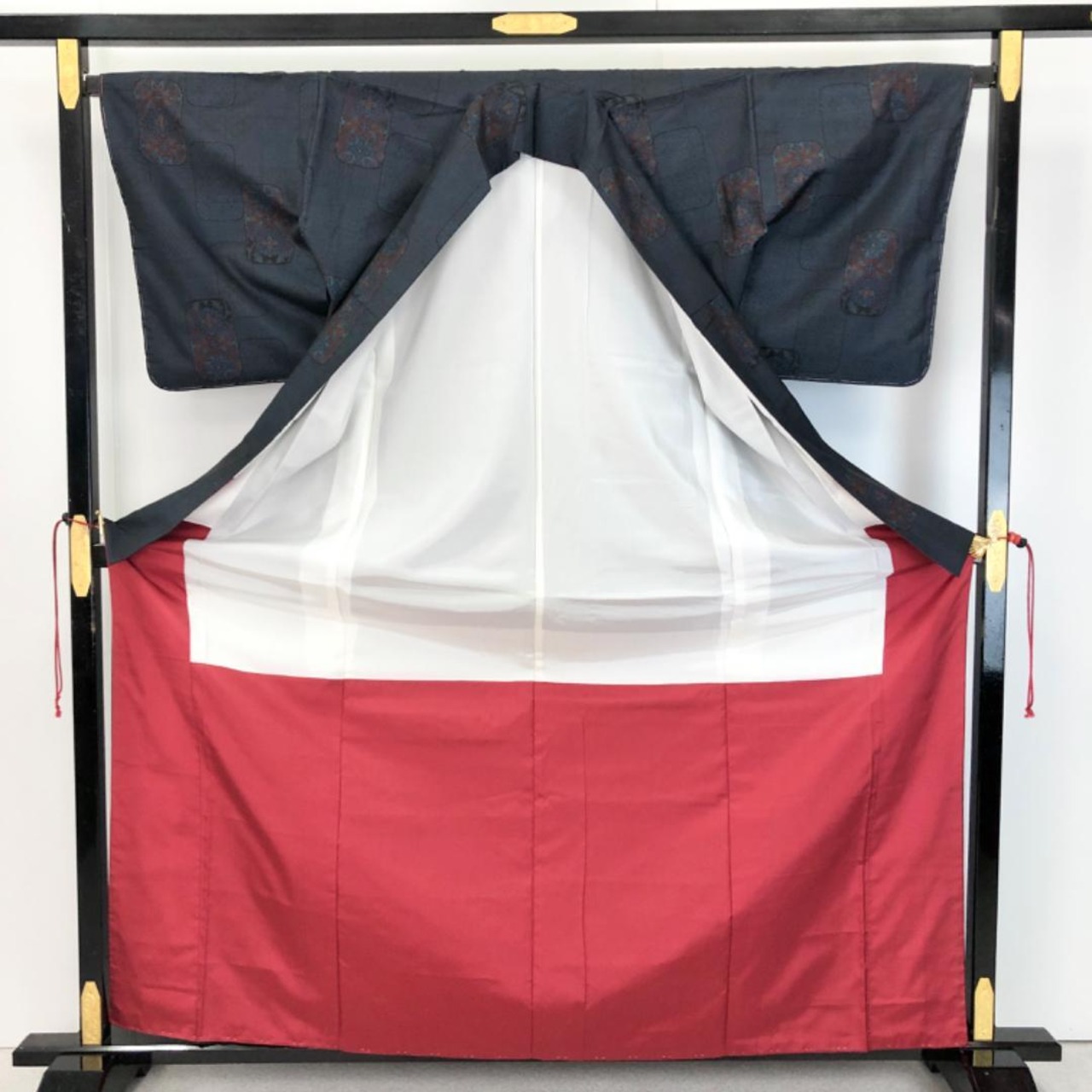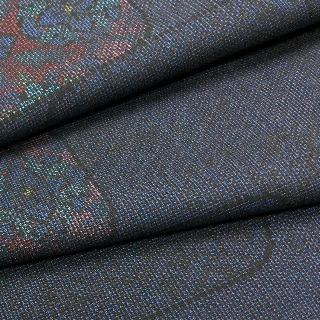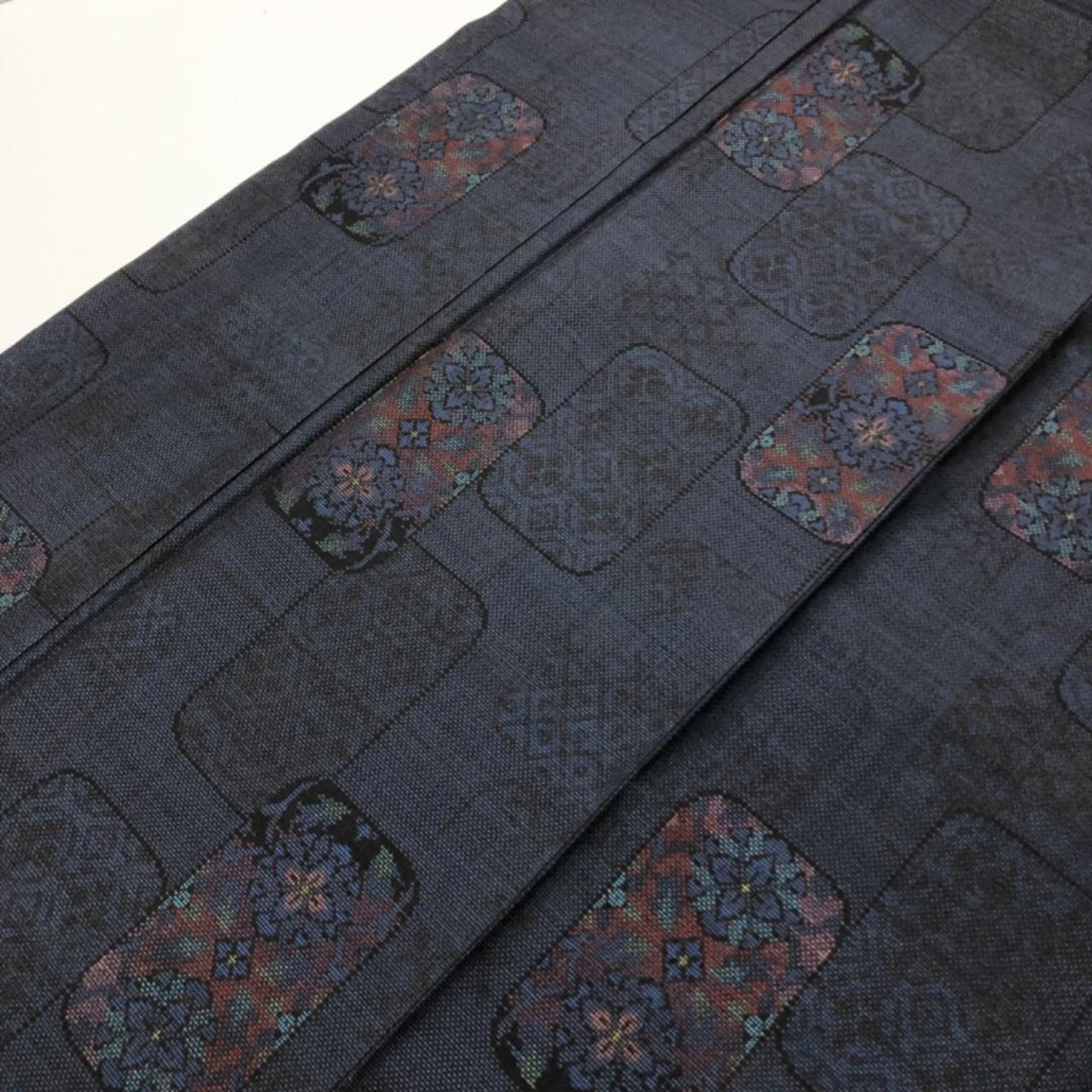 藍泥染のお色味に四角に花模様がデザインされた素敵な柄裄のお品でございます。