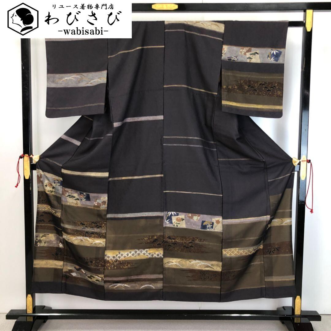 単衣 付下げ 横縞模様 雪芝に地紙 松 紺滅色 金彩 ガード加工 K-5502 着物 きもの kimono 和服 和装 中古 リサイクル着物 【送料無料】