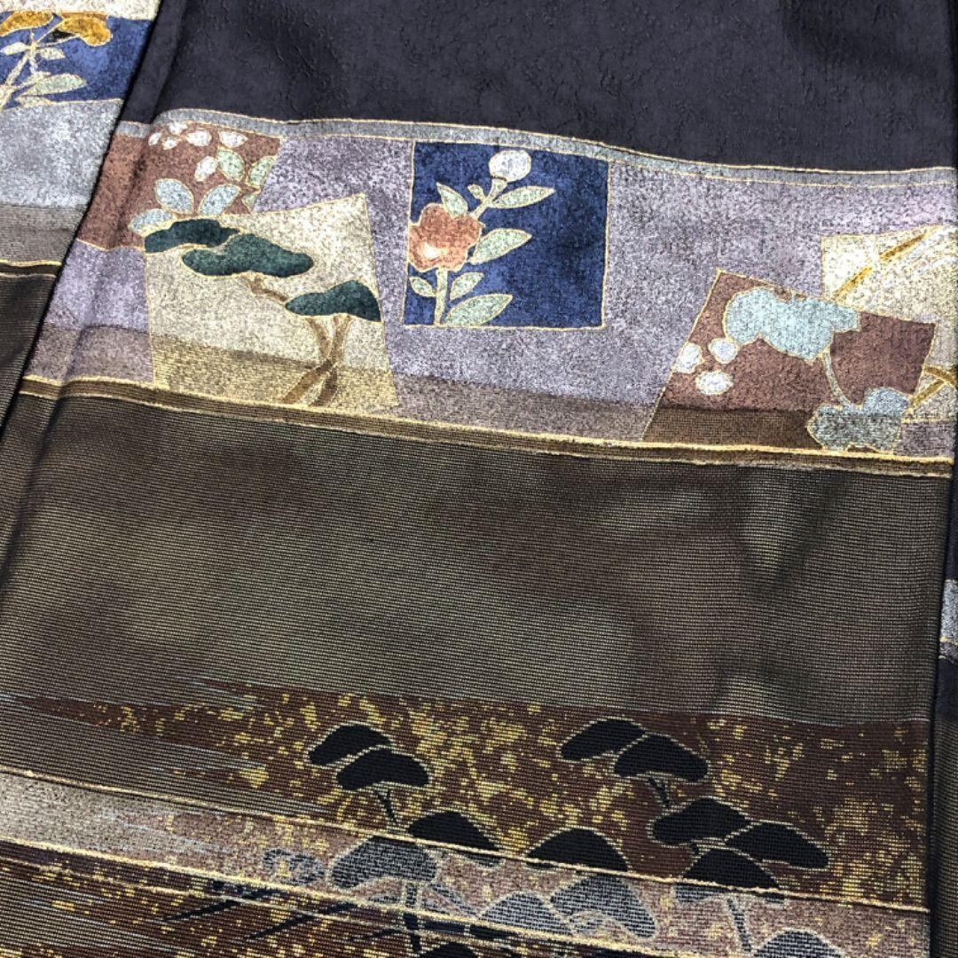 紺滅色ベースのお色味、横縞、雪芝に地紙などの柄裄がデザイン、部分的に紗合せのような裏地と透け感のある二枚の生地が重なり合った珍しい希少なお品です。