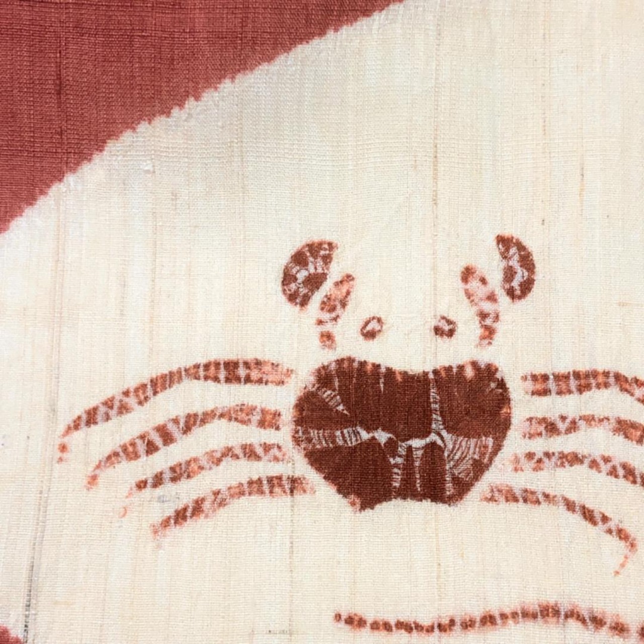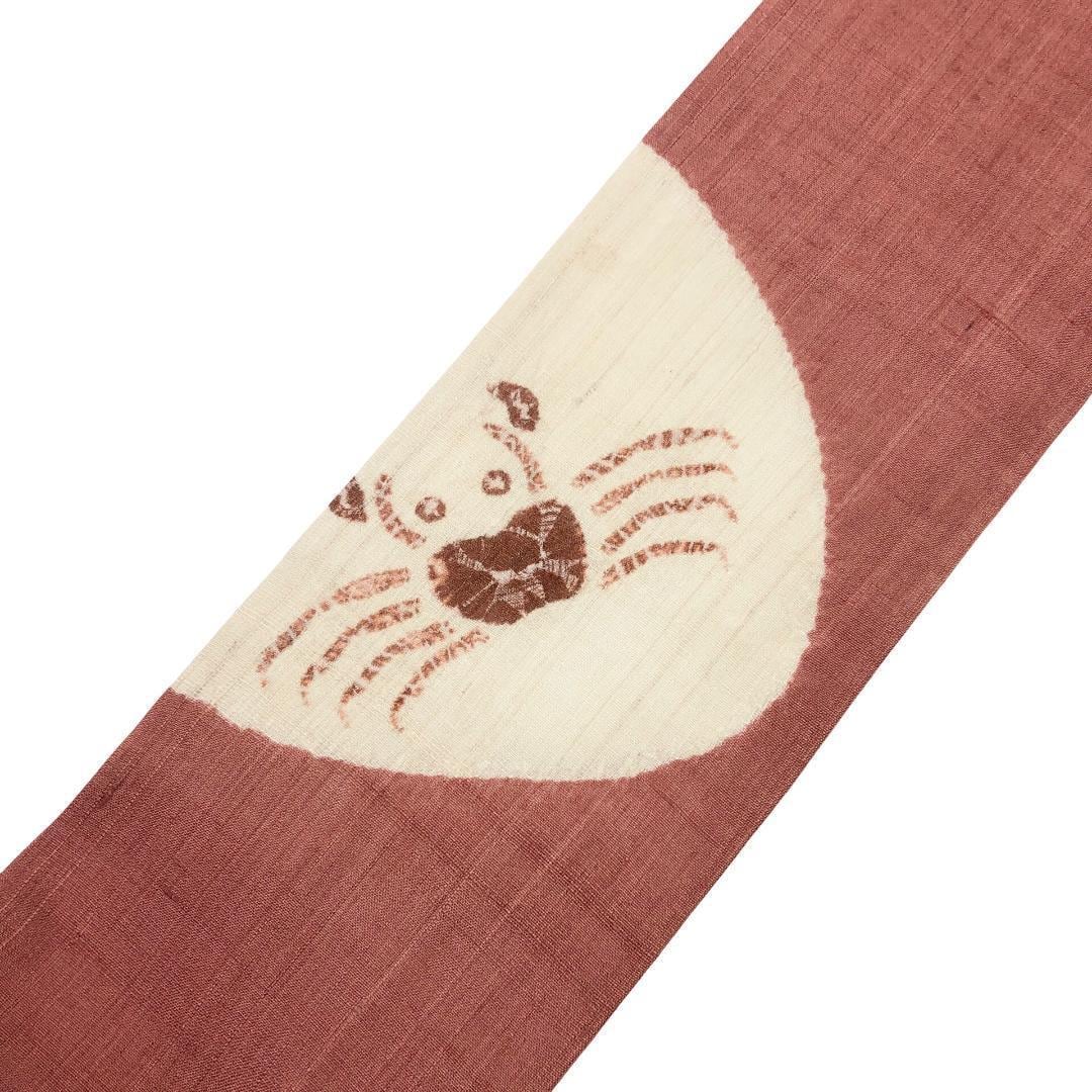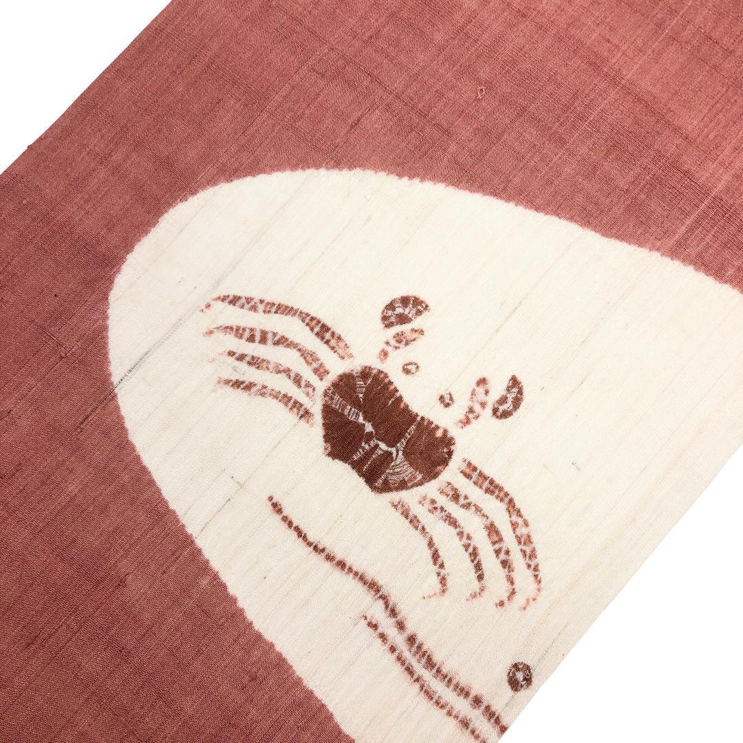 浅蘇芳色ベースのお色味に絞り柄の蟹がデザインされた雰囲気の良い素敵なお品でございます。