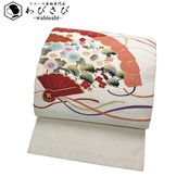 胡粉色の品のあるお色味に扇子に松、梅に花模様がデザインされた素敵なお品でございます。