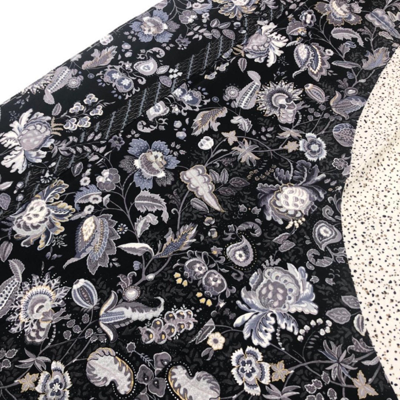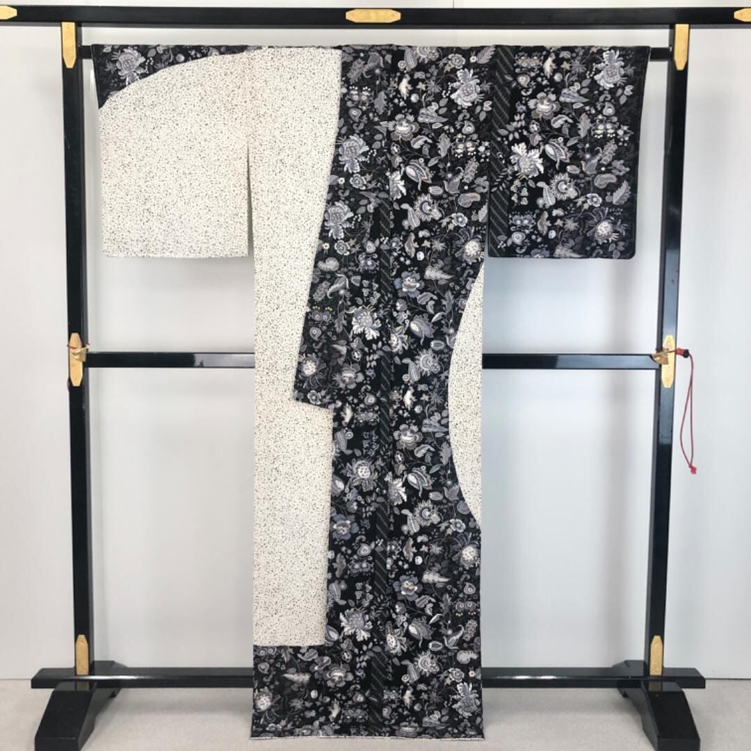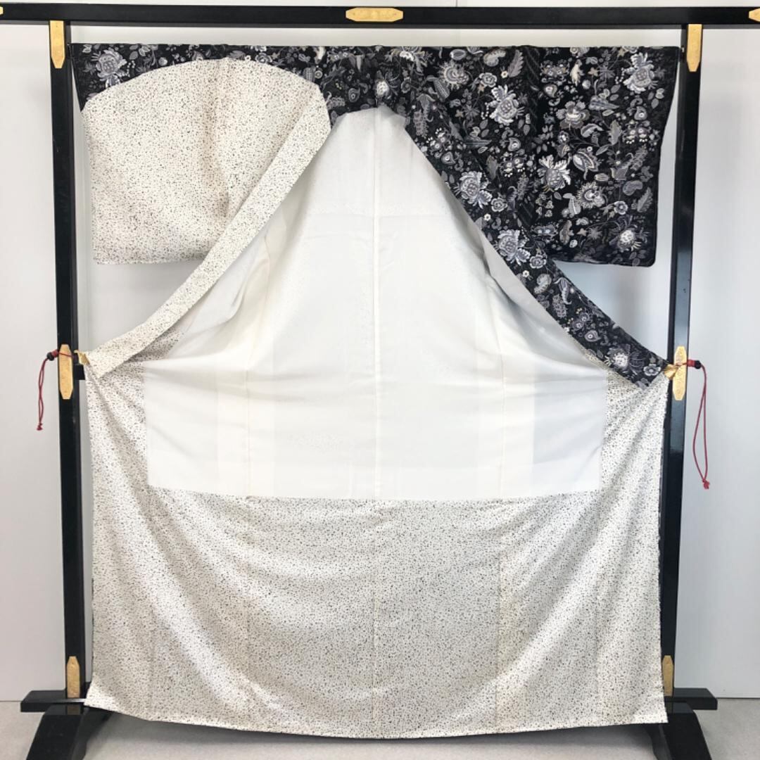 乳白色ベースのお色味に美しい花模様の柄裄がデザインされた雰囲気の良い素敵なお品でございます。