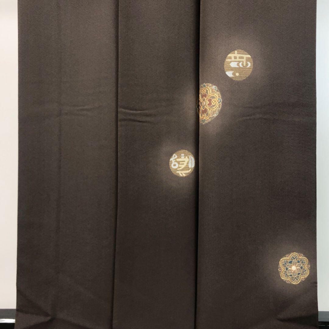 燻色の落ち着きのあるお色味に金駒、金糸が使われた丸い華柄模様がデザインされた素敵なお品でございます。