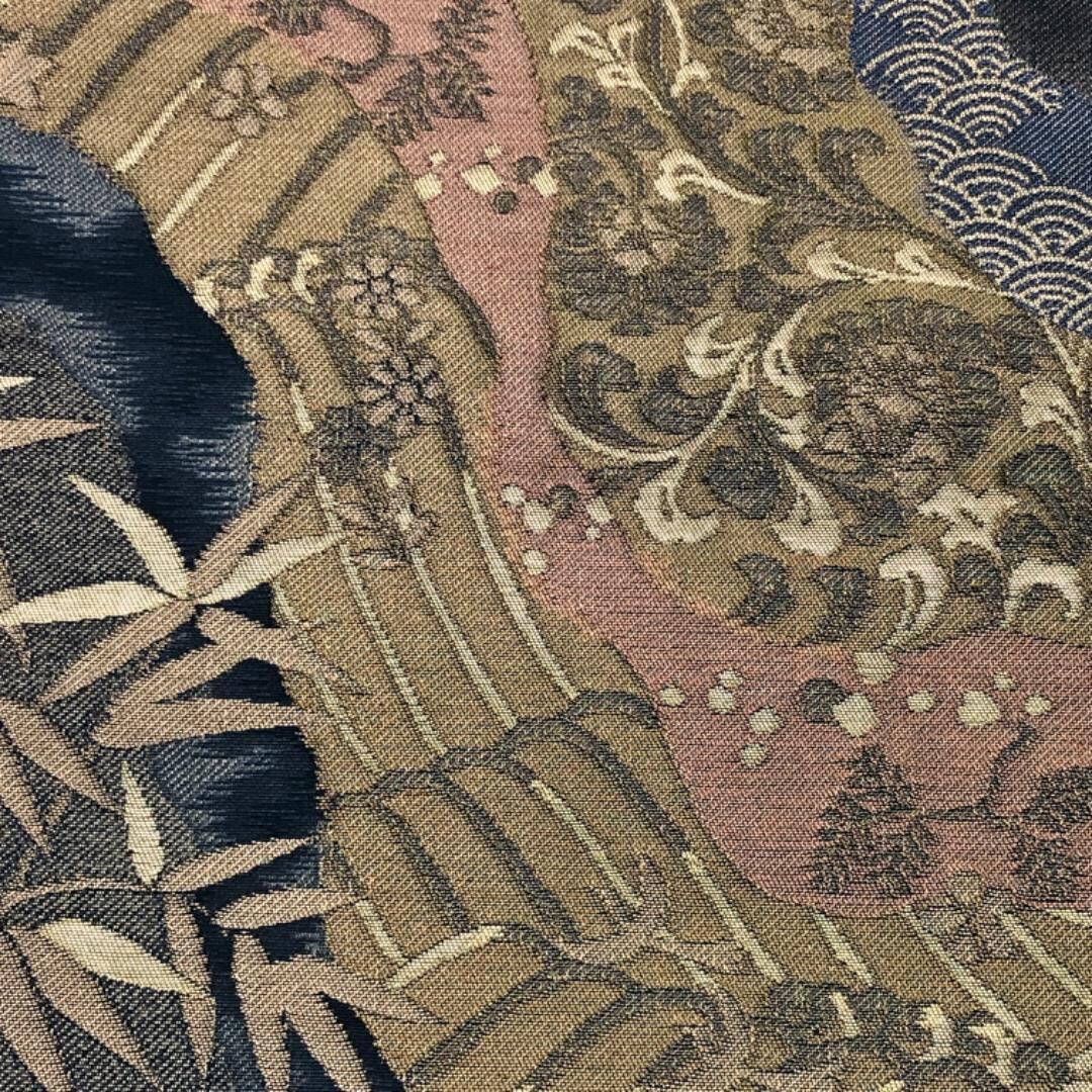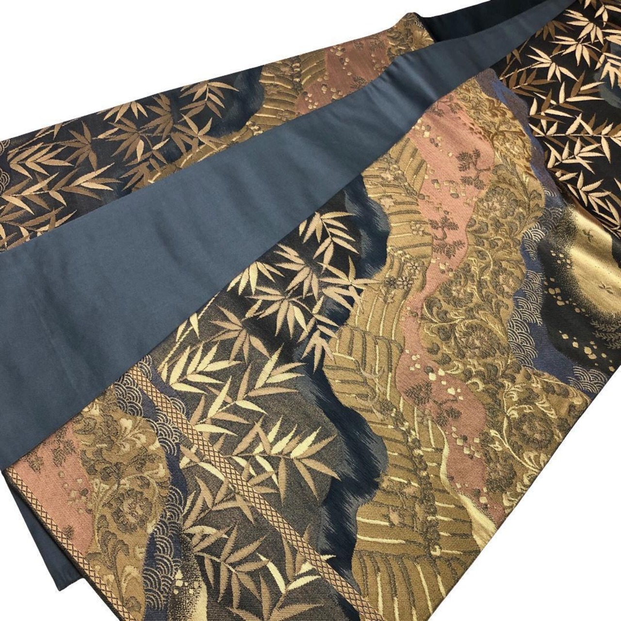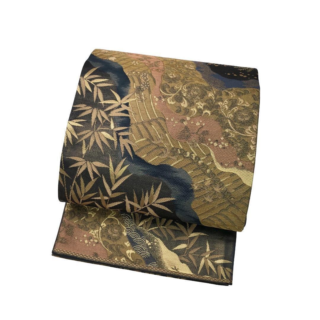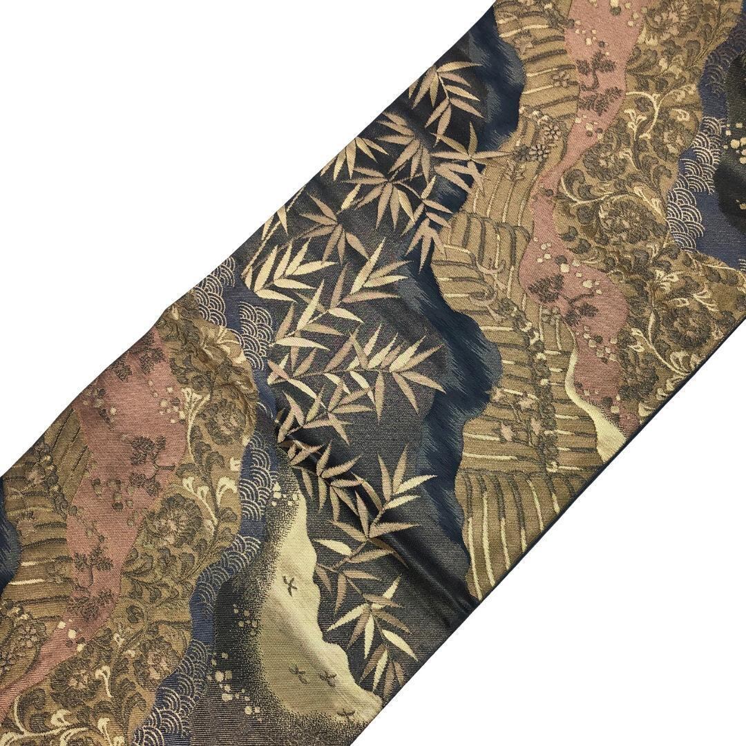 錫紵色ベースのお色味に道長取り、波に花唐草模様、鳥、笹などの柄行がデザインされた素敵なお品でございます。