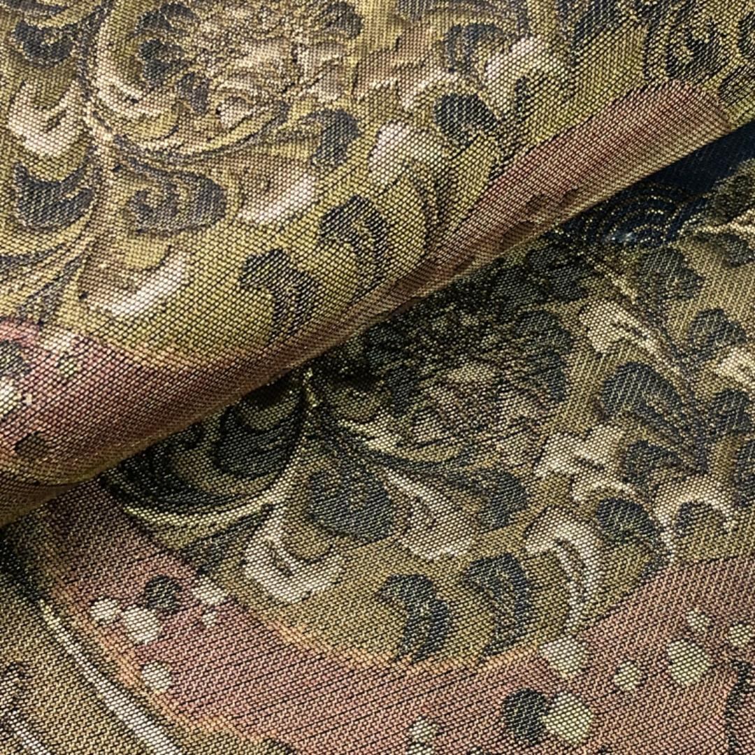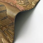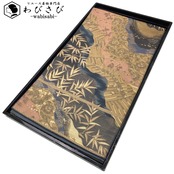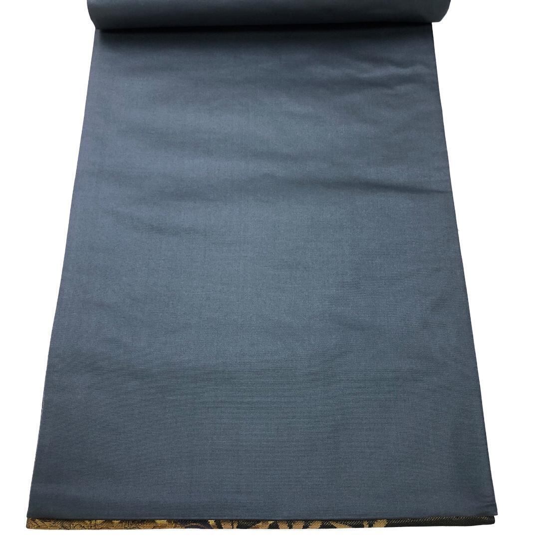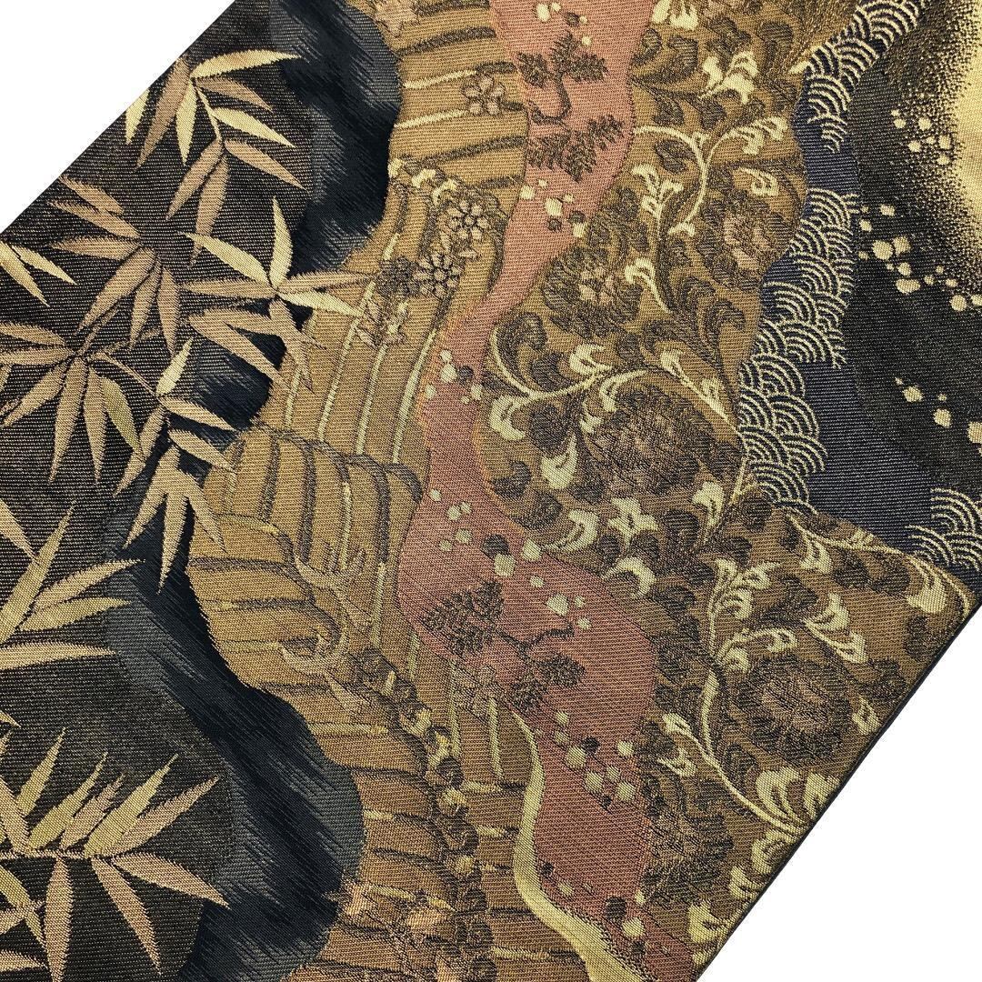 錫紵色ベースのお色味に道長取り、波に花唐草模様、鳥、笹などの柄行がデザインされた素敵なお品でございます。