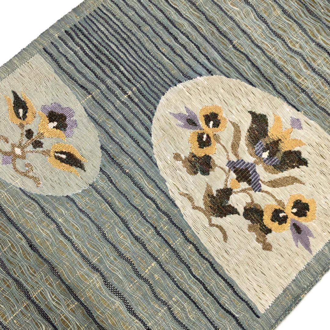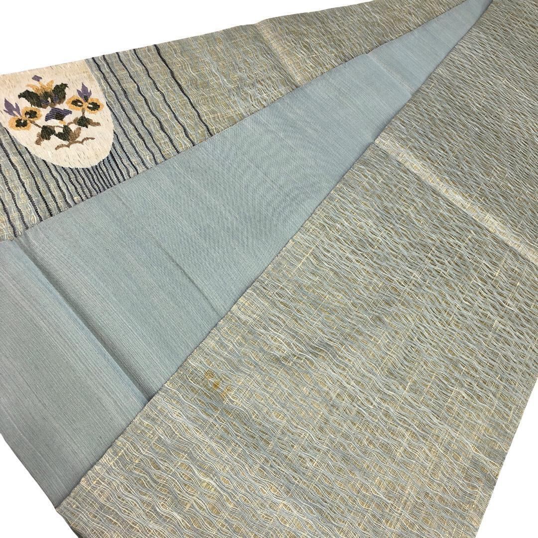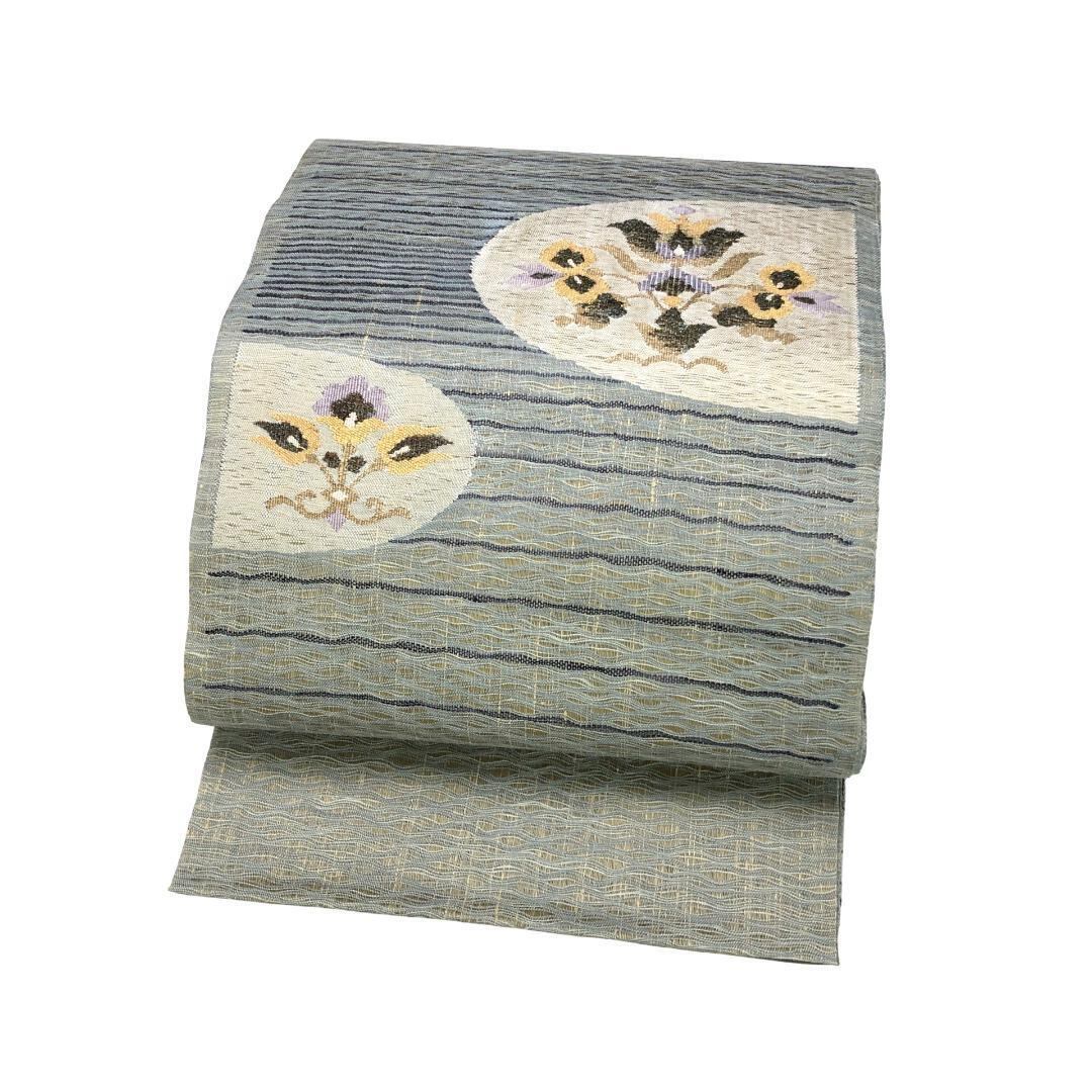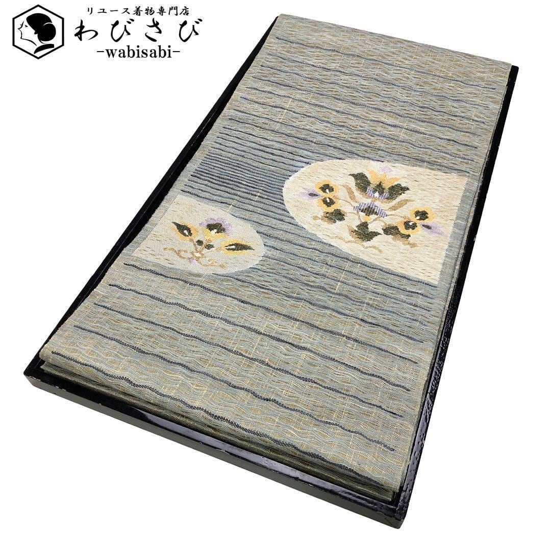 鯖青磁色ベースのお色味、横縞に花柄模様がデザインされた雰囲気の良い素敵な柄裄のお品でございます。