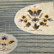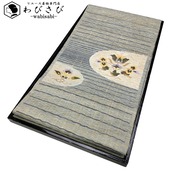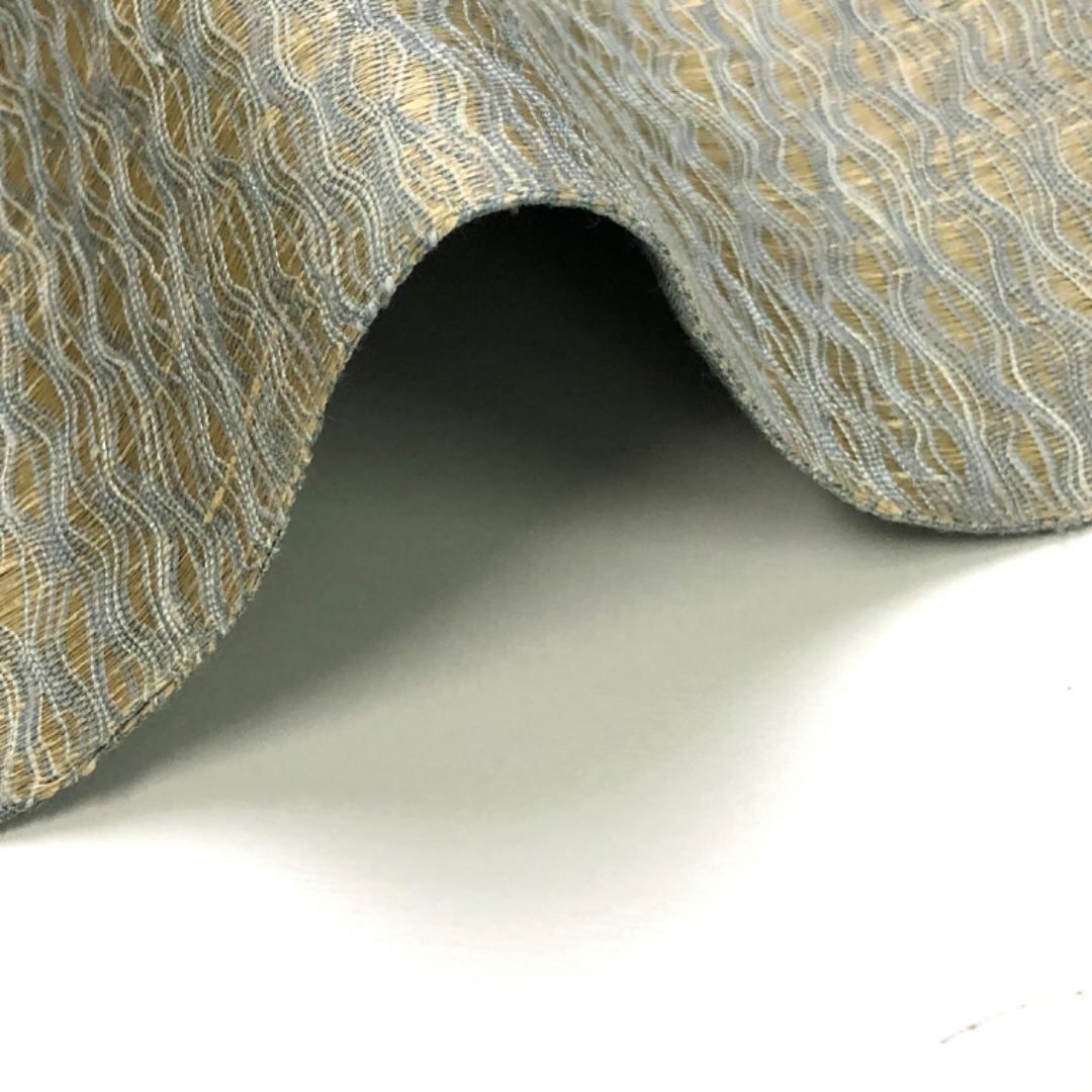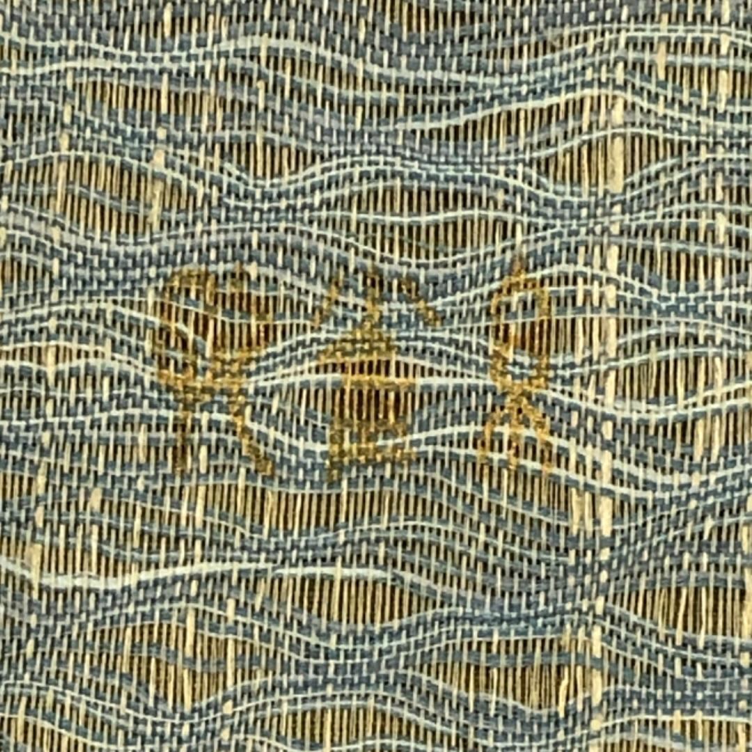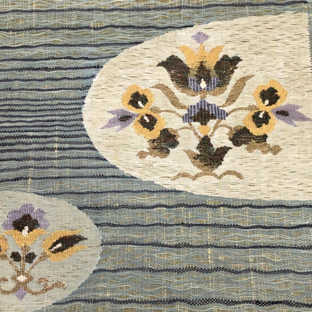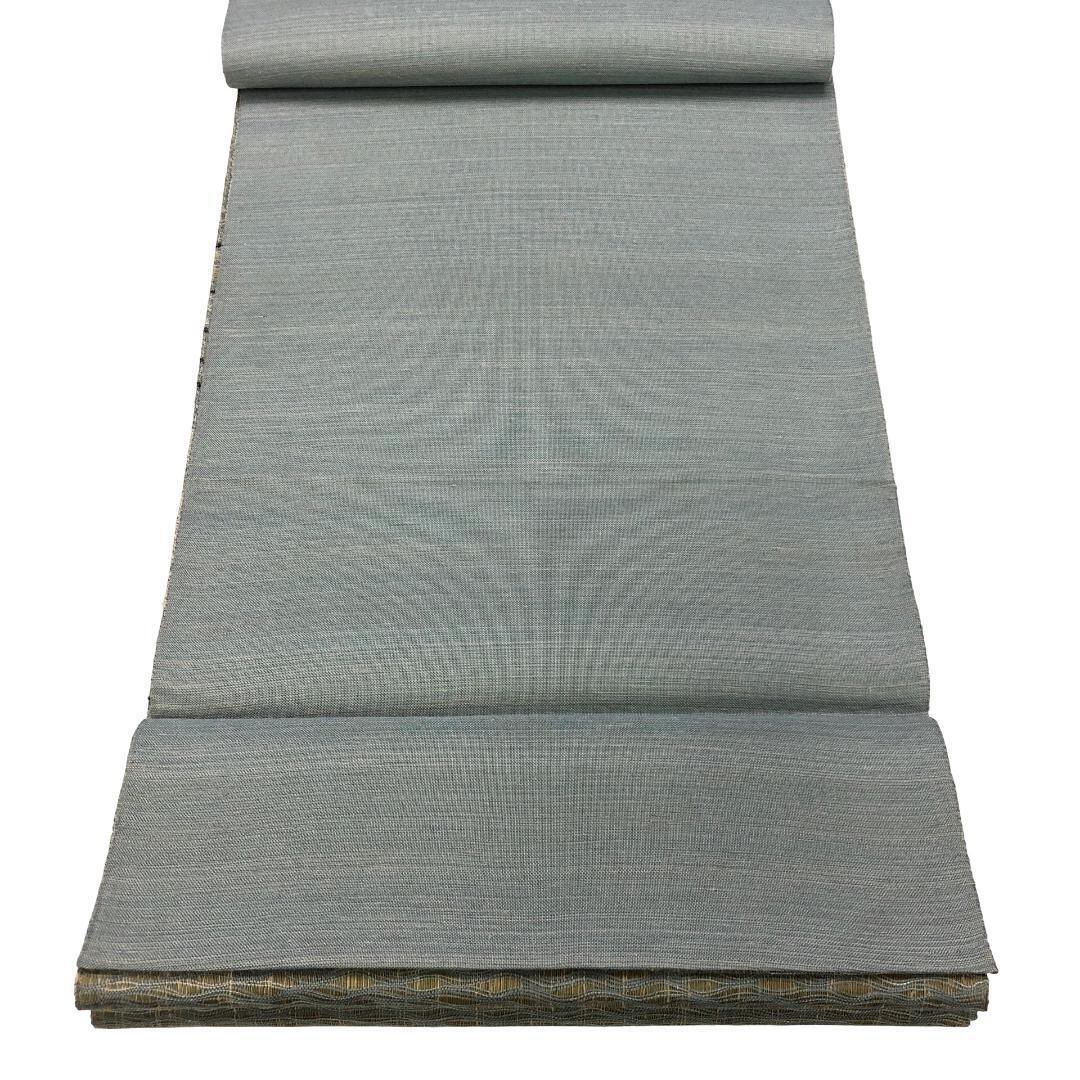 鯖青磁色ベースのお色味、横縞に花柄模様がデザインされた雰囲気の良い素敵な柄裄のお品でございます。