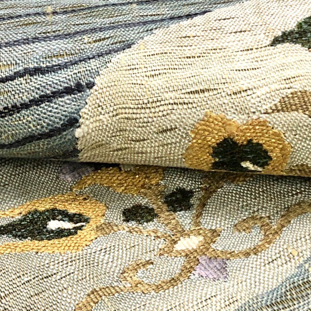 袋帯 すくい織 横縞に花柄模様 金糸 鯖青磁色 O-5692 着物 きもの kimono 和服 和装 中古 リサイクル着物 【送料無料】