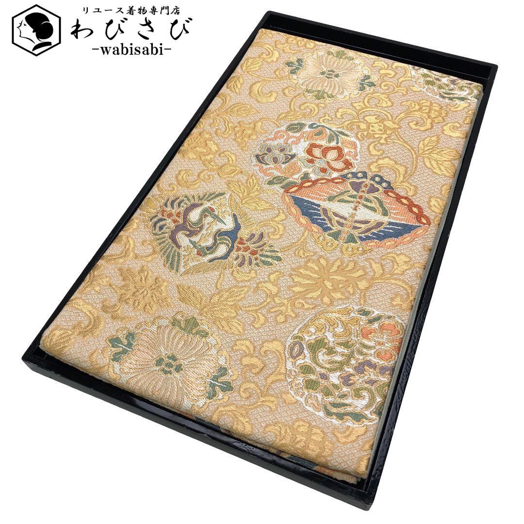 袋帯 向かい鶴 花唐草模様 蝶々 金糸 金色 O-5703 着物 きもの kimono 和服 和装 中古 リサイクル着物 【送料無料】