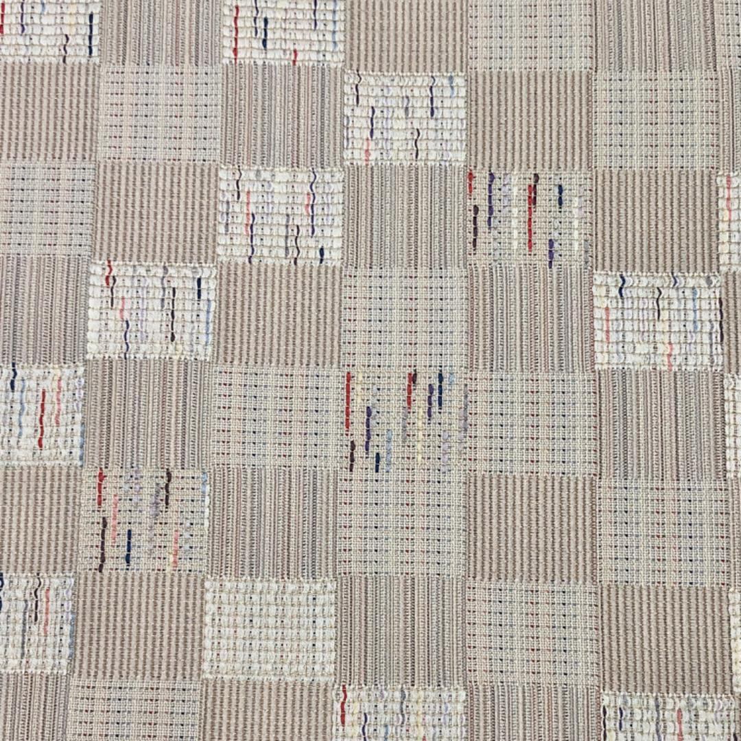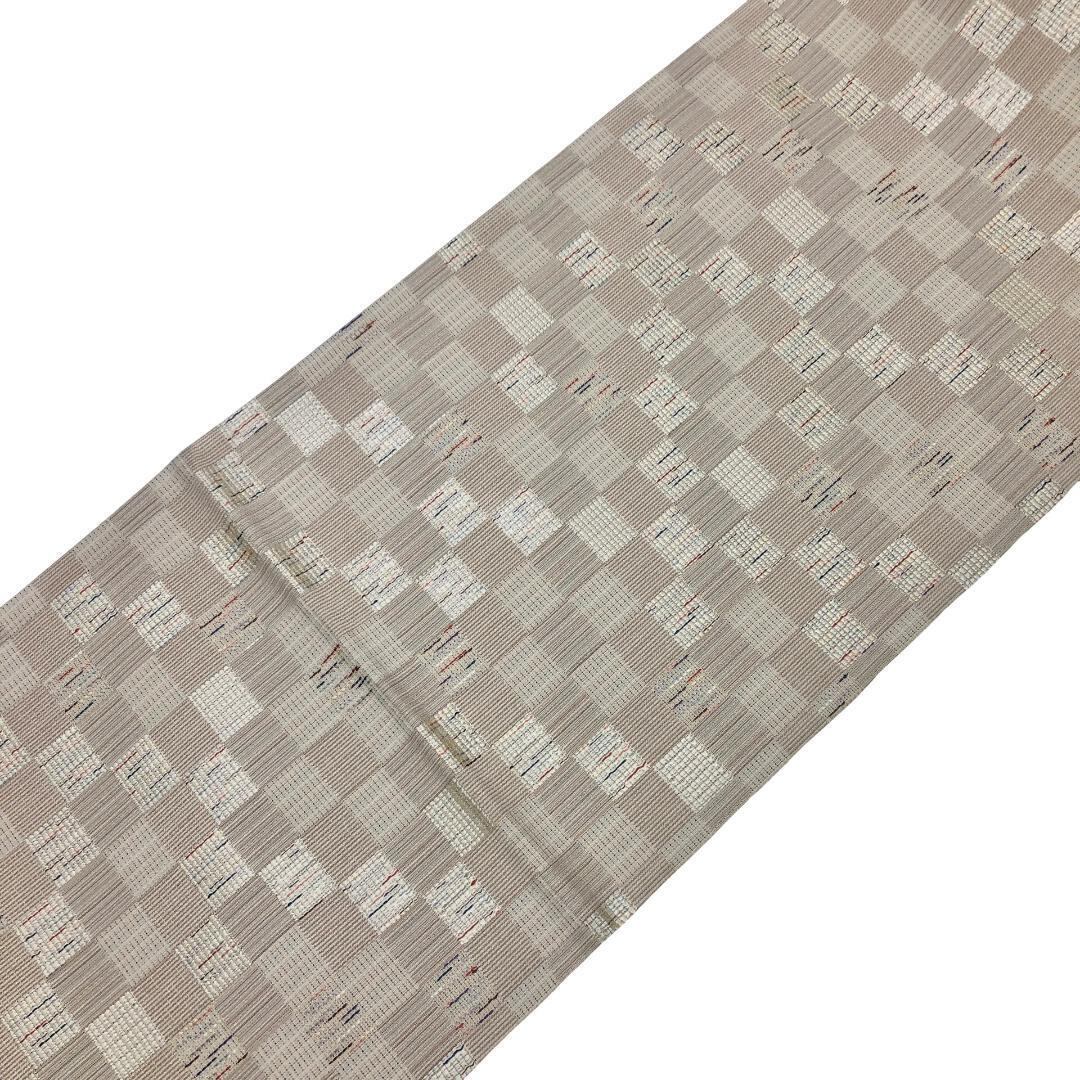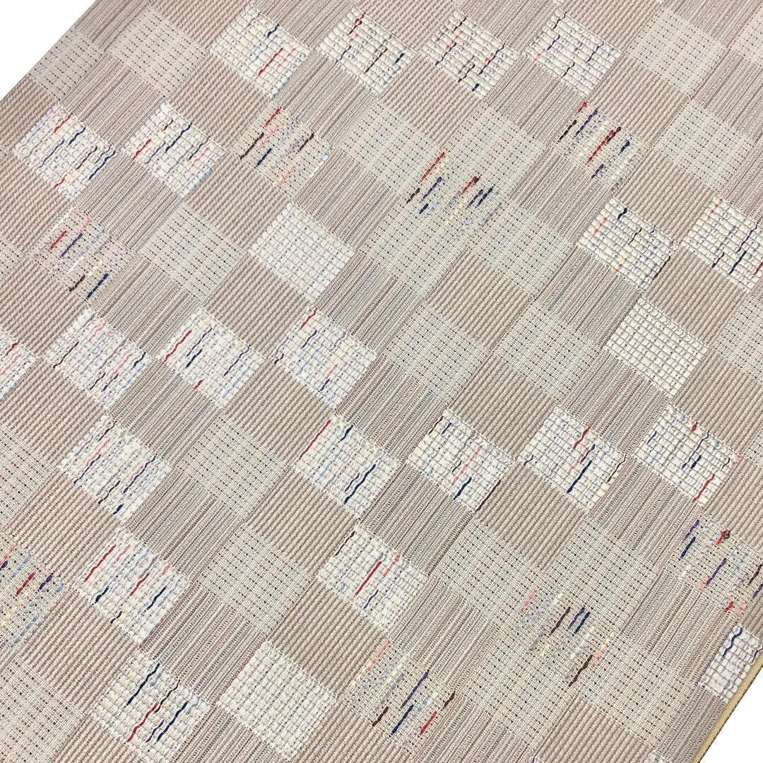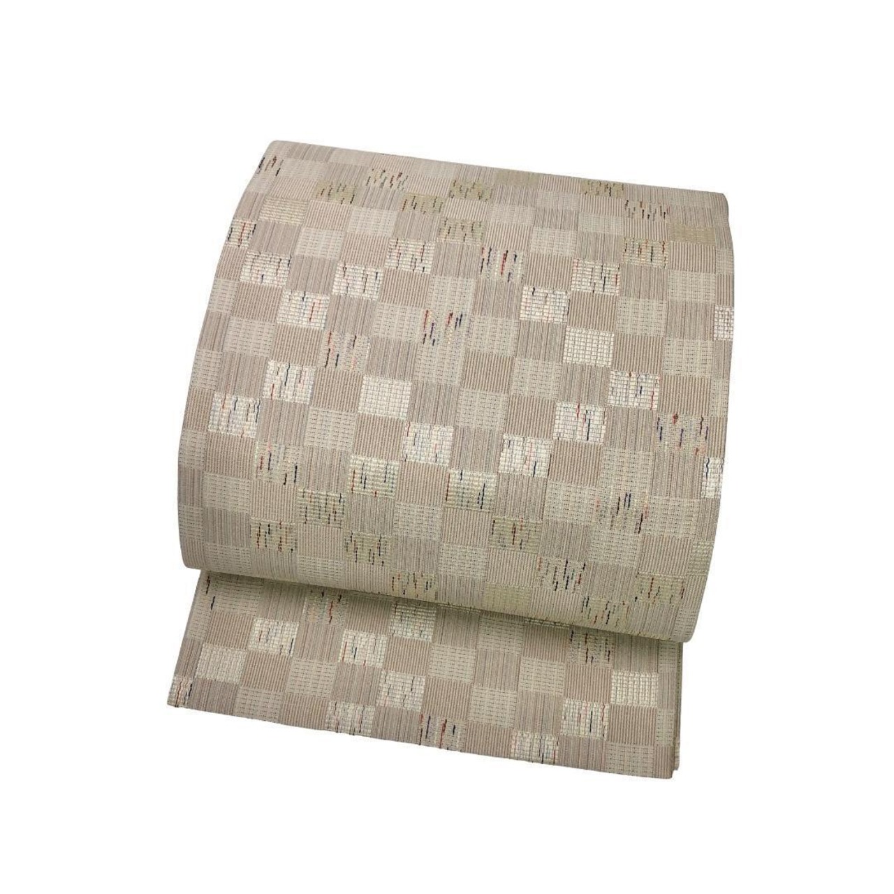 蕎麦切色ベースの自然な風合いのお色味に市松模様、雰囲気の良い織模様がデザインされた素敵なお品でございます。