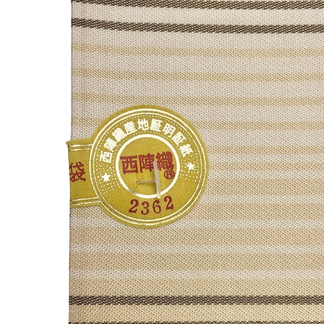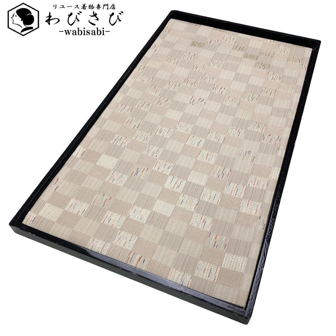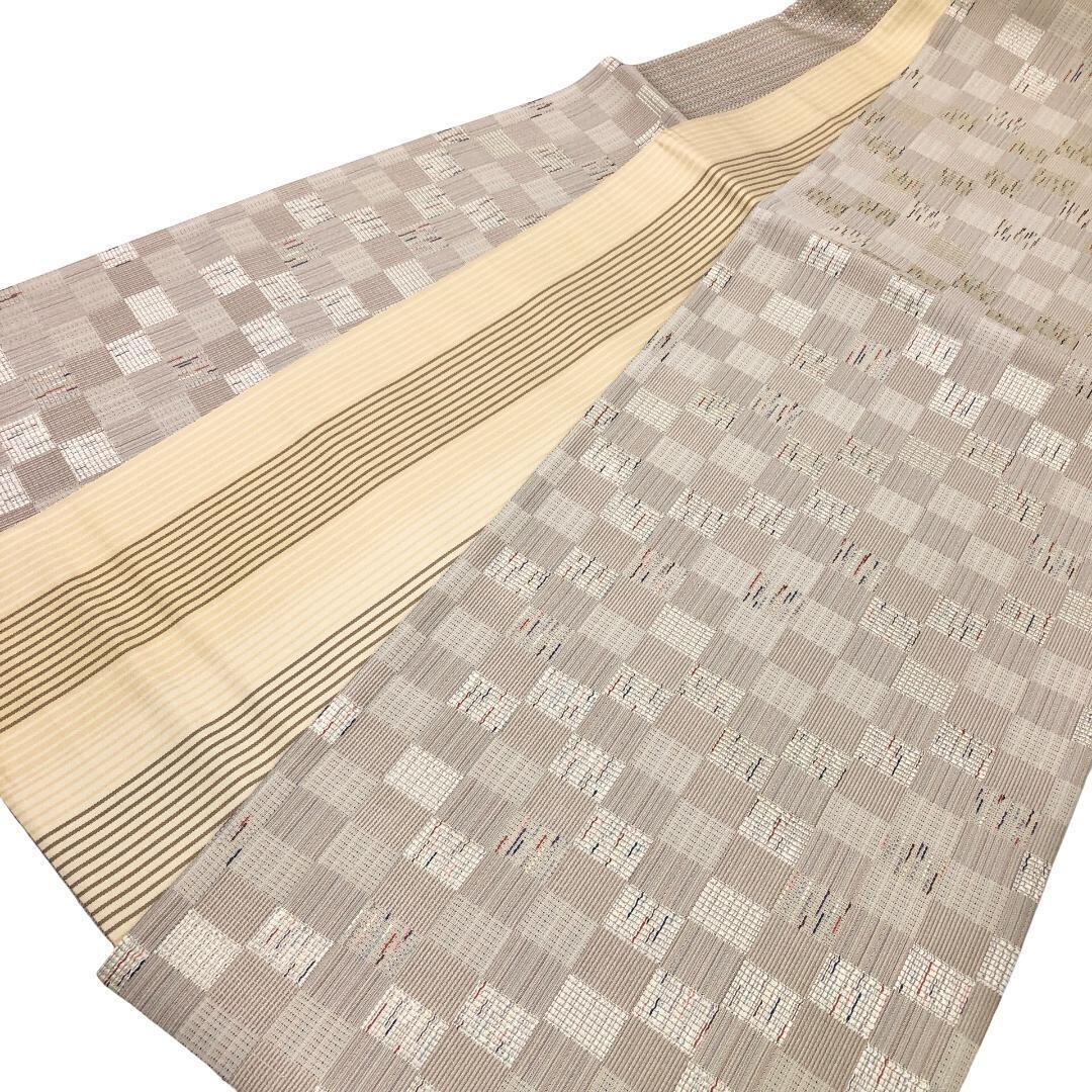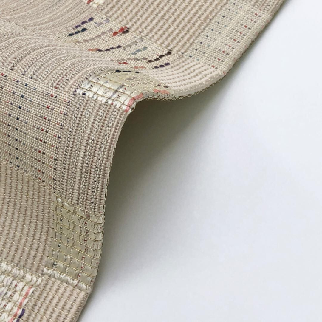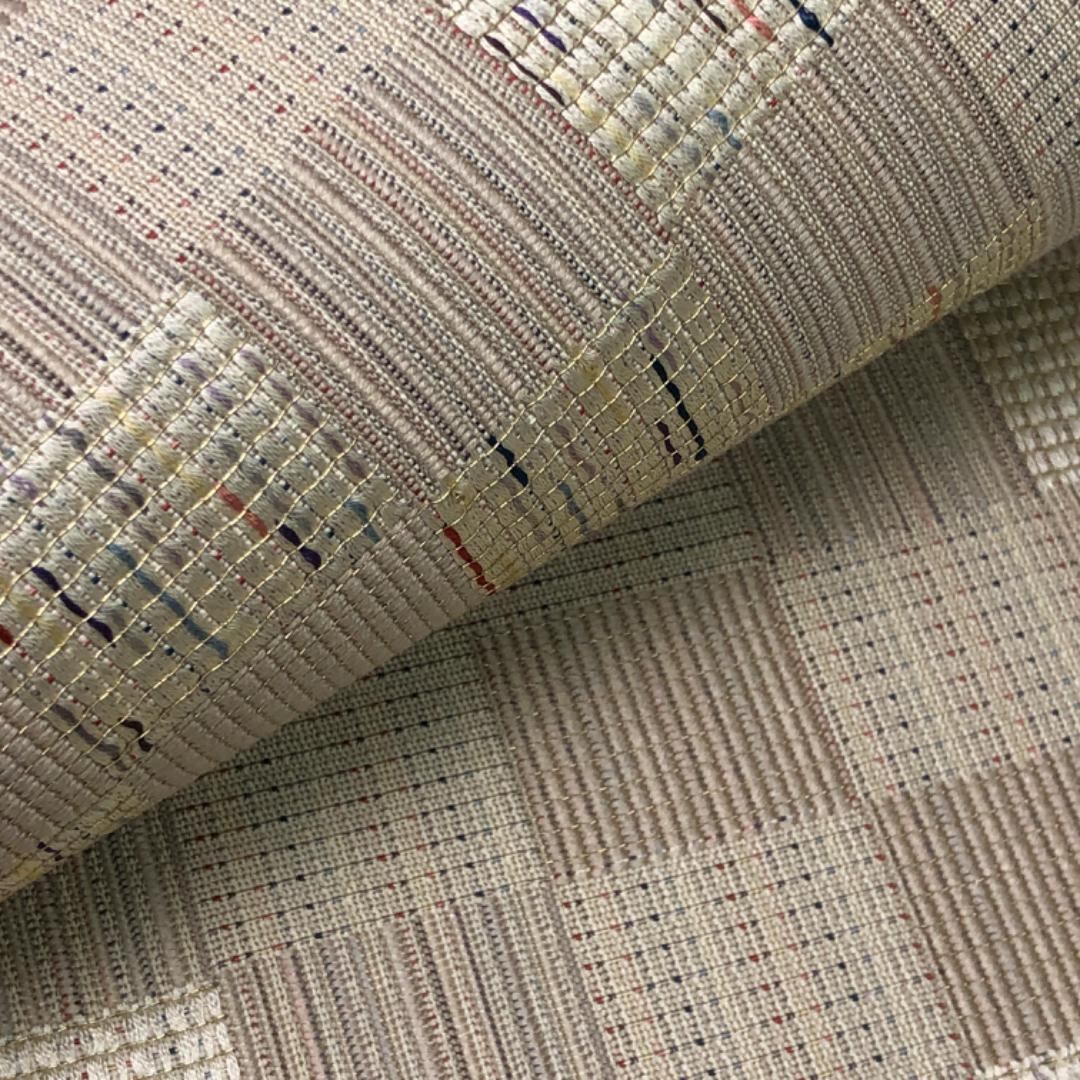 蕎麦切色ベースの自然な風合いのお色味に市松模様、雰囲気の良い織模様がデザインされた素敵なお品でございます。