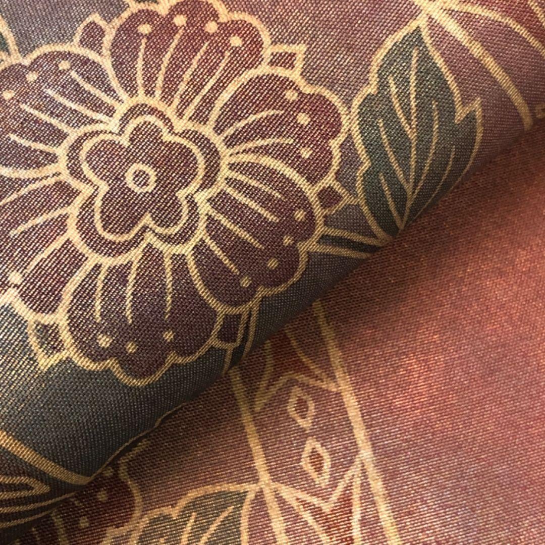 蘇芳色ベースのお色味に縦柄花唐草模様の柄裄がデザインされた雰囲気の良い素敵なお品でございます。