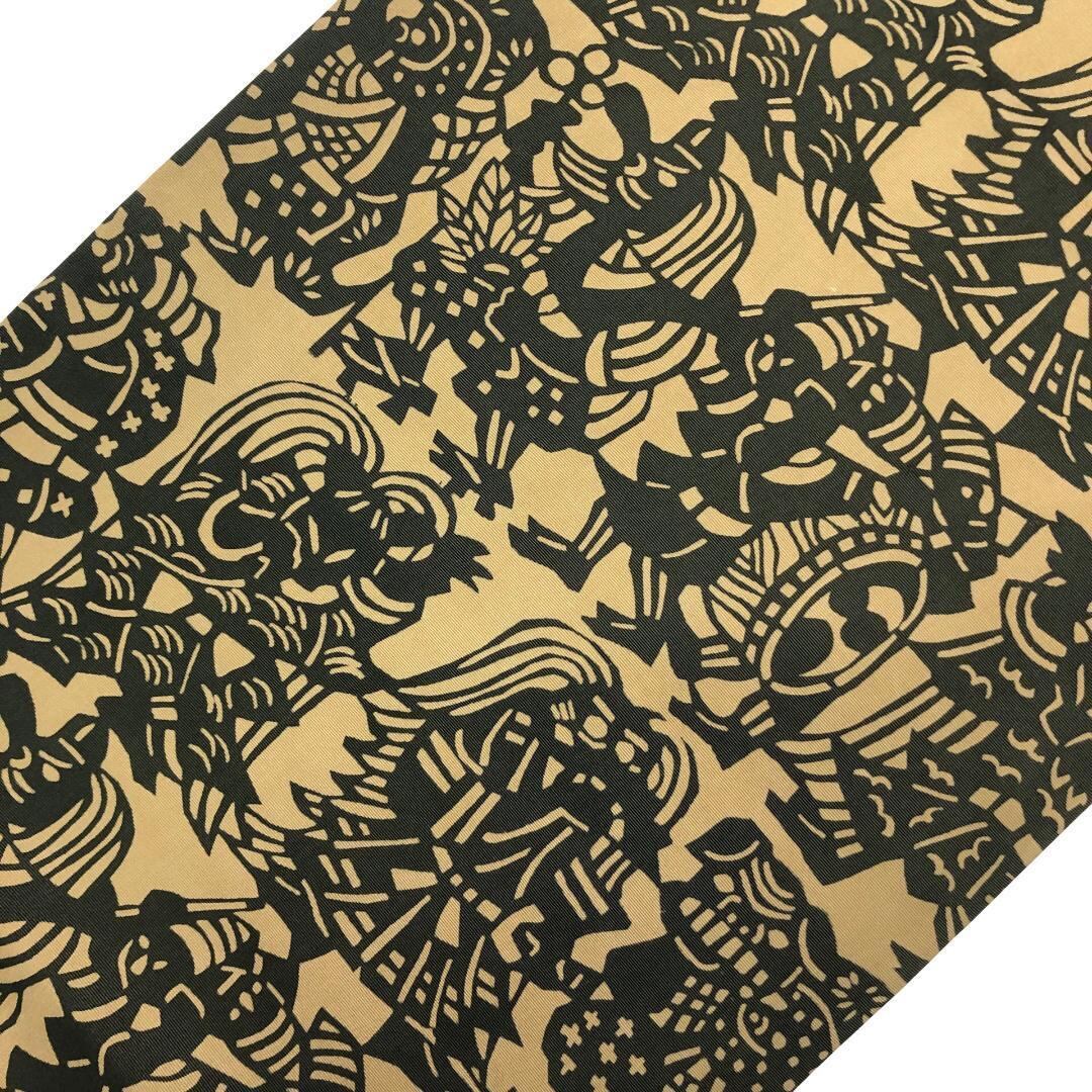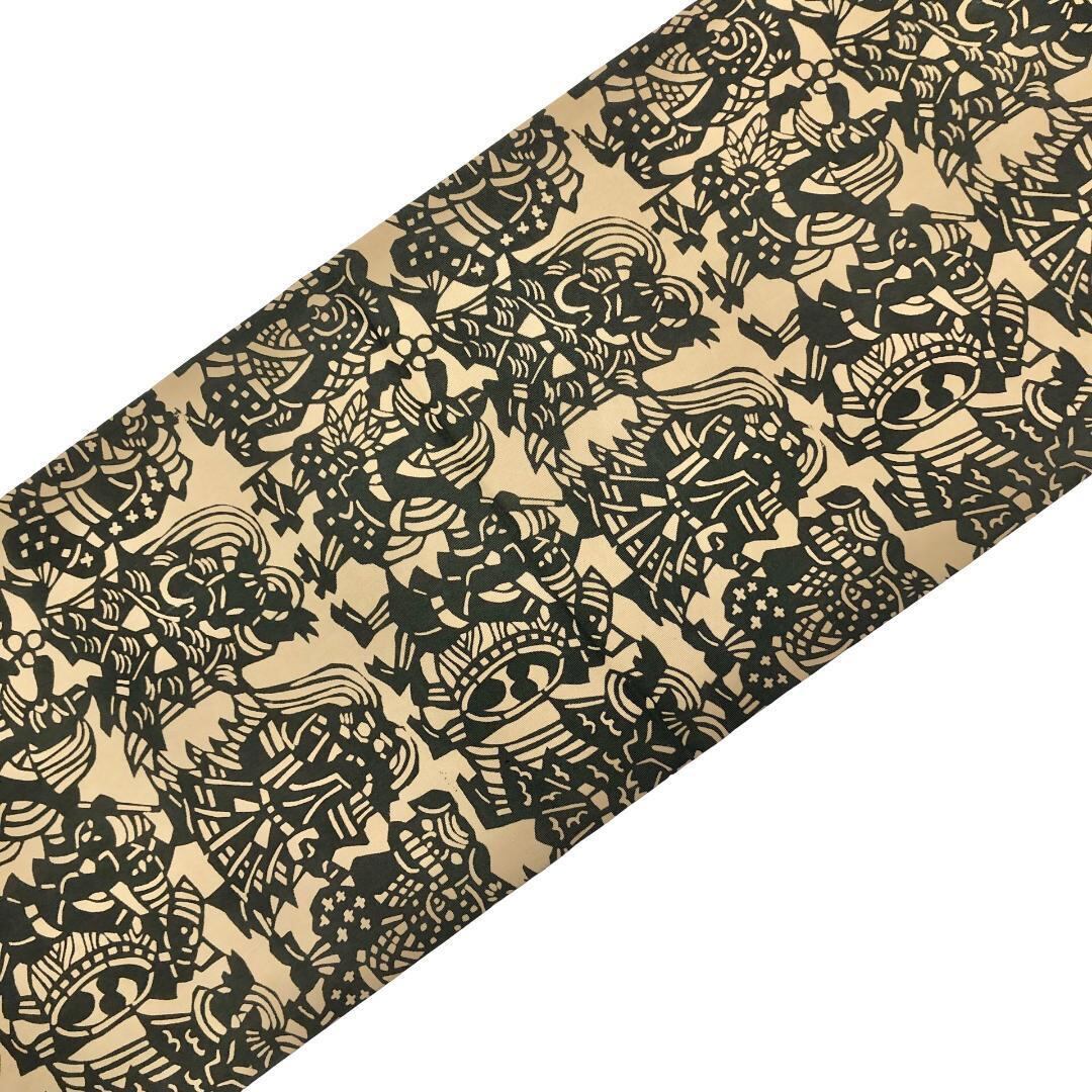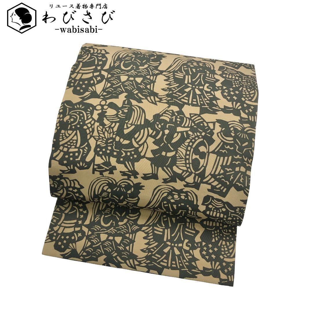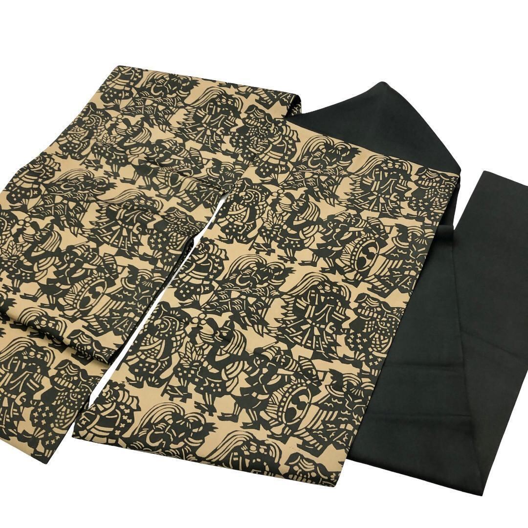 枯野色のお色味に天狗、獅子舞などの型染の柄裄がデザインされた雰囲気の良い素敵なお品でございます。