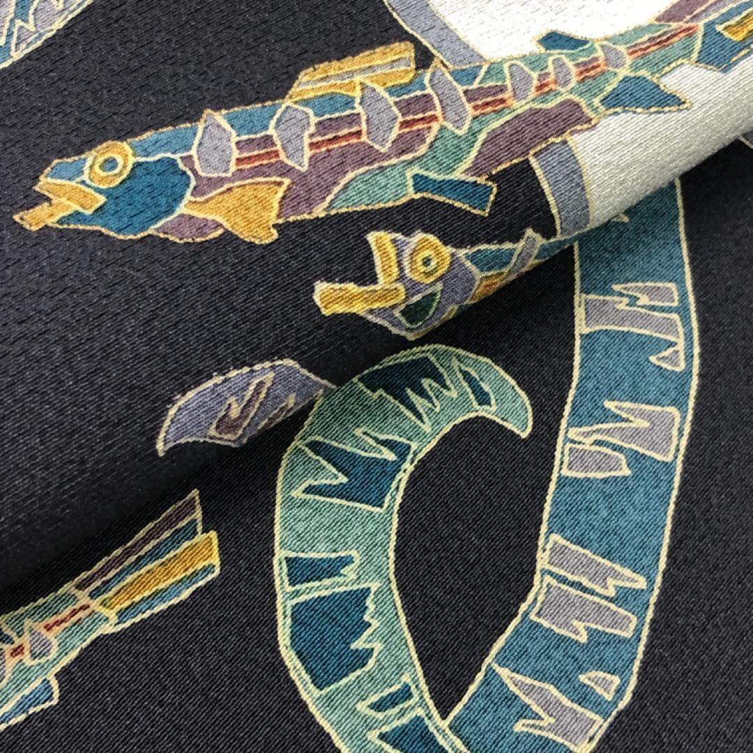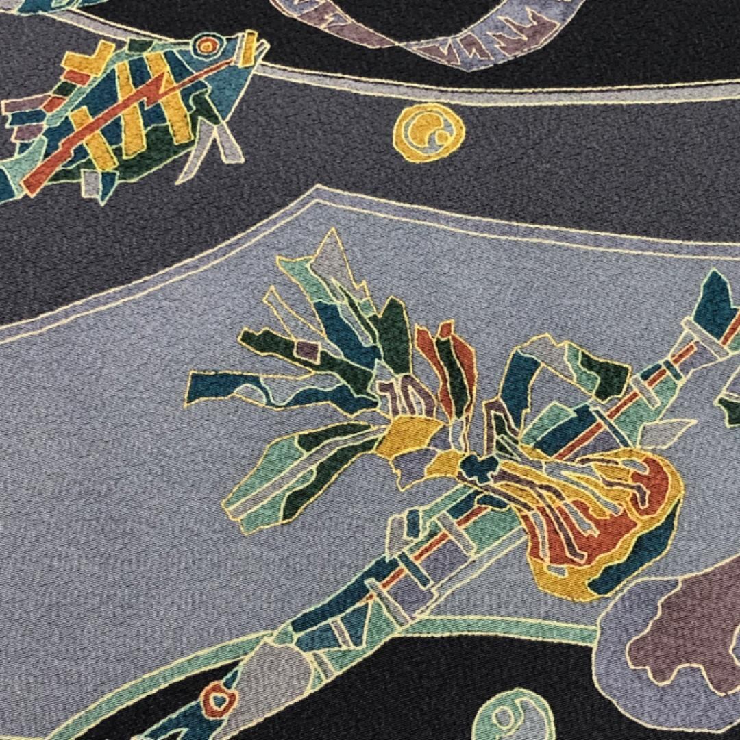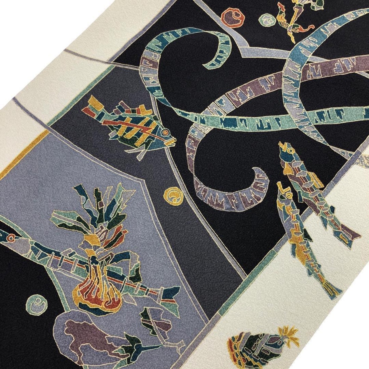 利休鼠色ベースのお色味の柔らか目の縮緬地に魚、野菜などの抽象柄がデザインされた雰囲気の良い素敵なお品でございます。
