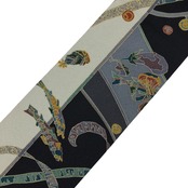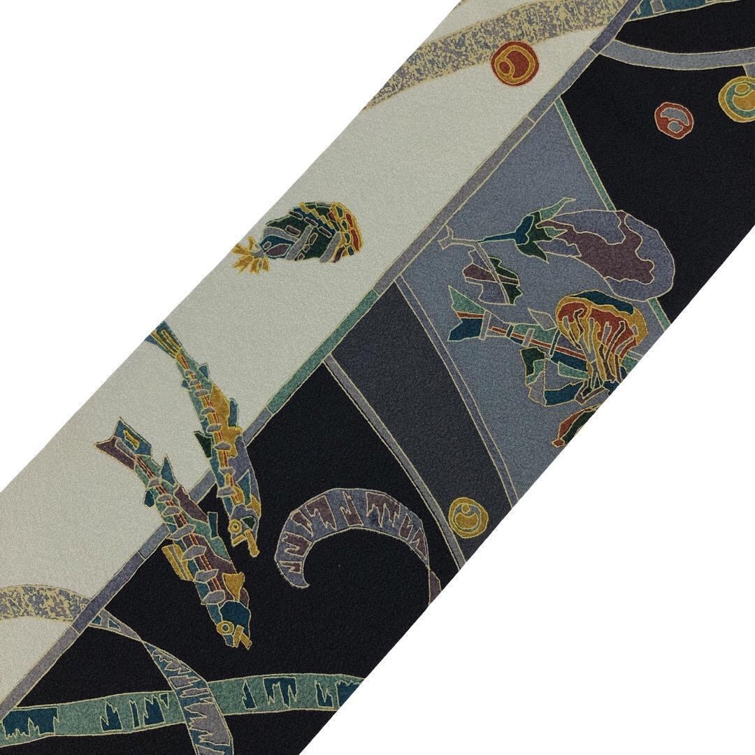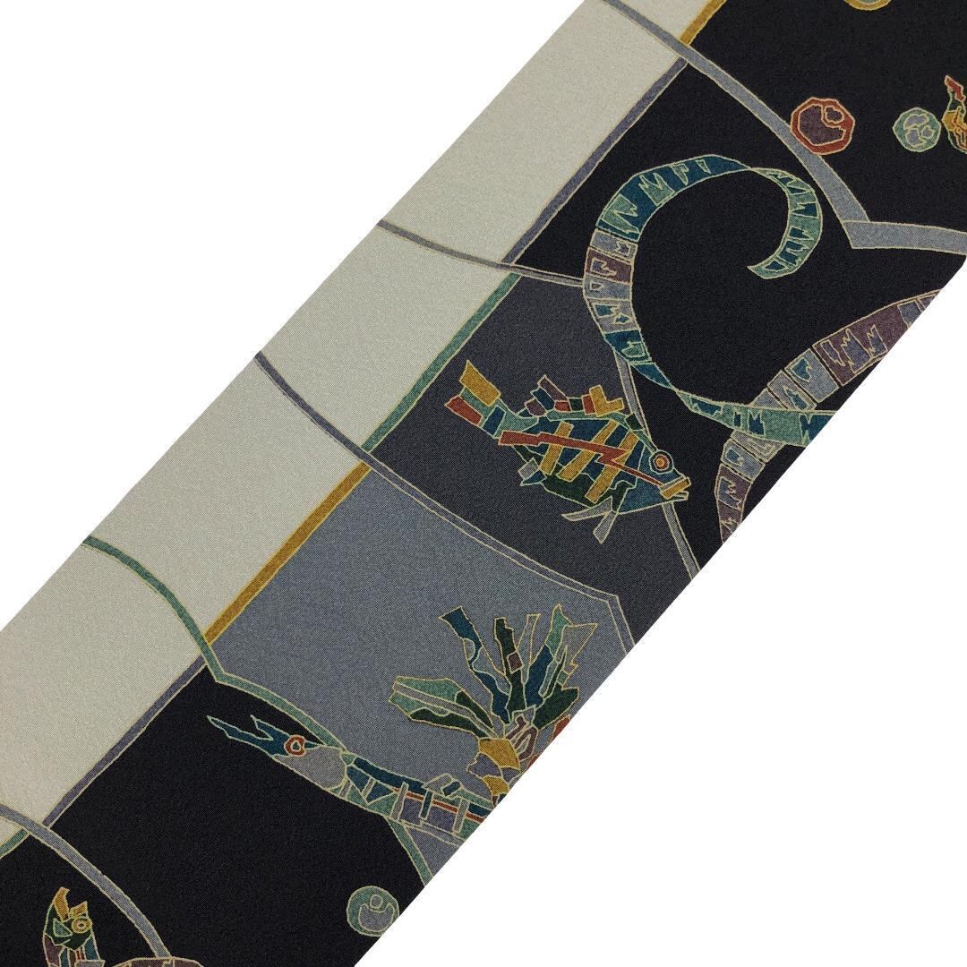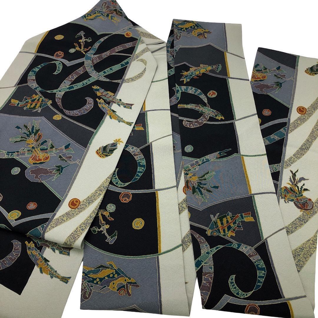 利休鼠色ベースのお色味の柔らか目の縮緬地に魚、野菜などの抽象柄がデザインされた雰囲気の良い素敵なお品でございます。