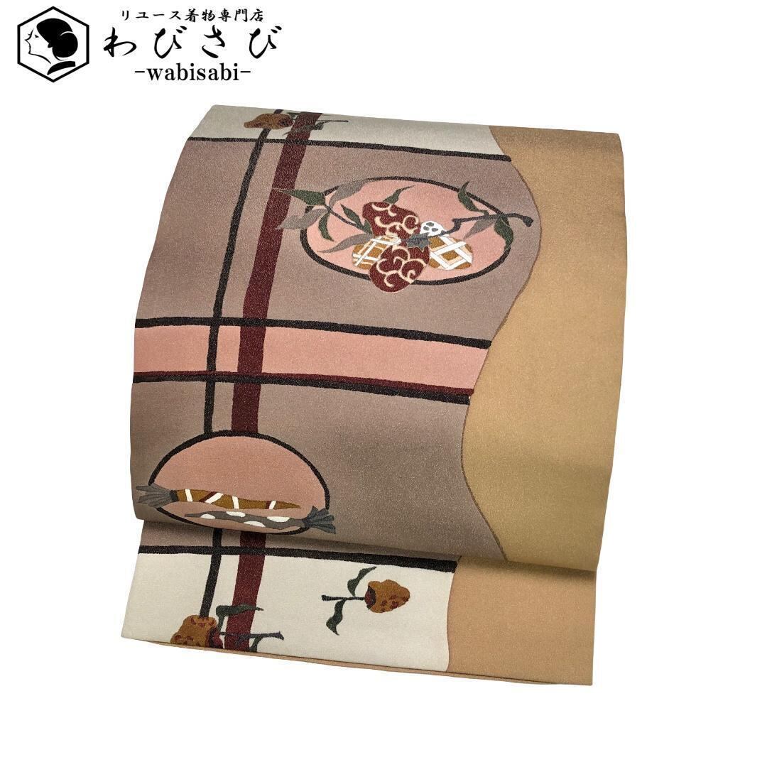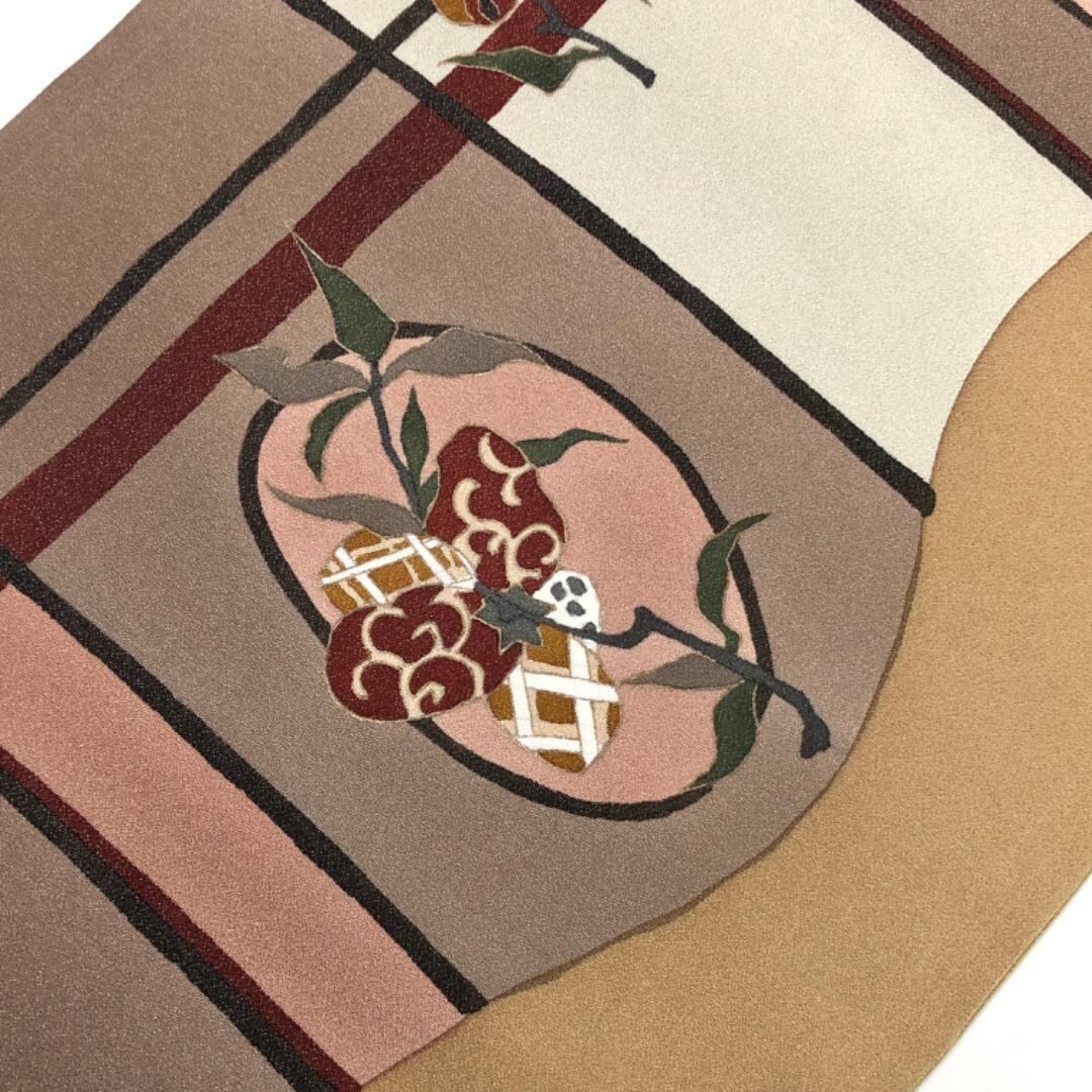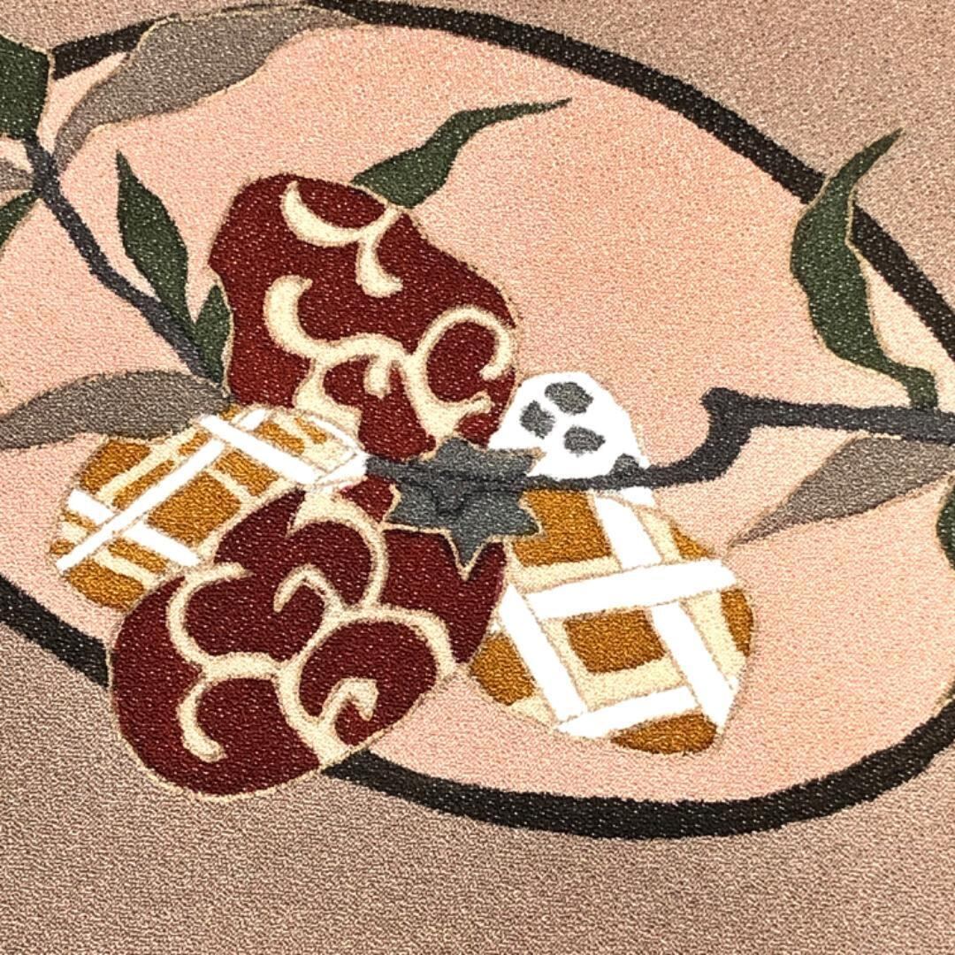 淡朽葉色ベースのお色味、抽象果実柄、魚などの柄行がデザインされた雰囲気の良い素敵なお品でございます。