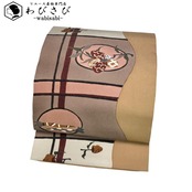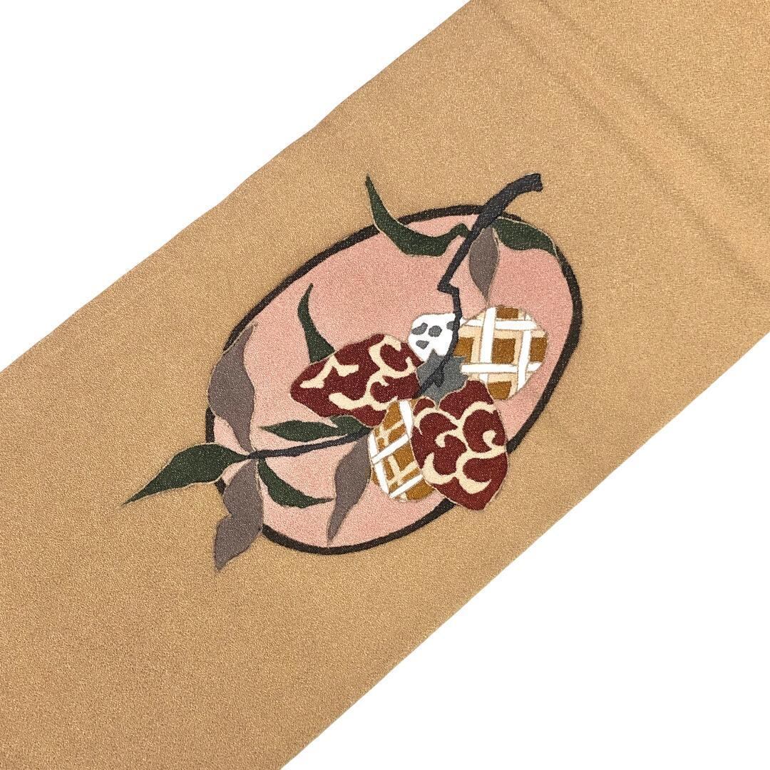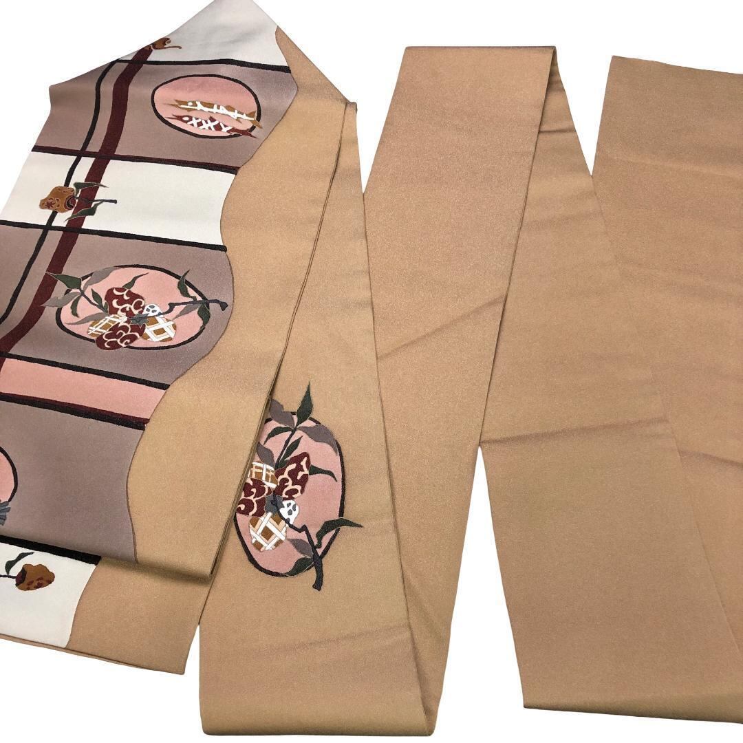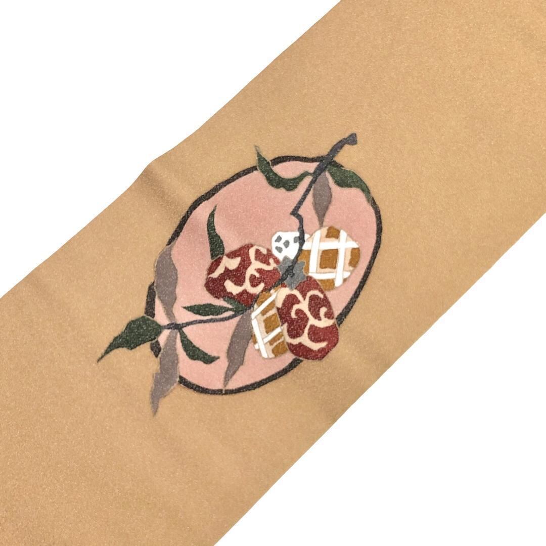 淡朽葉色ベースのお色味、抽象果実柄、魚などの柄行がデザインされた雰囲気の良い素敵なお品でございます。