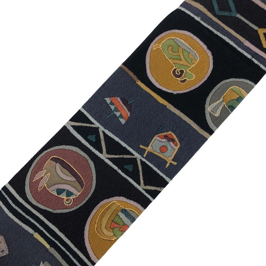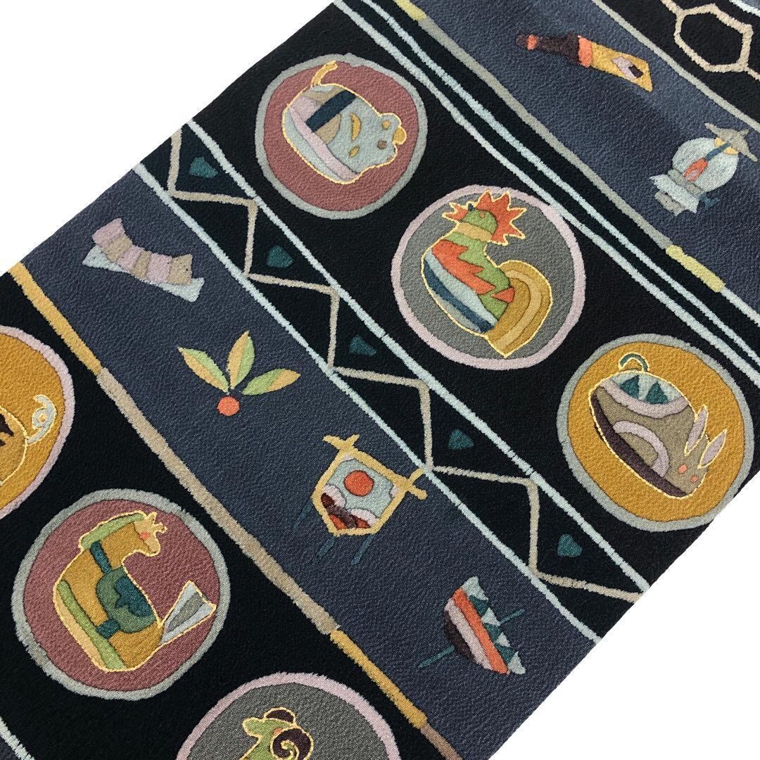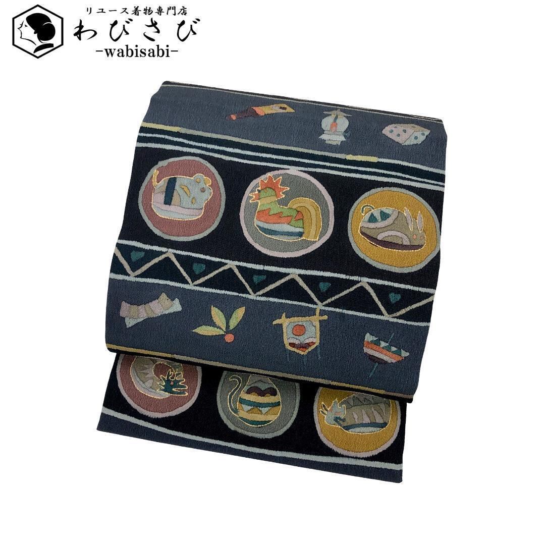 名古屋帯 抽象干支柄 羽子板 兜 こっぽり 青褐色 縮緬 O-5700 着物 きもの kimono 和服 和装 中古 リサイクル着物 【送料無料】