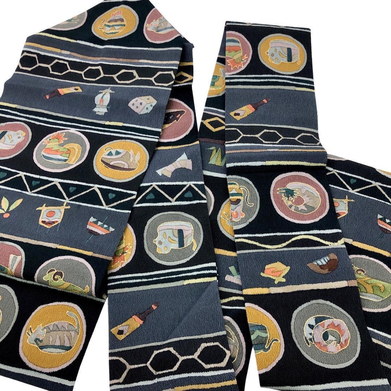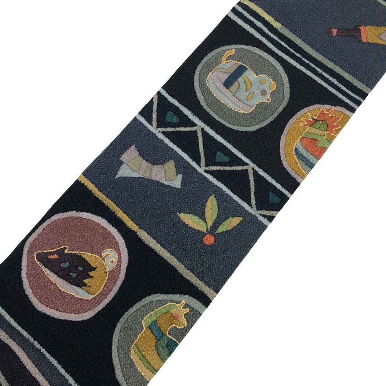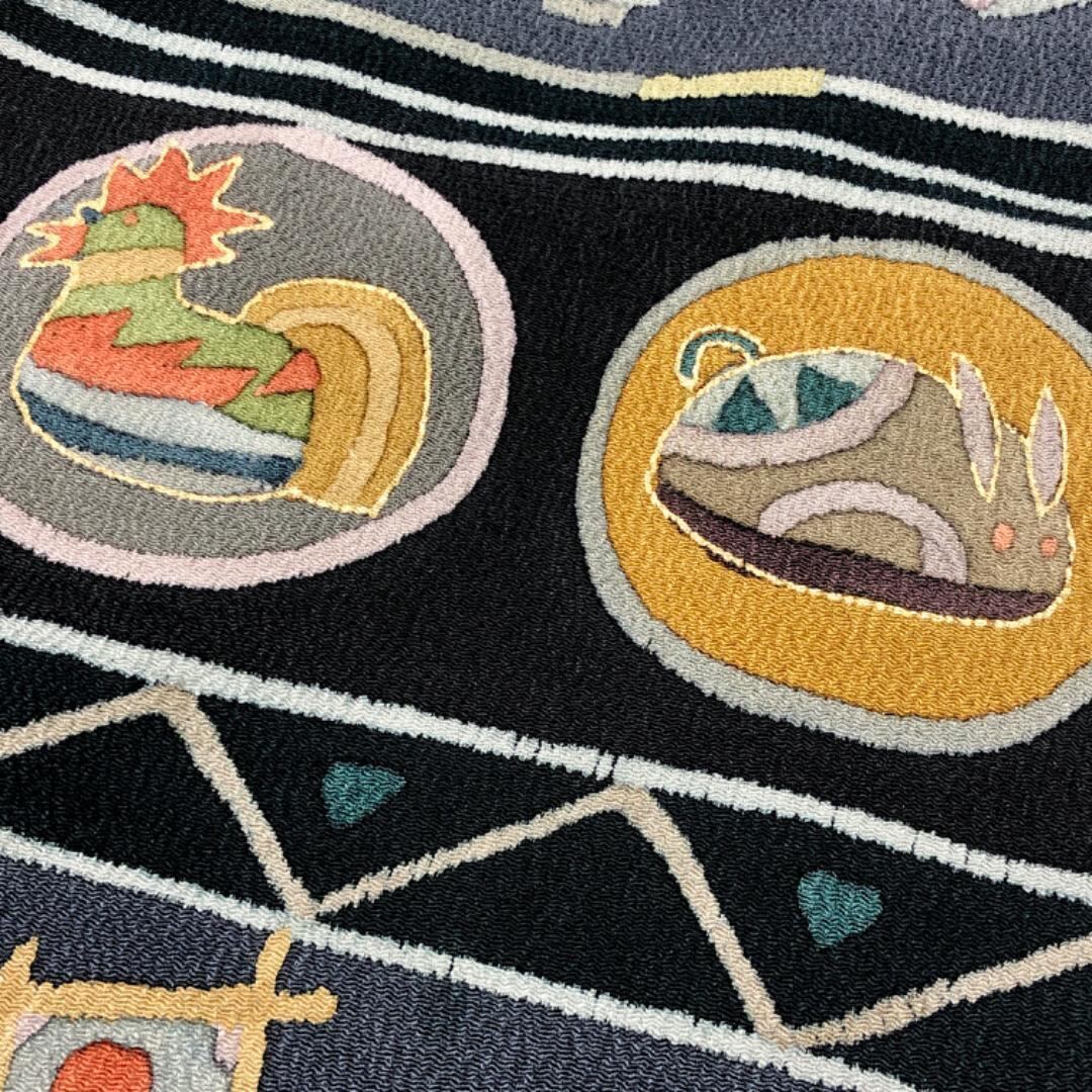 名古屋帯 抽象干支柄 羽子板 兜 こっぽり 青褐色 縮緬 O-5700 着物 きもの kimono 和服 和装 中古 リサイクル着物 【送料無料】