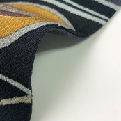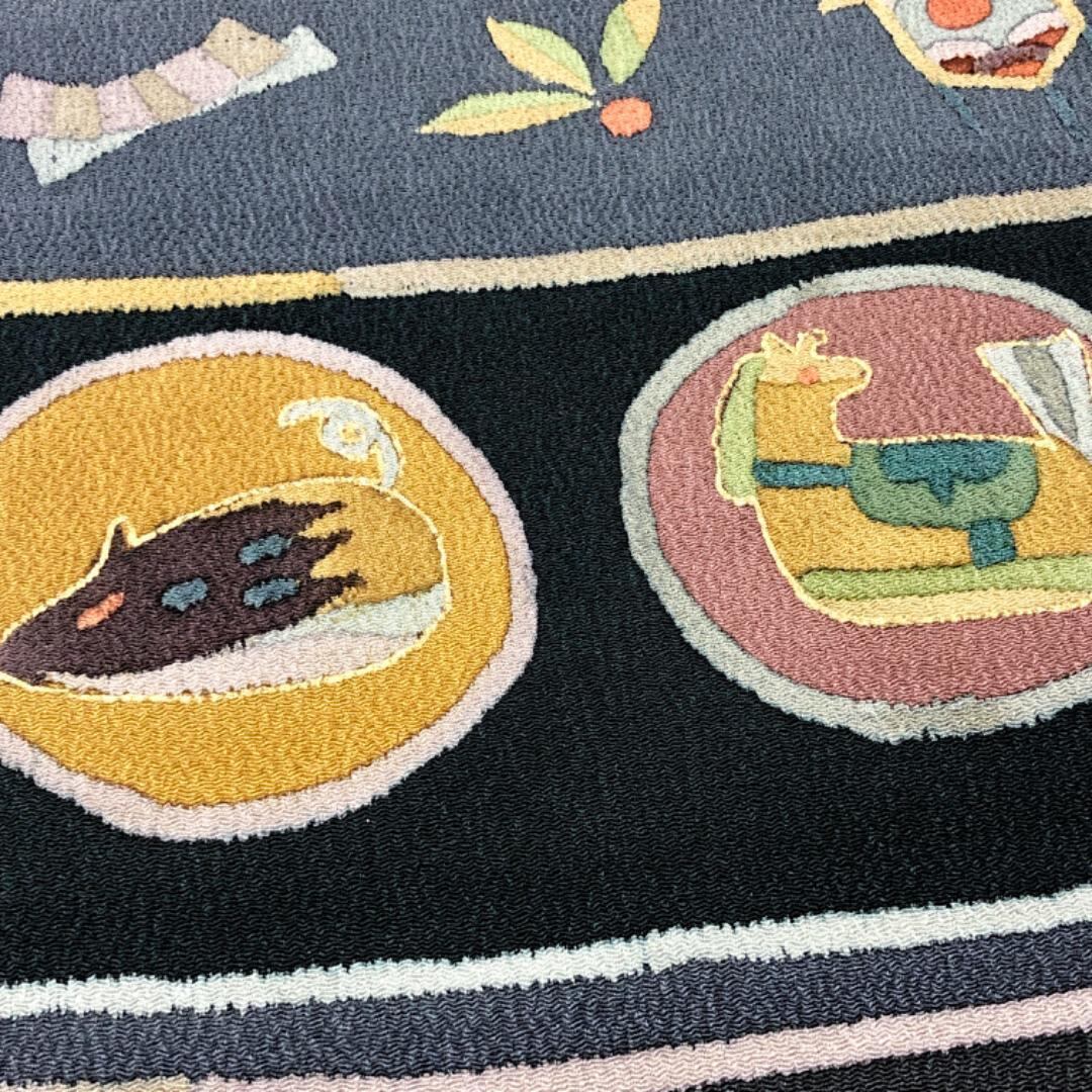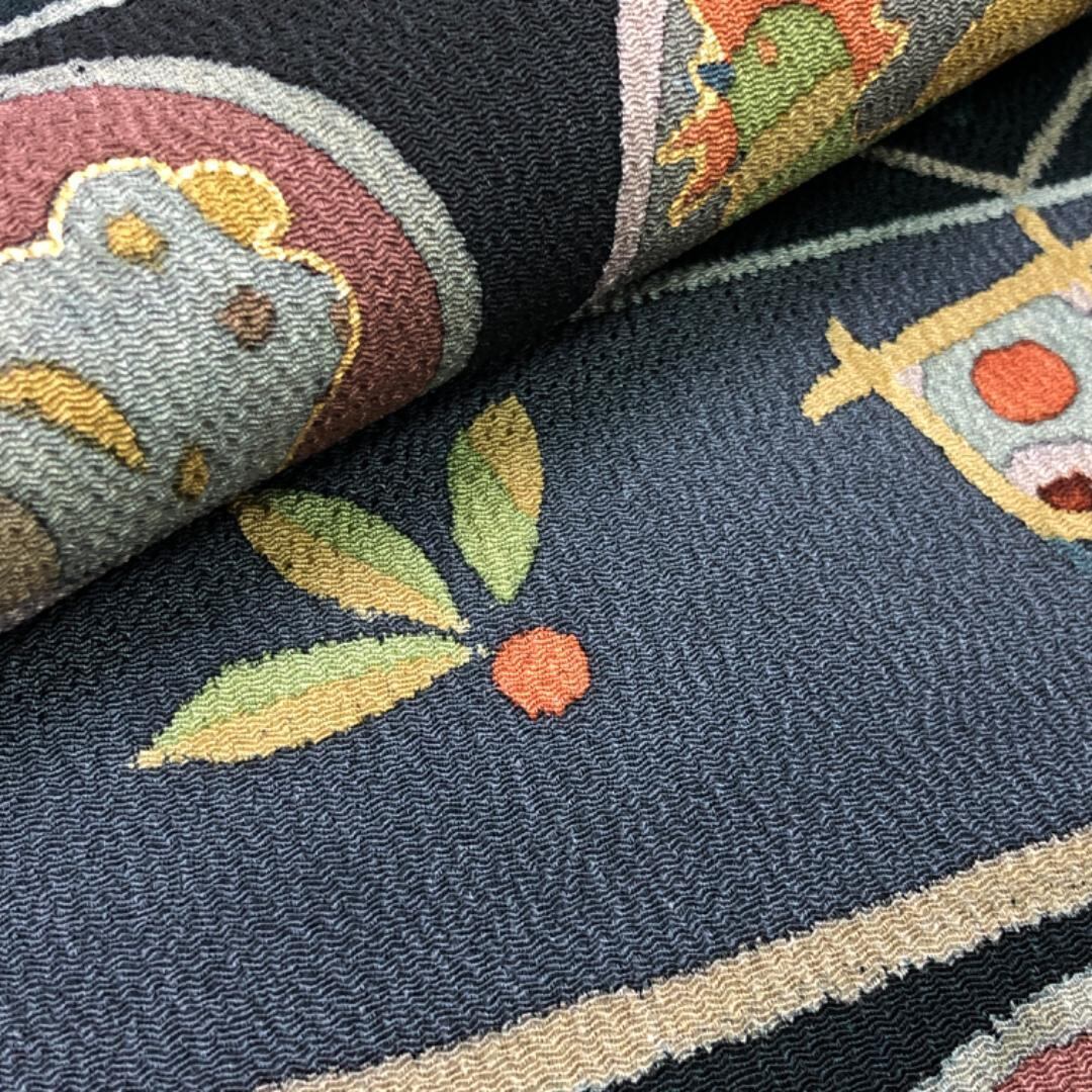 青褐色ベースのお色味の縮緬地に抽象干支柄、羽子板、兜、こっぽりなどの雰囲気の良い柄裄がデザインされた素敵なお品でございます。