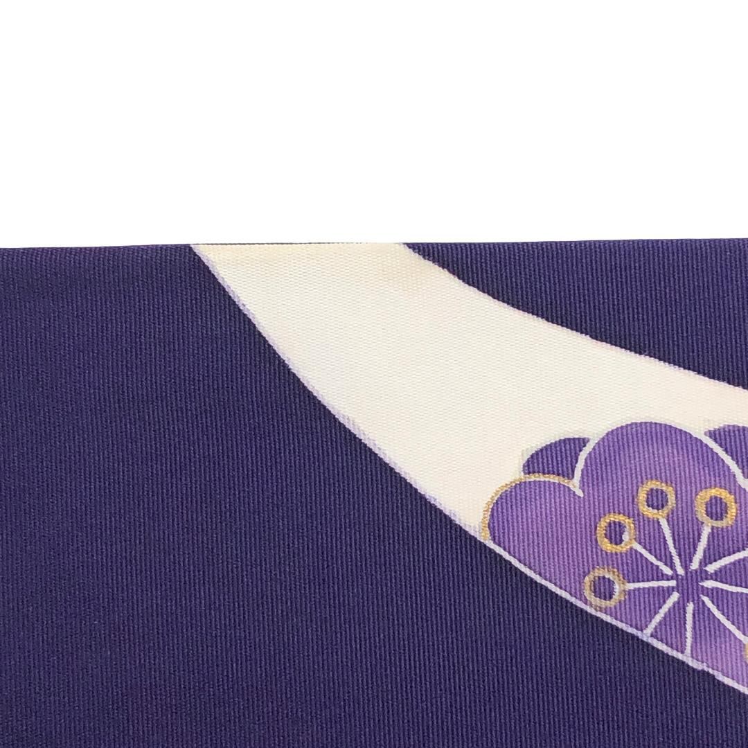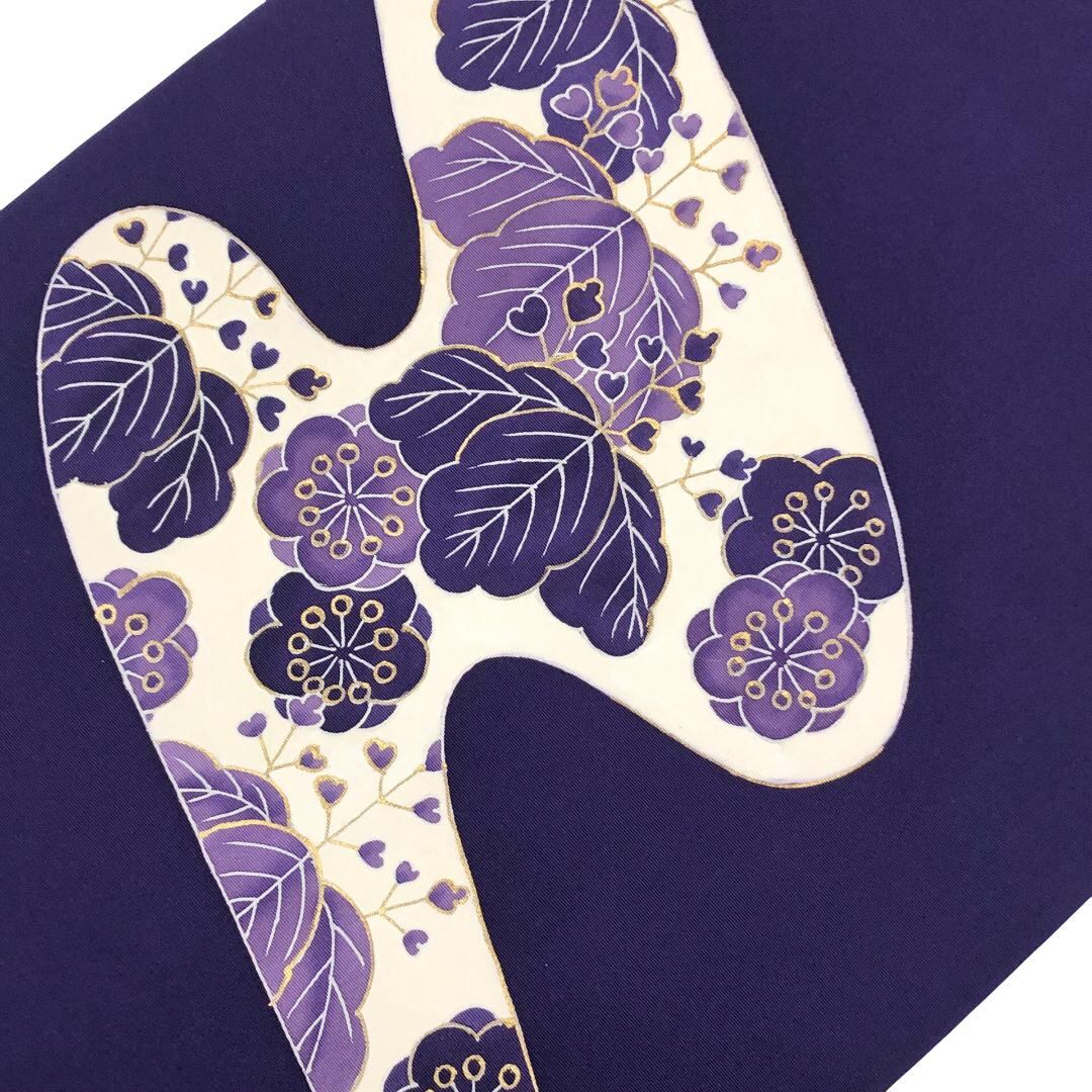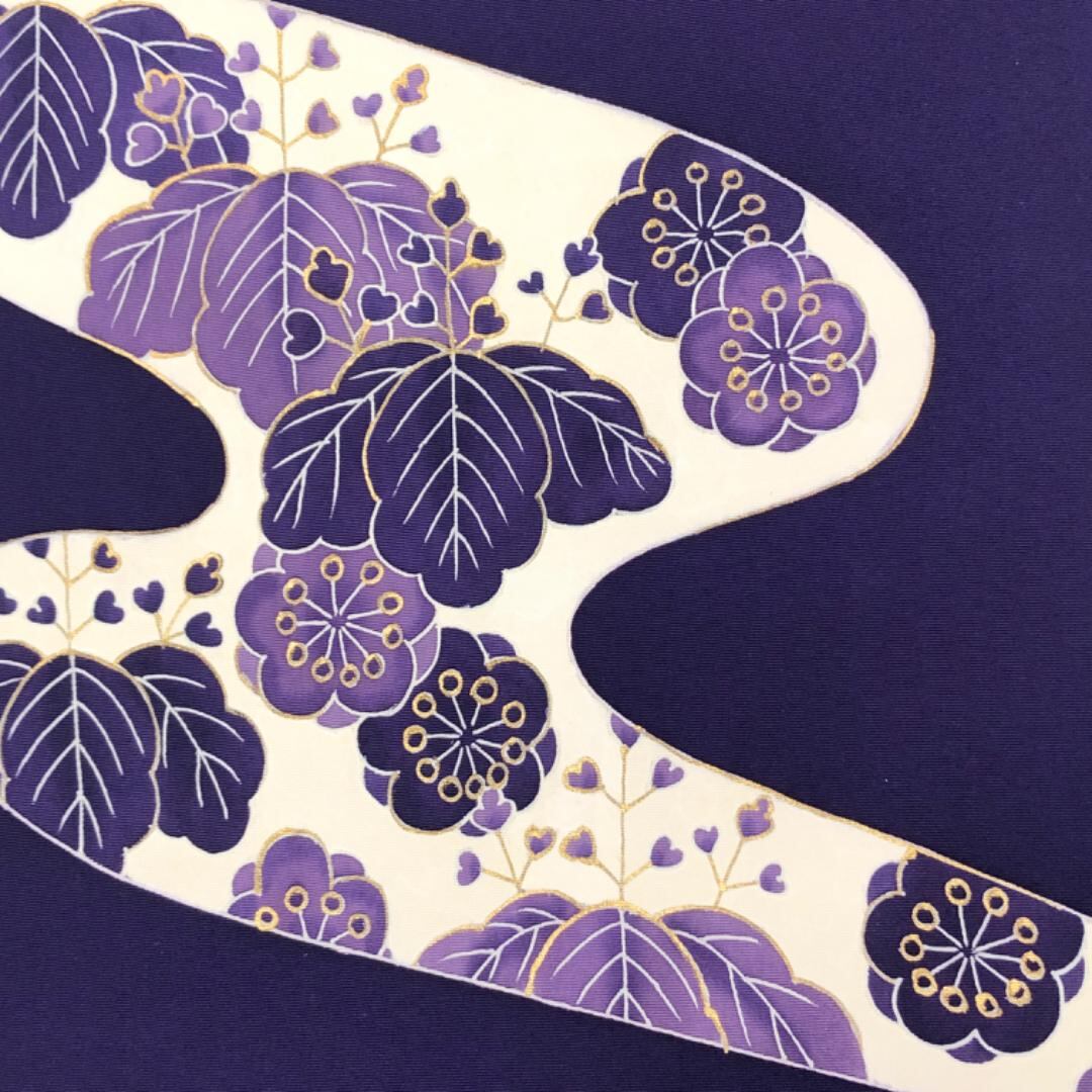 紫色のお色味に染柄の桐、梅の花模様がデザインされた素敵なお品でございます。