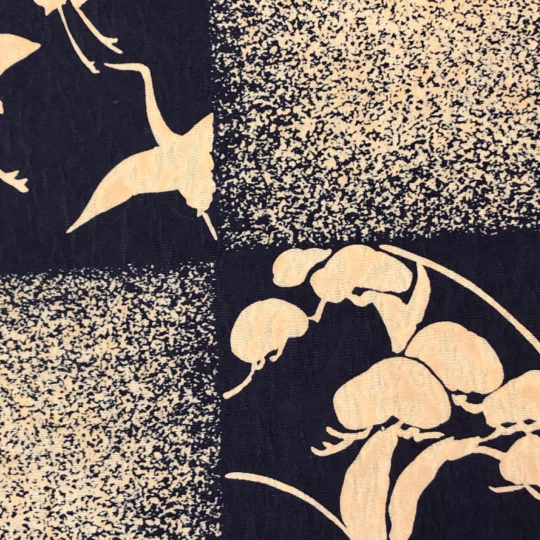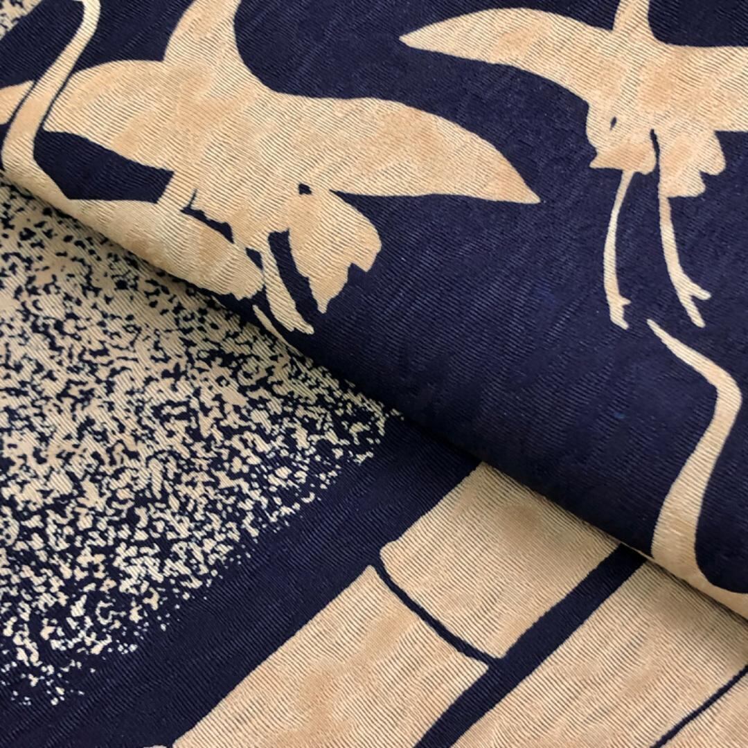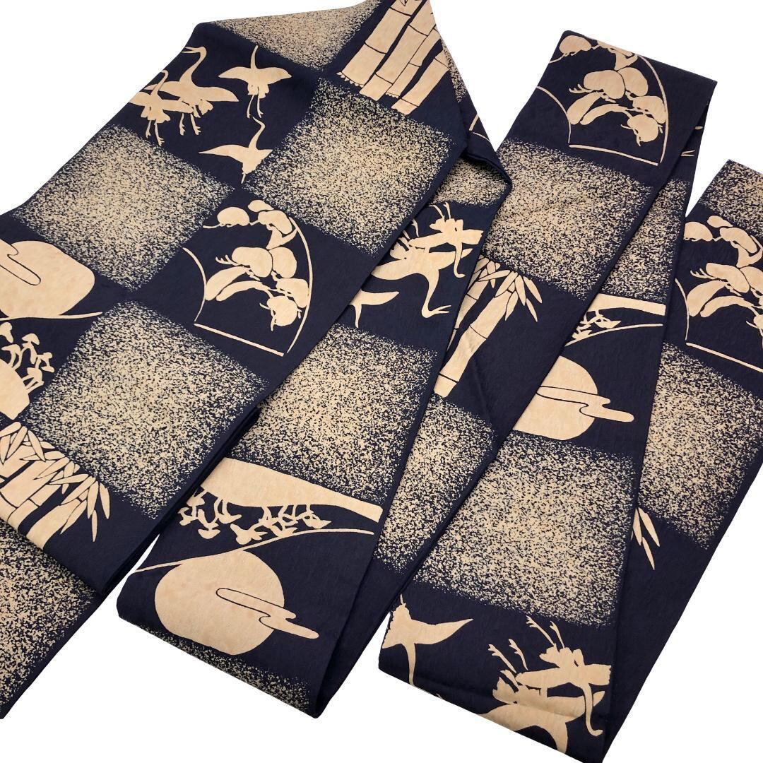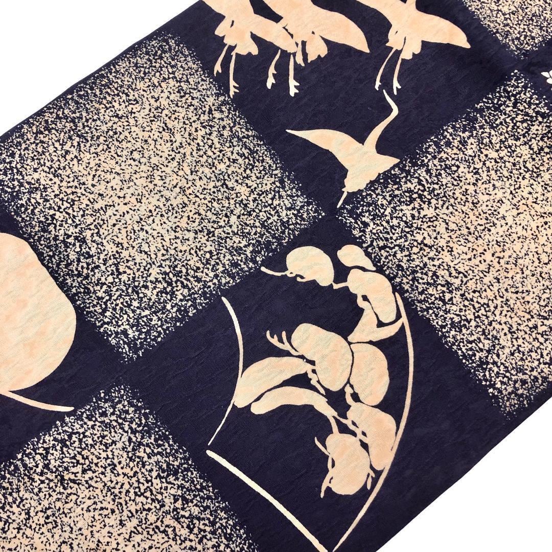 紫褐色のお色味の縮緬地に叩き染、月、竹、松、鶴などの雰囲気の良い染柄がデザインされた素敵なお品でございます。