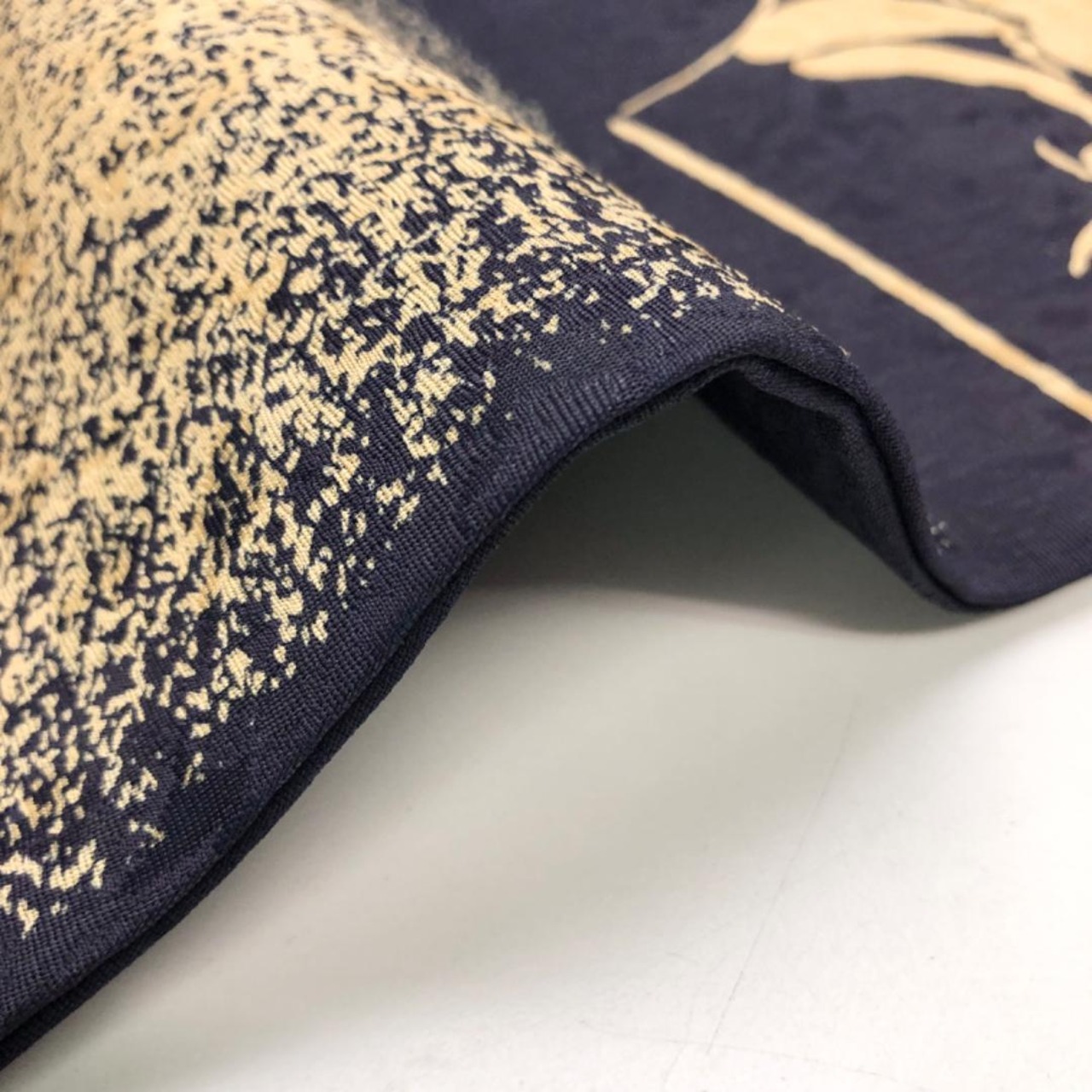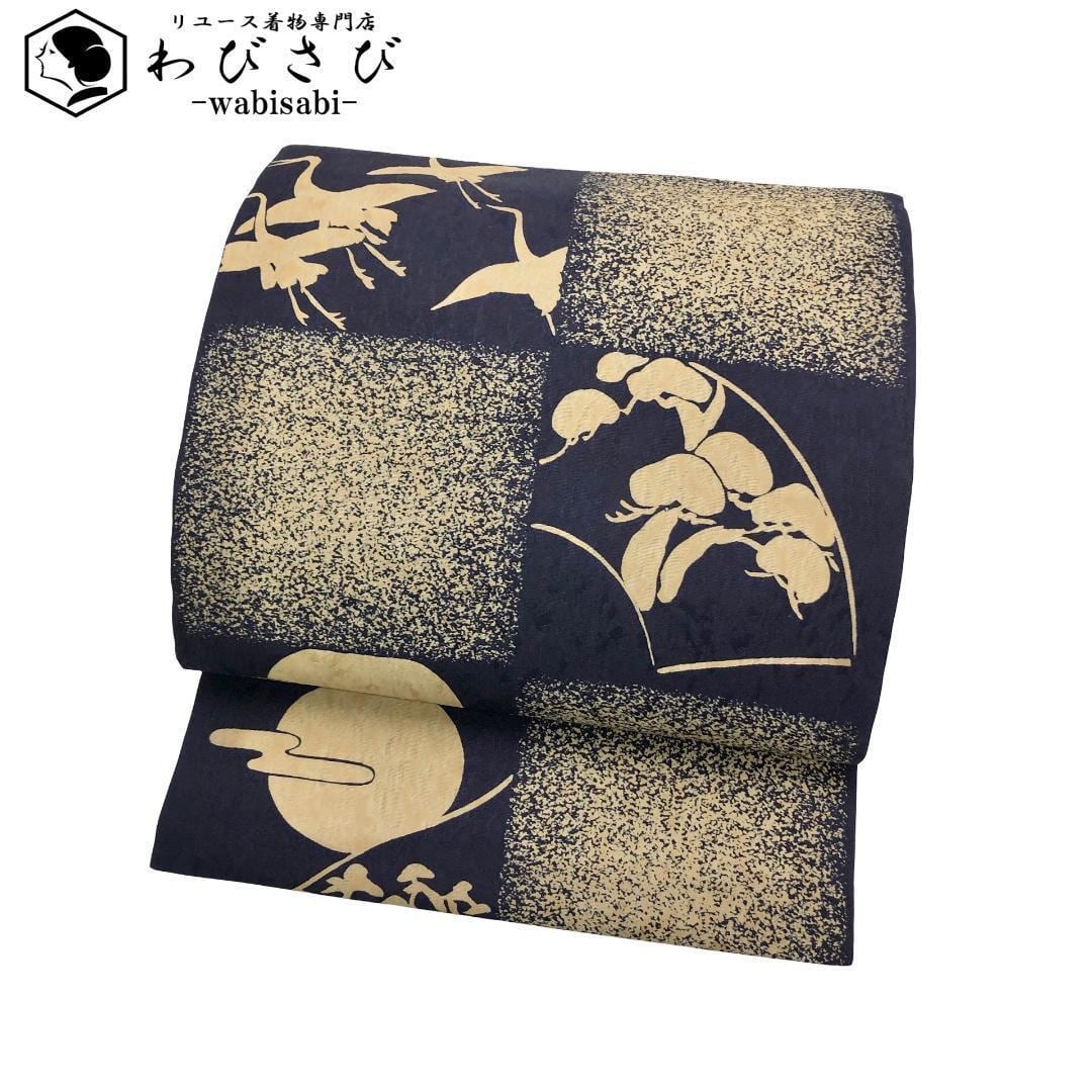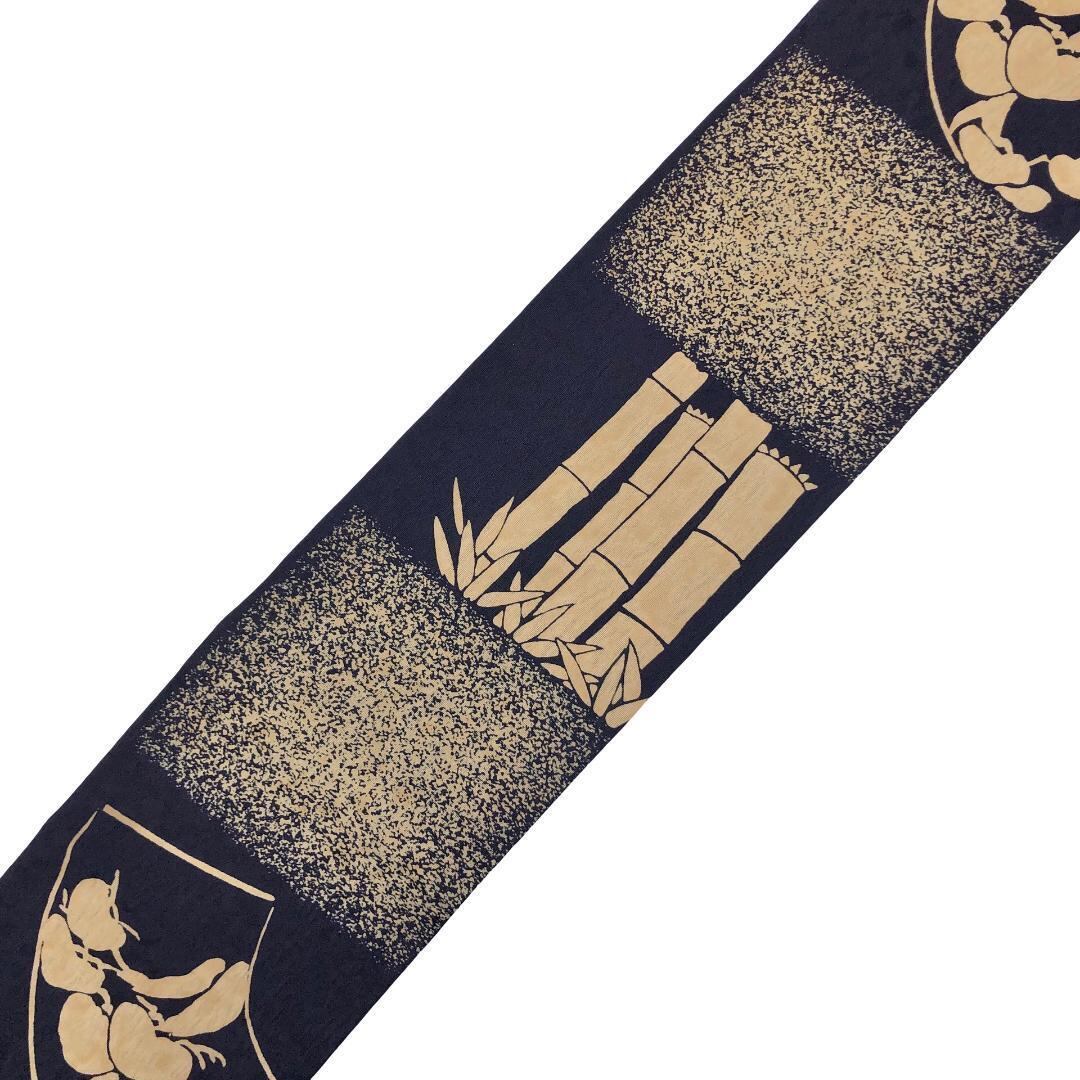 紫褐色のお色味の縮緬地に叩き染、月、竹、松、鶴などの雰囲気の良い染柄がデザインされた素敵なお品でございます。