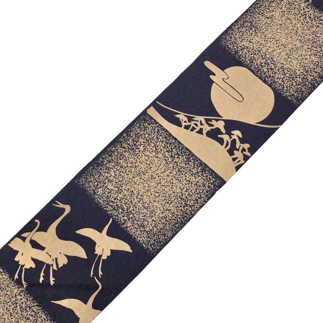 名古屋帯 月 竹 松 鶴 叩き染 紫褐色 縮緬 O-5712 着物 きもの kimono 和服 和装 中古 リサイクル着物 【送料無料】