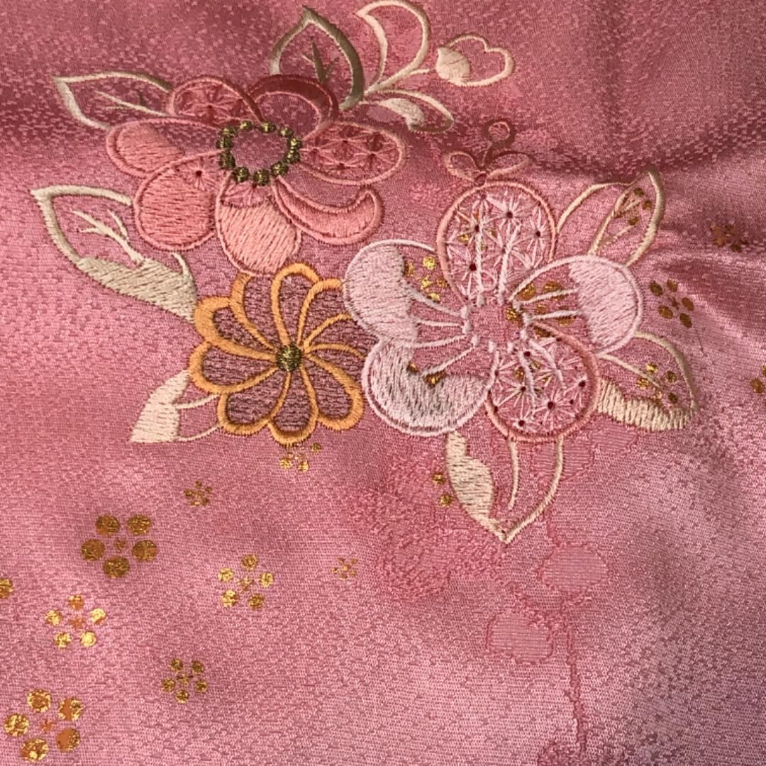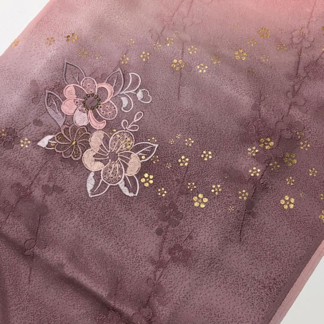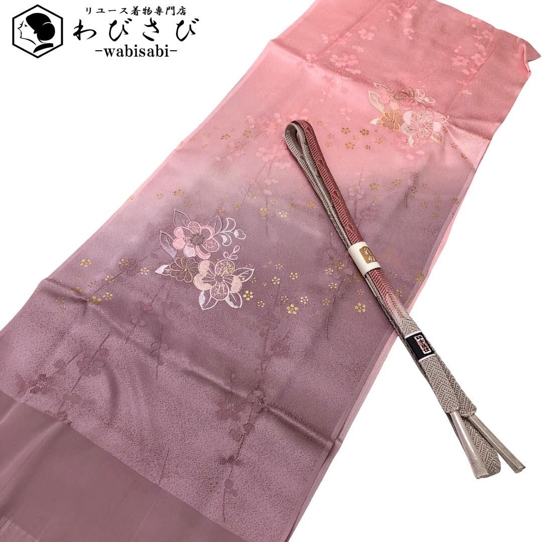 一斤染色ベースのお色味に花模様の刺繍の帯揚げ、笹浪組の帯締めの素敵なお品でございます。