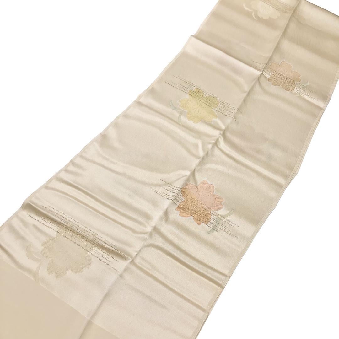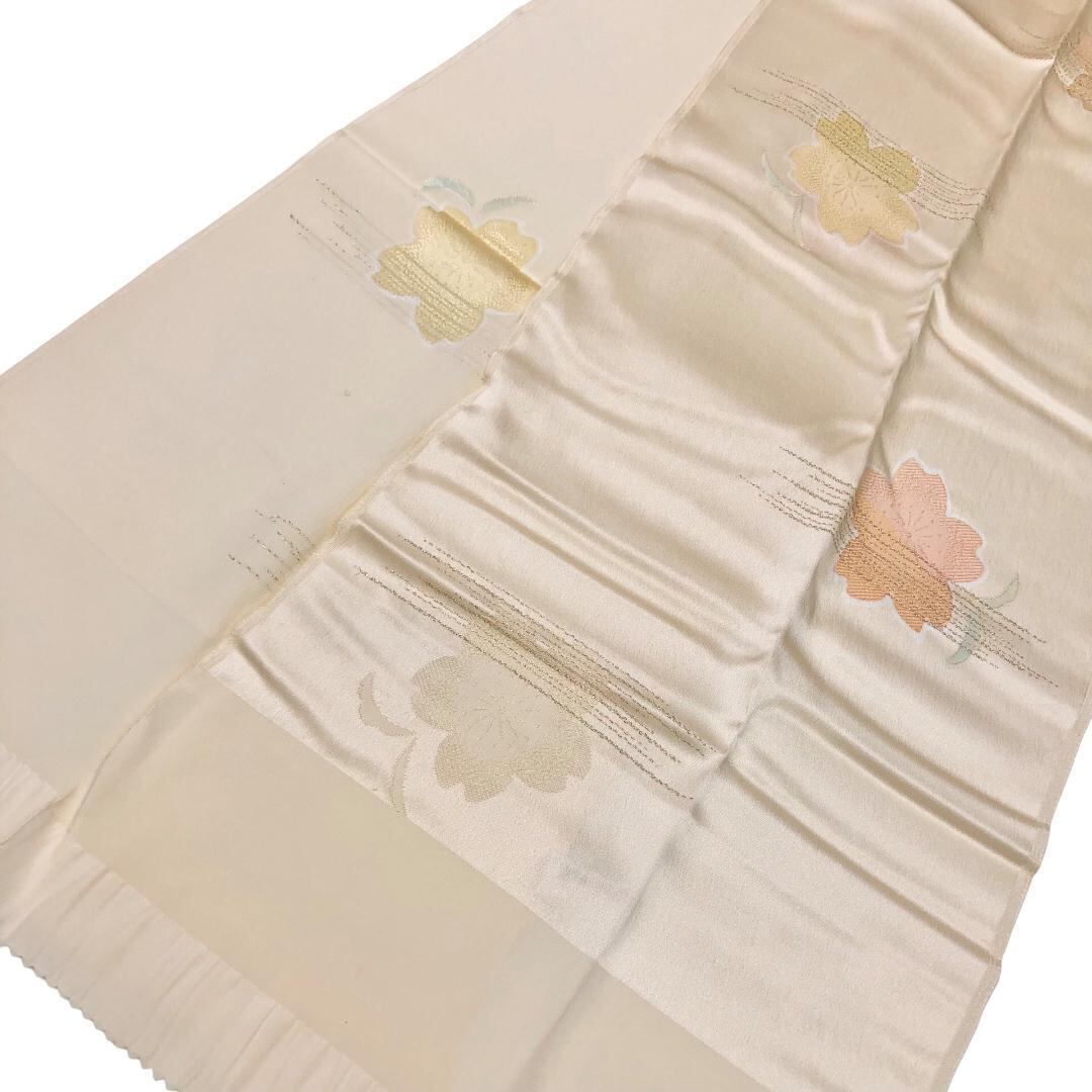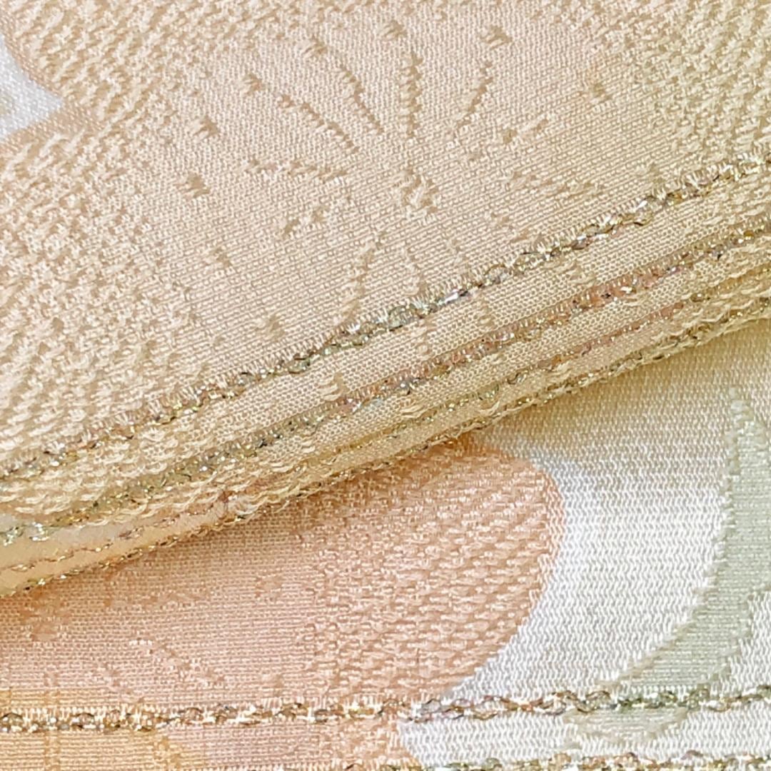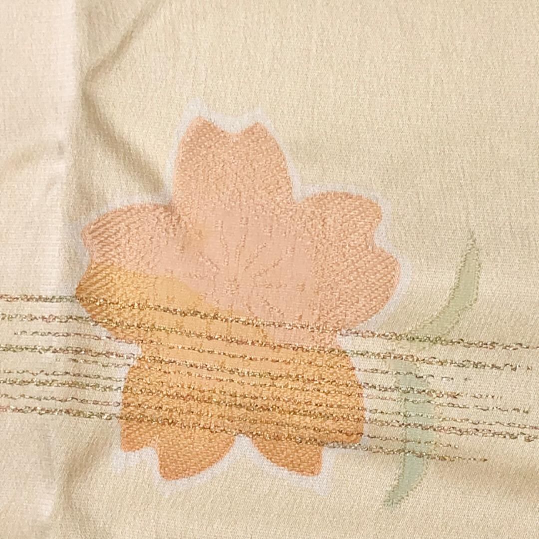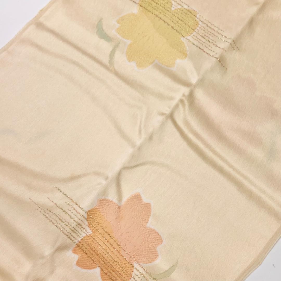 鳥の子色のお色味に花模様がデザインされた帯揚げ、高麗組の素敵なお品でございます。
