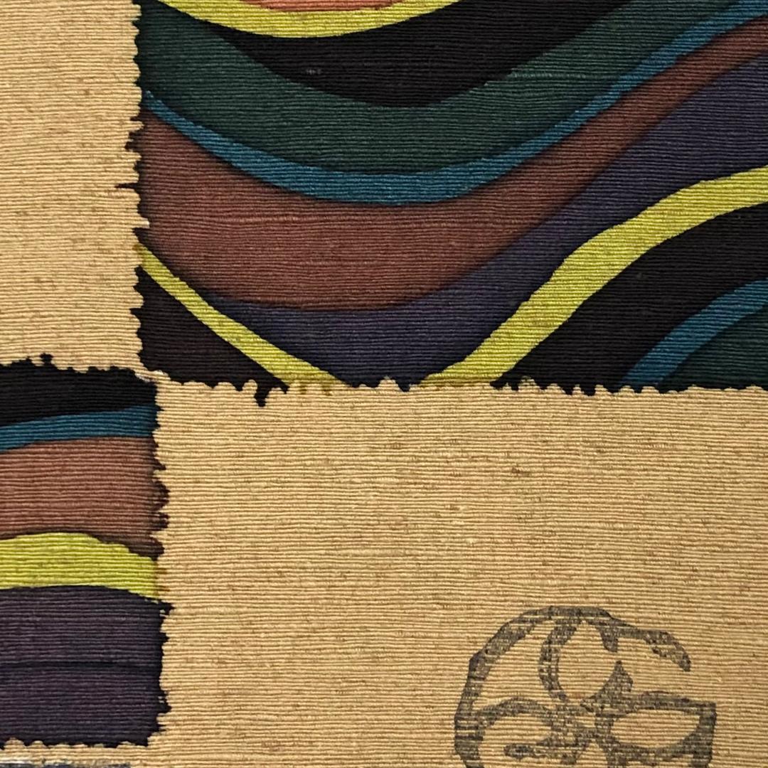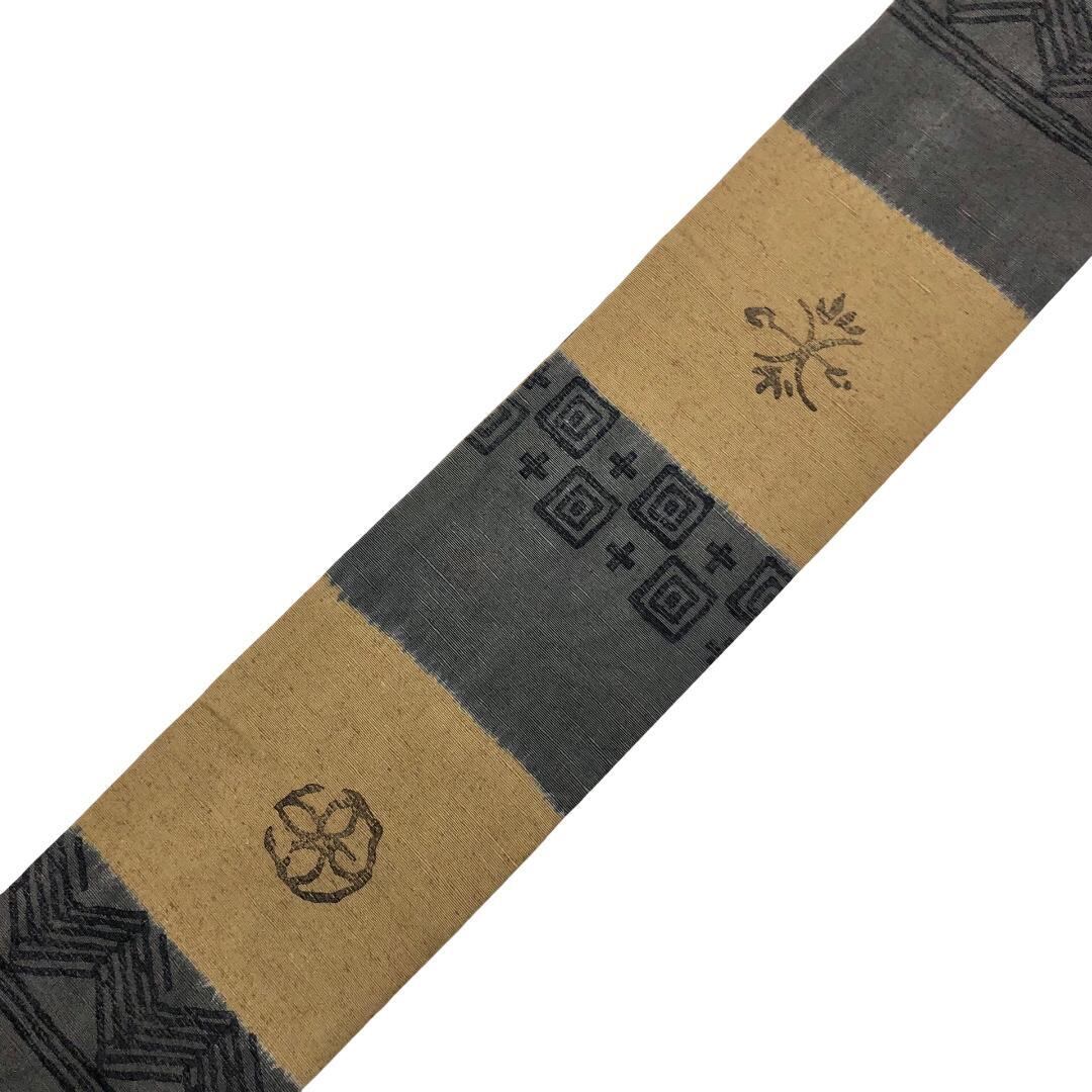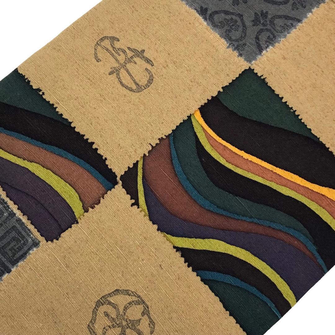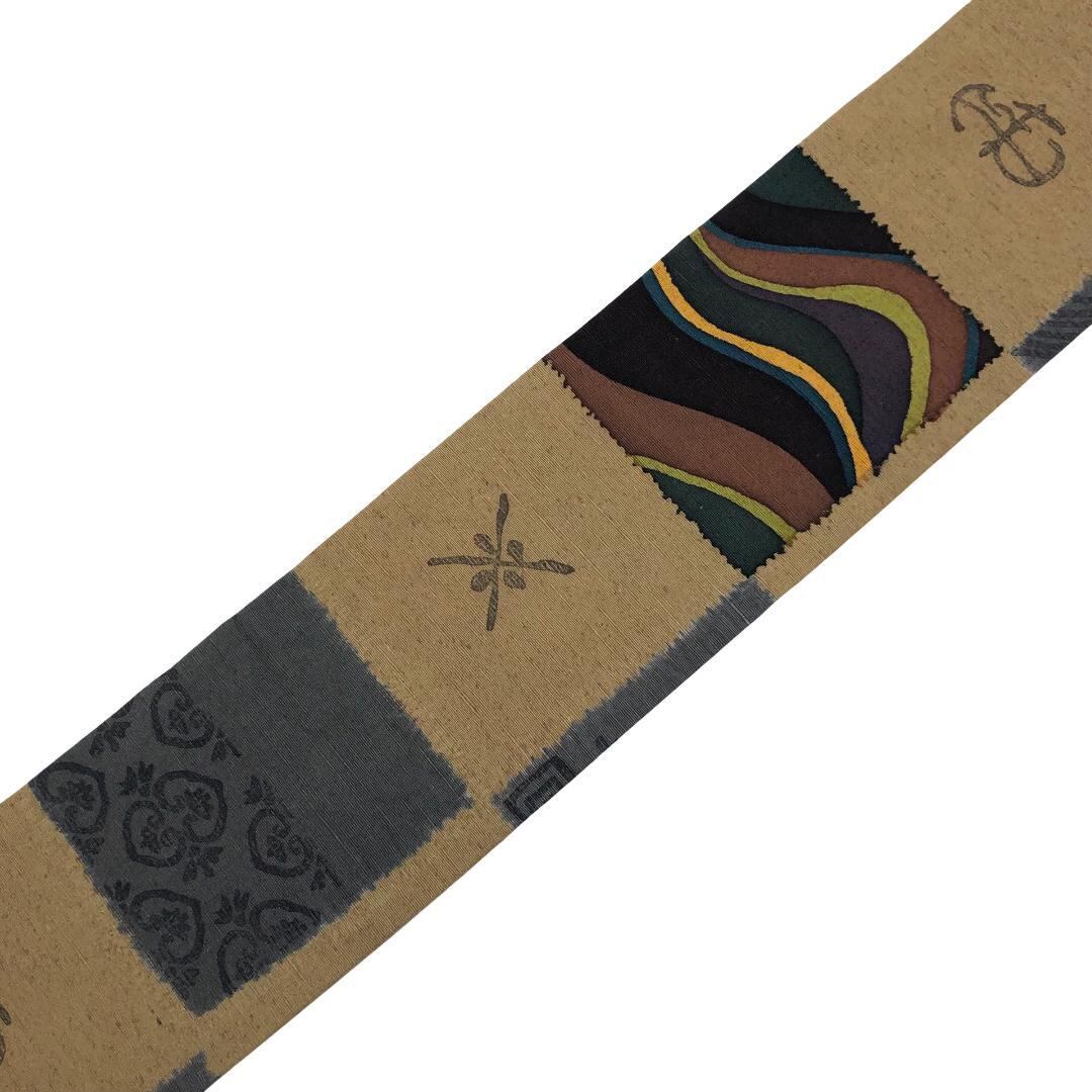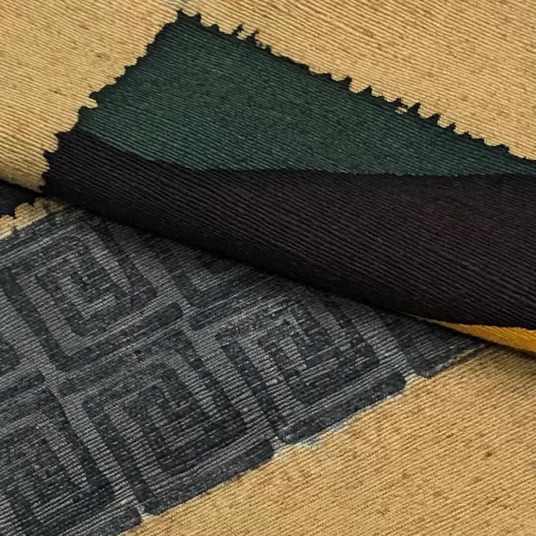 胡桃色の雰囲気の良いお色味の紬地に市松に曲線模様などの柄裄がデザインされた雰囲気の良い素敵なお品でございます。