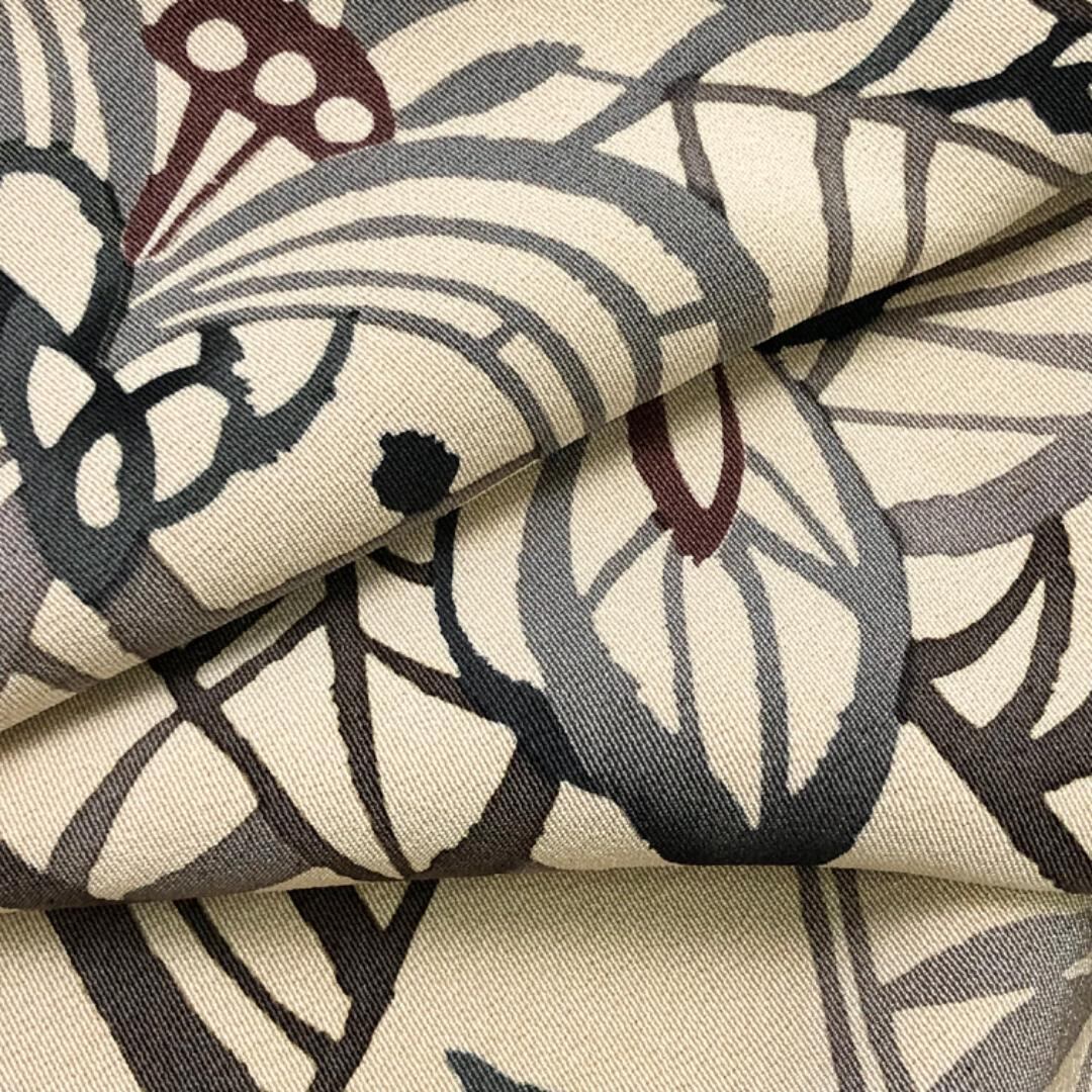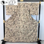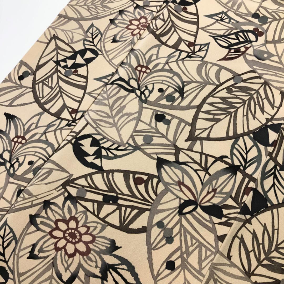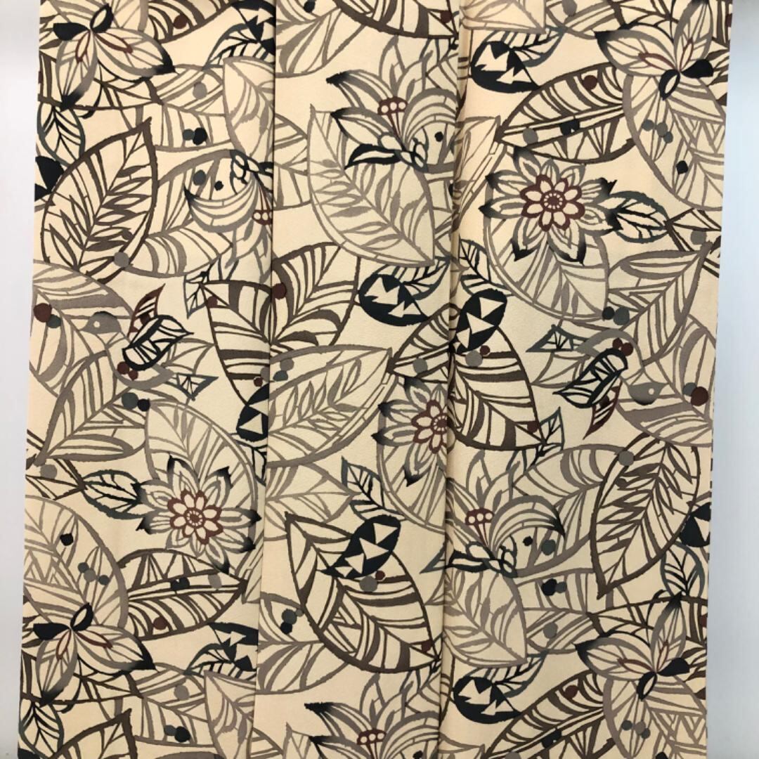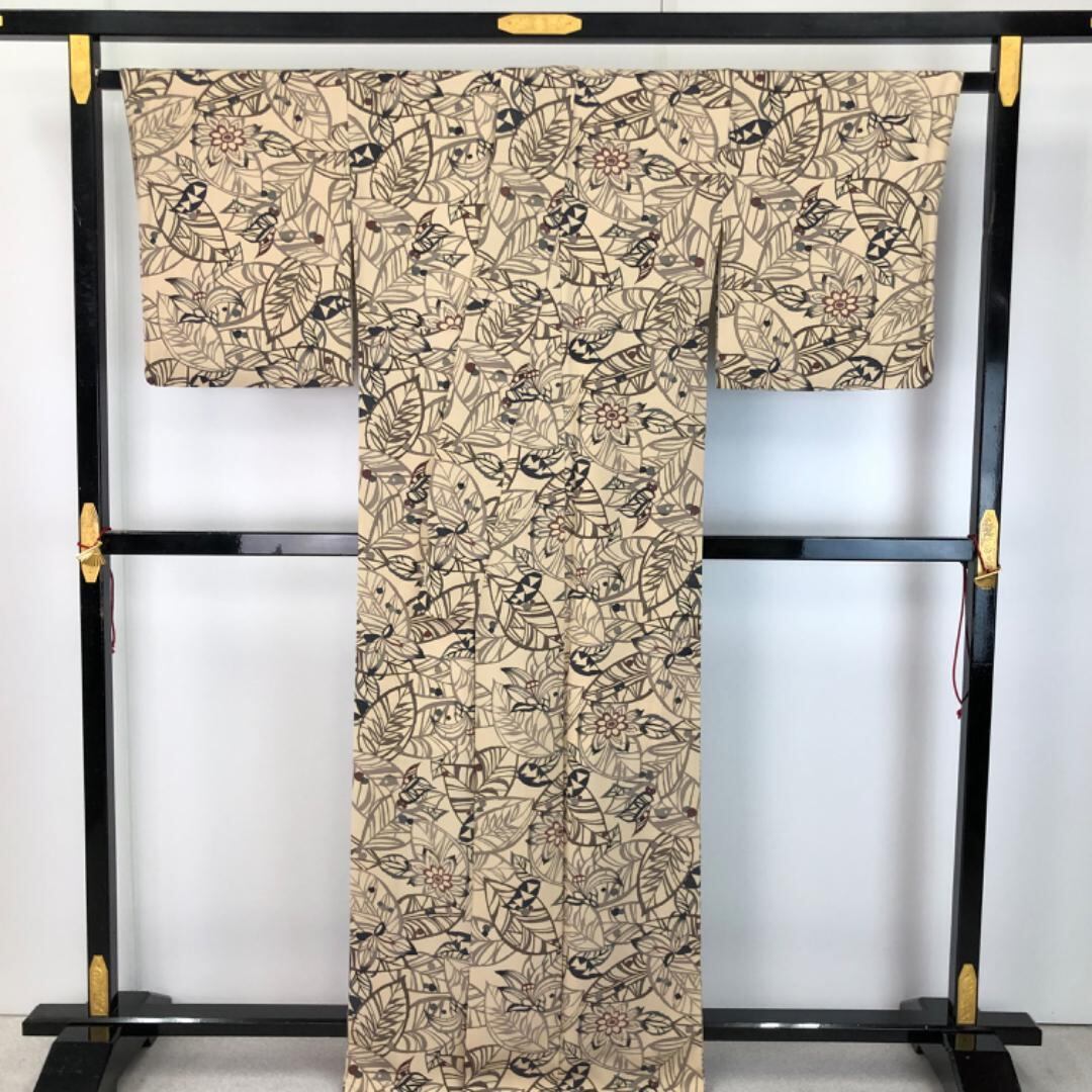 桑色白茶色のお色味の縮緬地に花模様の雰囲気の良い色彩の型染でデザインされた素敵なお品でございます。