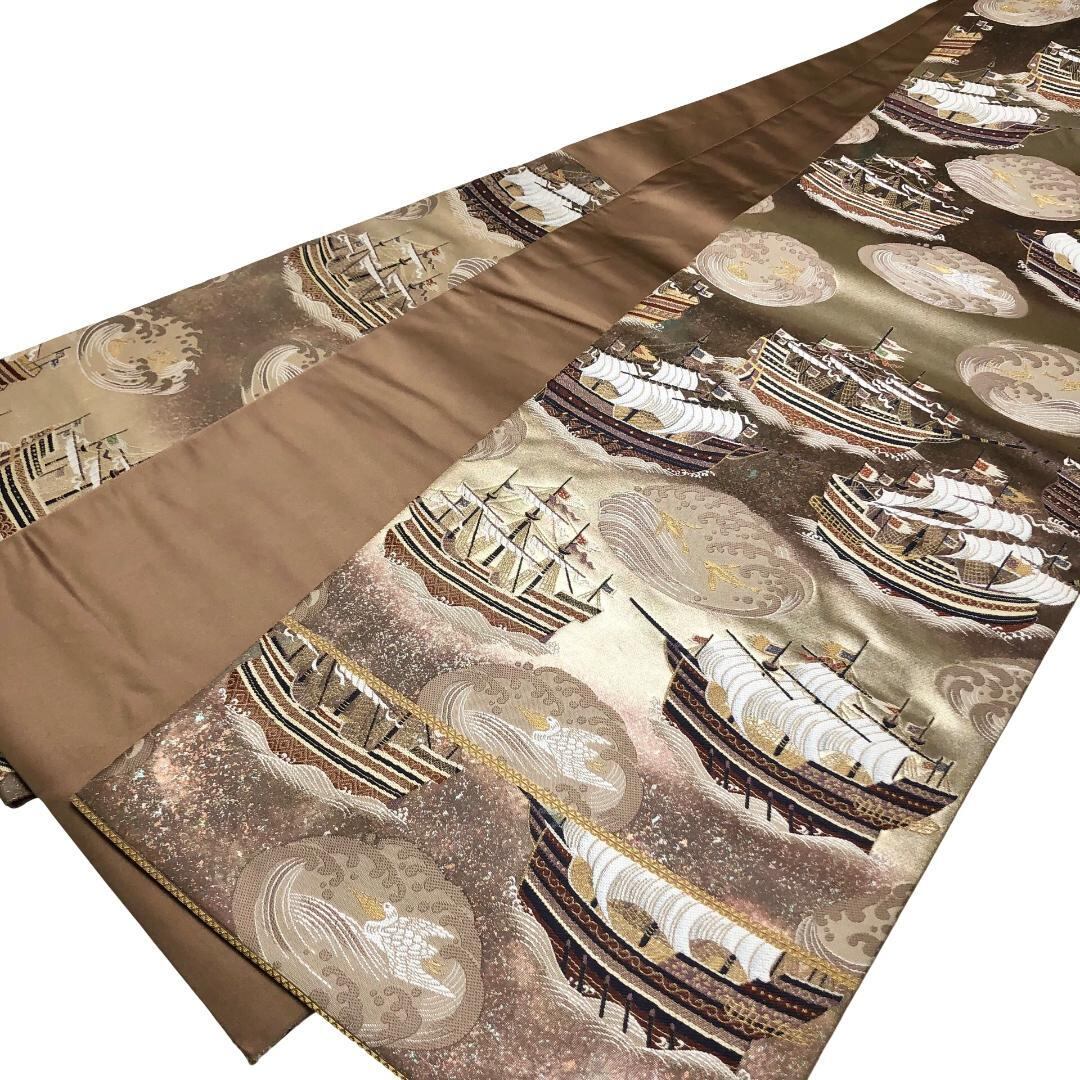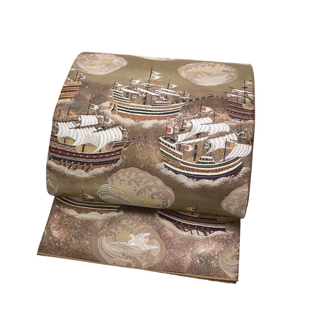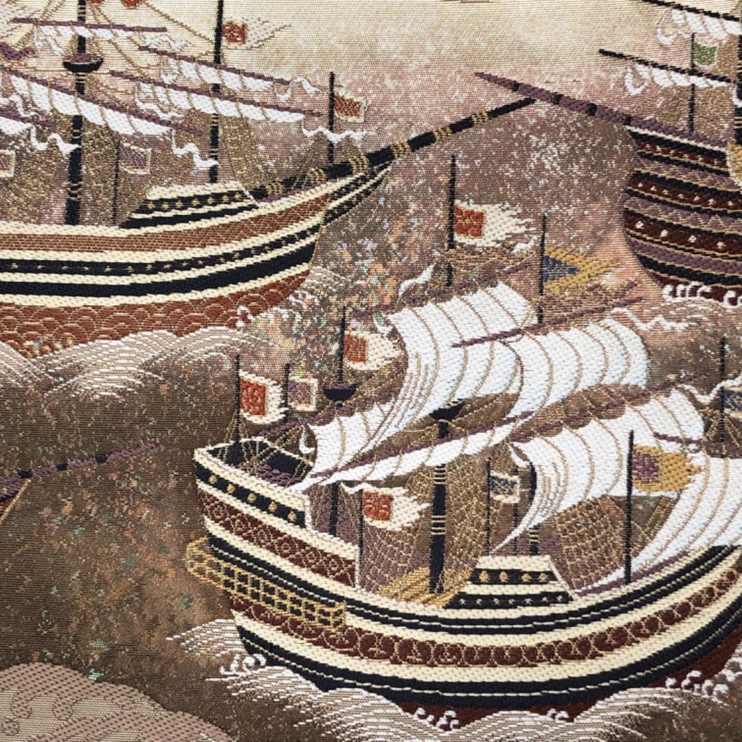 茶鼠色ベースの落ち着きのあるお色味、南蛮船に荒波、ペリカンや飛魚などの柄裄がデザインされた大変雰囲気の良い素敵なお品でございます。