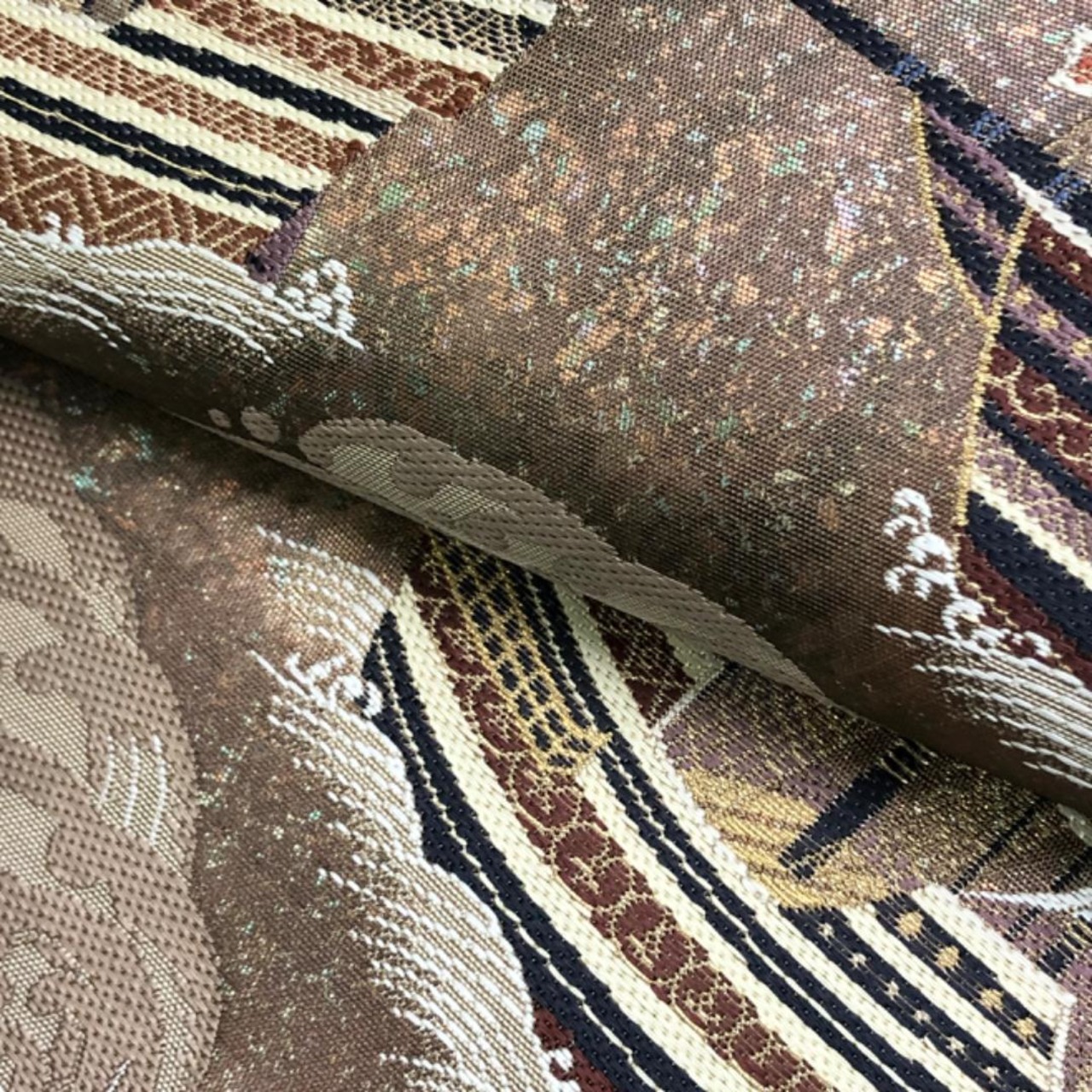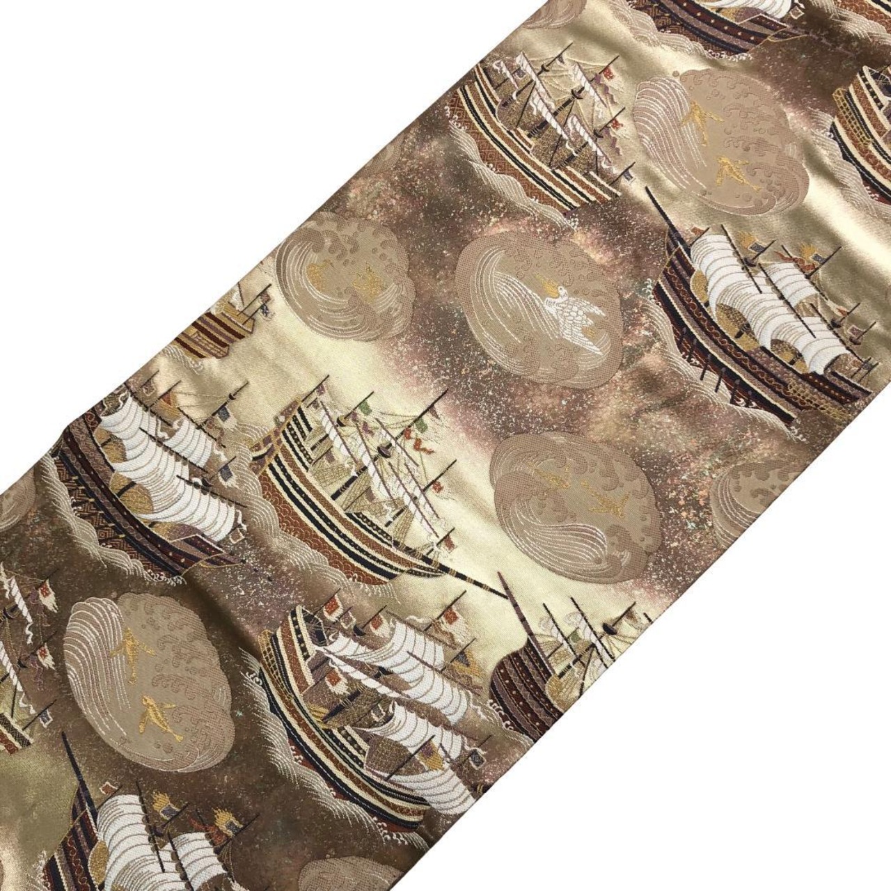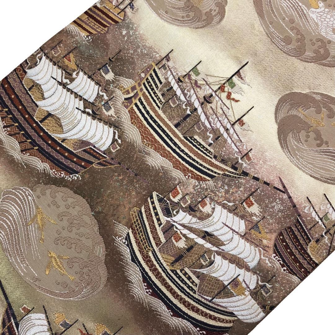 茶鼠色ベースの落ち着きのあるお色味、南蛮船に荒波、ペリカンや飛魚などの柄裄がデザインされた大変雰囲気の良い素敵なお品でございます。