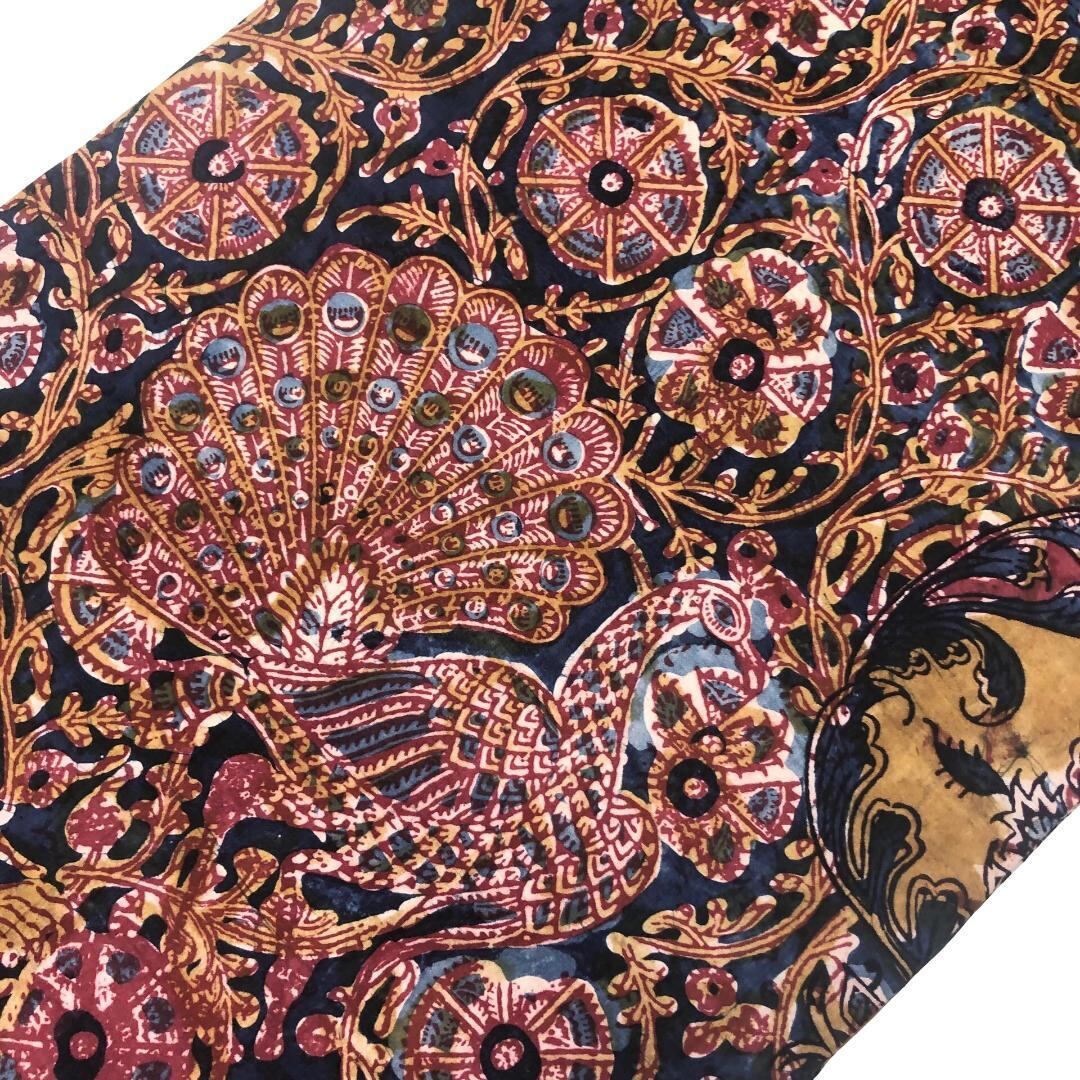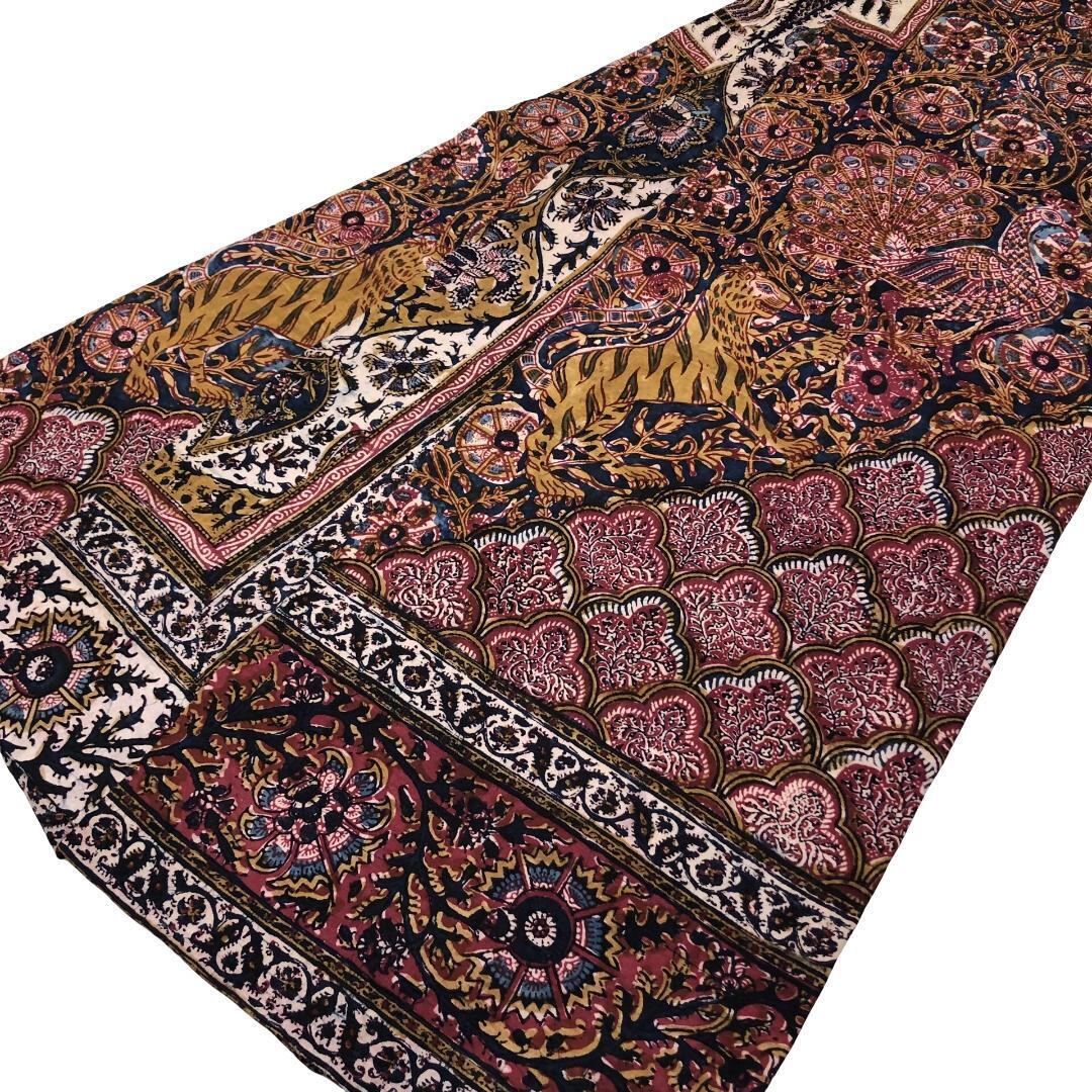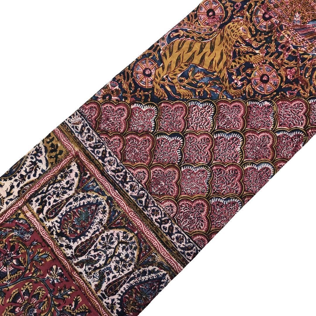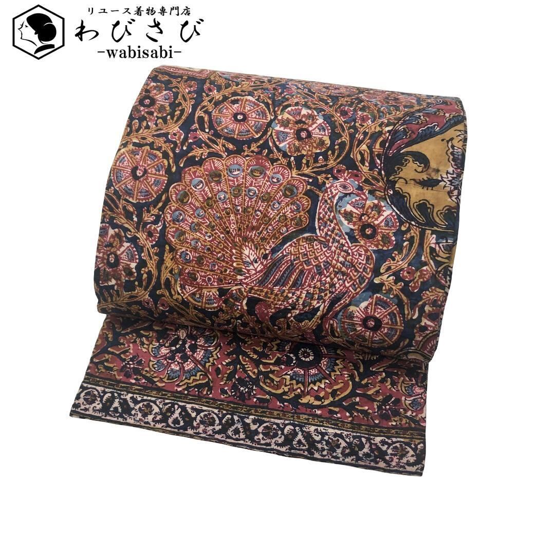 印象的な色彩の染柄、虎、孔雀などの動物柄、花模様がデザインされたおそらく創作で作られたオリエンタルな雰囲気の素敵なお品でございます。