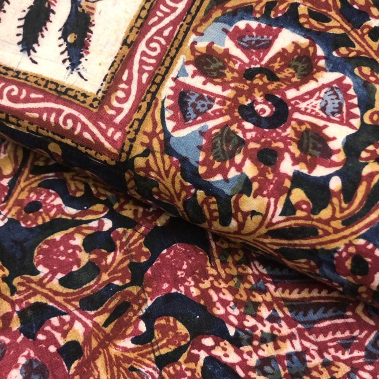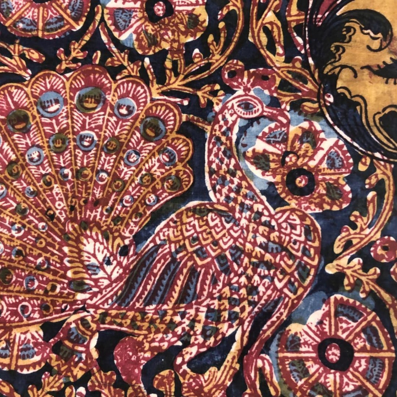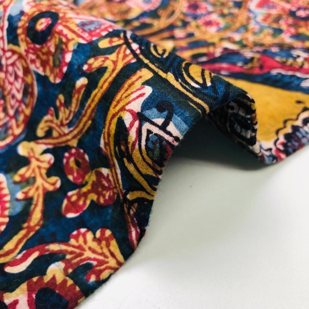 印象的な色彩の染柄、虎、孔雀などの動物柄、花模様がデザインされたおそらく創作で作られたオリエンタルな雰囲気の素敵なお品でございます。