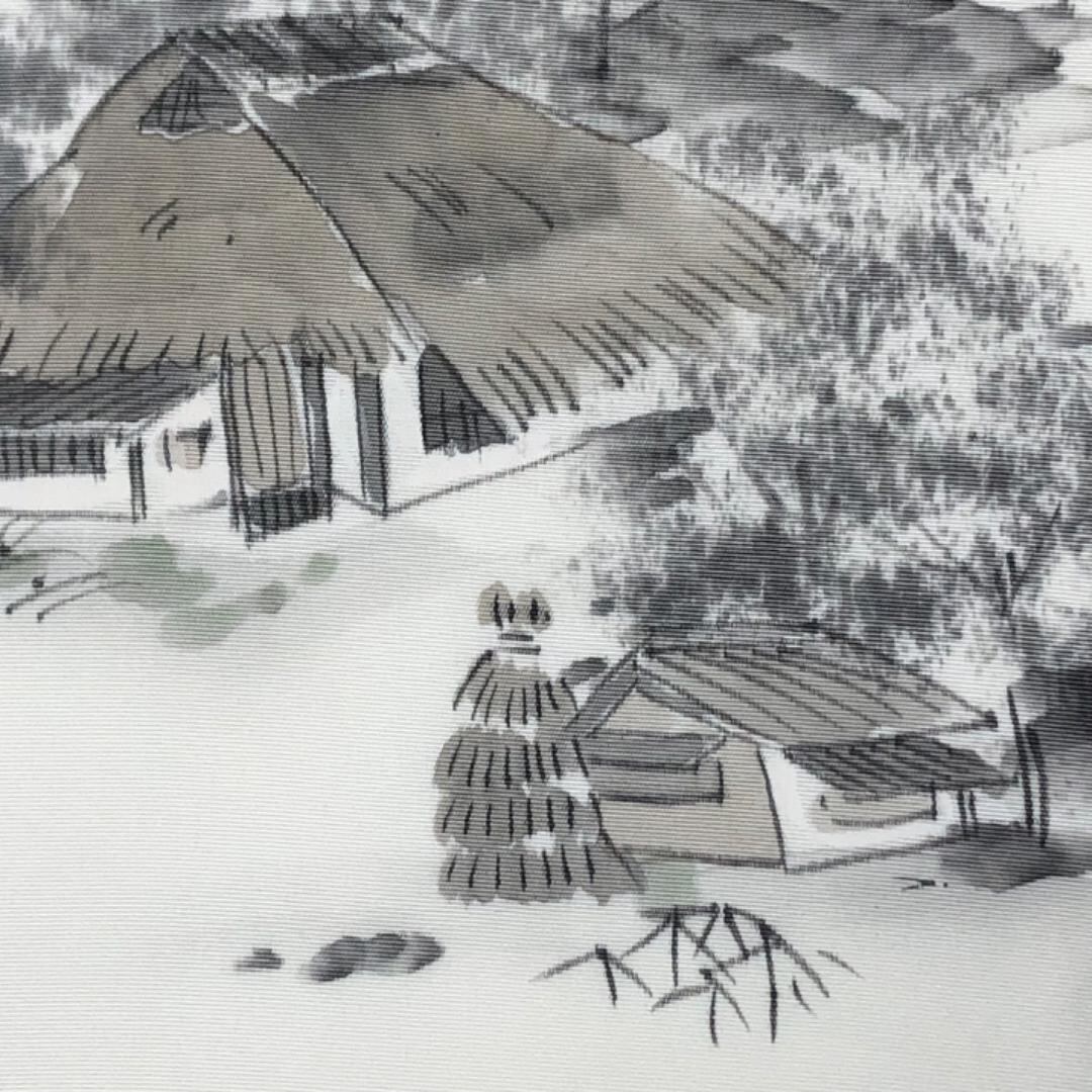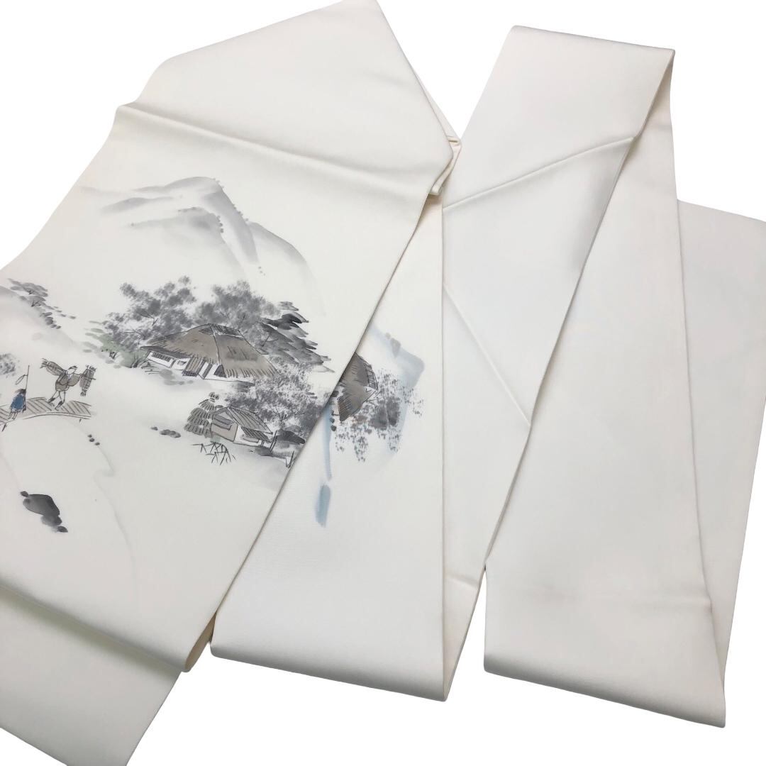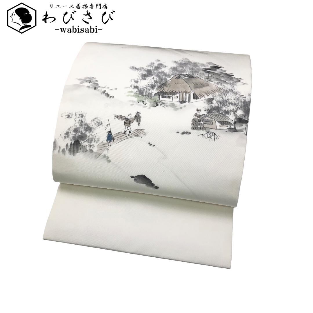 名古屋帯 作家物 塩瀬 手描き 風景柄 乳白色 O-5747 着物 きもの kimono 和服 和装 中古 リサイクル着物 【送料無料】