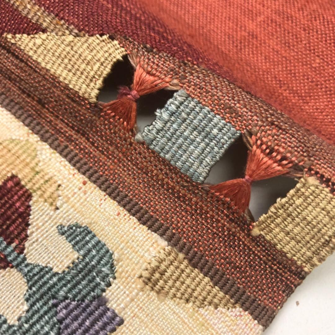 紅唐色に織柄の華模様がデザインされた素敵な柄裄のお品でございます。