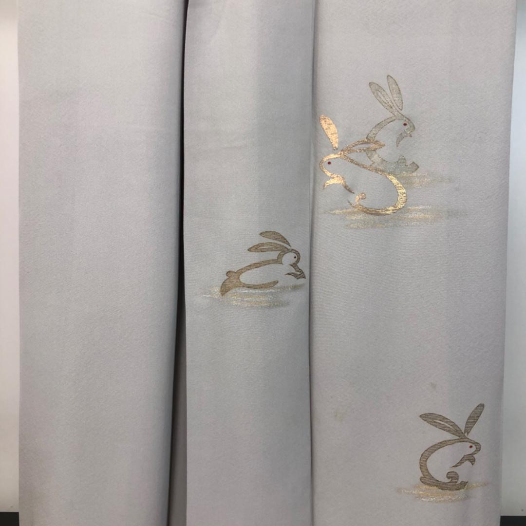 白鼠色の上品なお色味に可愛らしい兎の柄裄がデザインされた雰囲気の良い素敵なお品でございます。