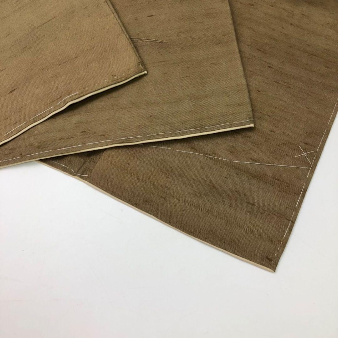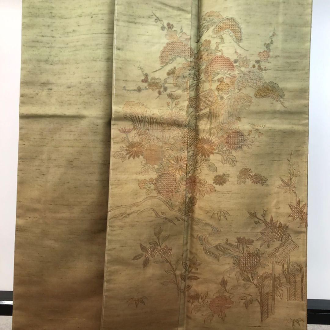 付下げ 紬 相良刺繍 松に花模様 利休色 しつけ糸 トールサイズ K-5511 着物 きもの kimono 和服 和装 中古 リサイクル着物 【送料無料】