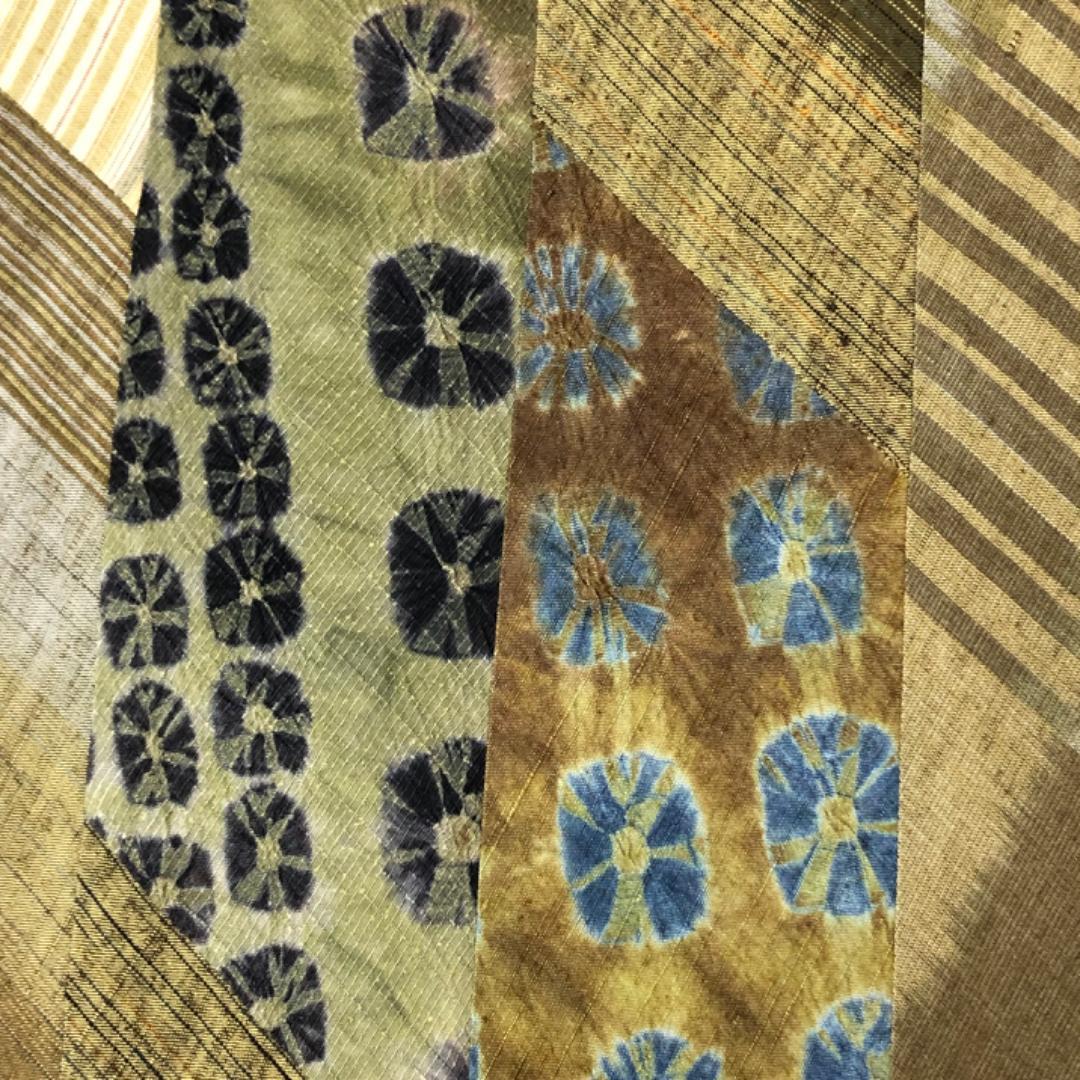 落ち着いた色彩の縞模様や絞り柄の切嵌でデザインされた雰囲気の良い素敵なお品でございます。