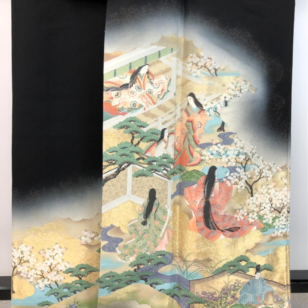 美しい十二単の女性に殿方、流水に花模様などの柄裄がデザインされた色彩美しい素敵なお品でございます。