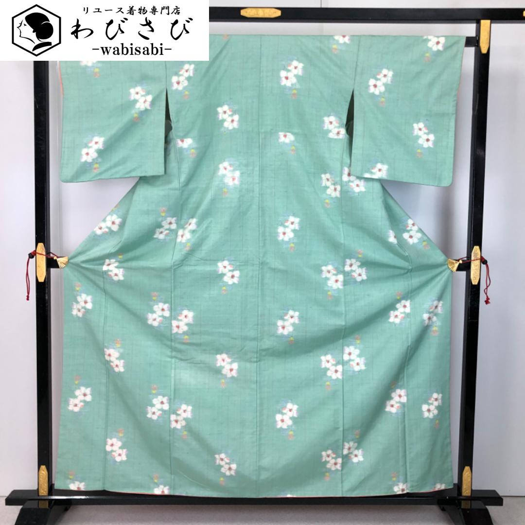 紬着物 飛び柄 花模様 薄浅葱色 K-5541 着物 きもの kimono 和服 和装 中古 リサイクル着物 【送料無料】