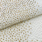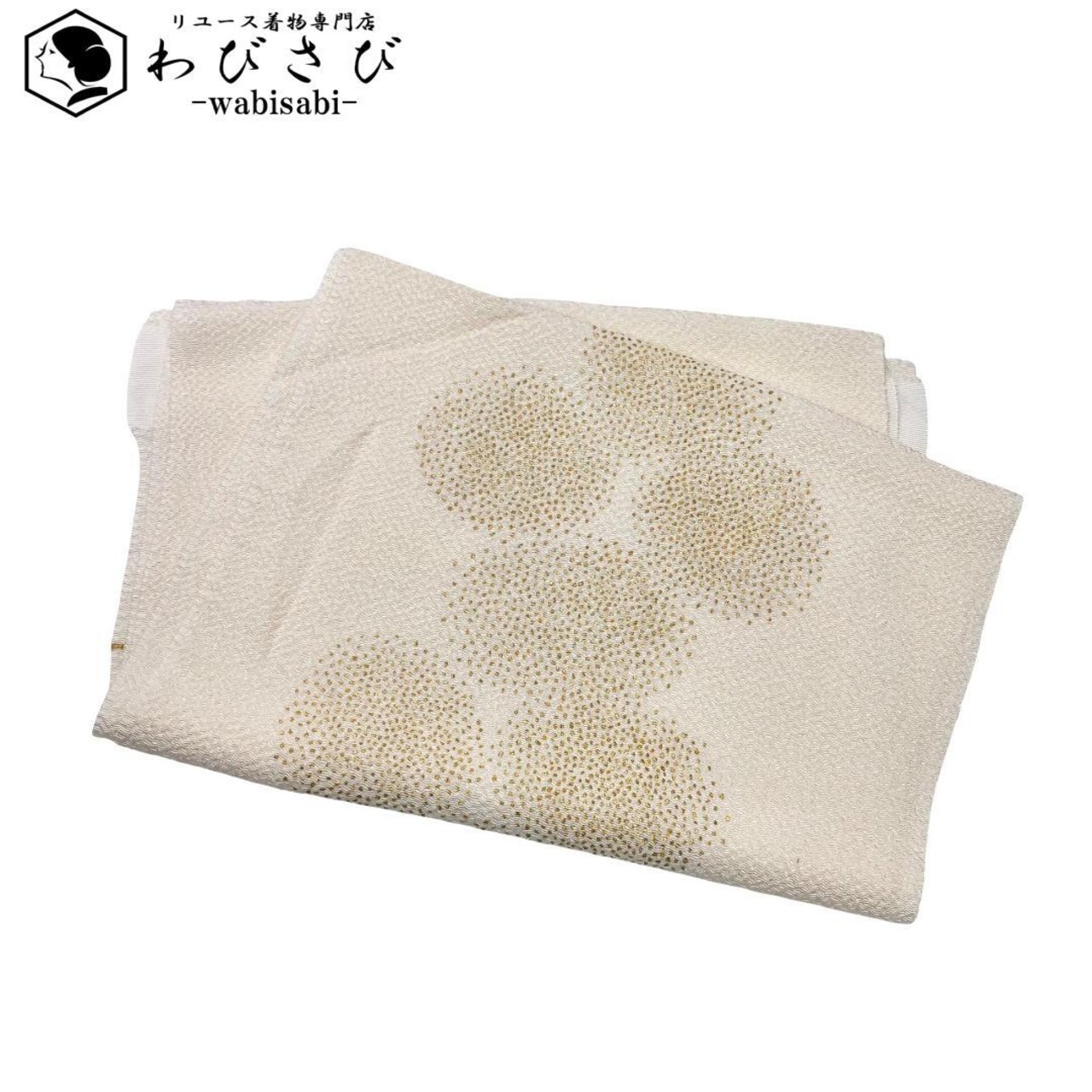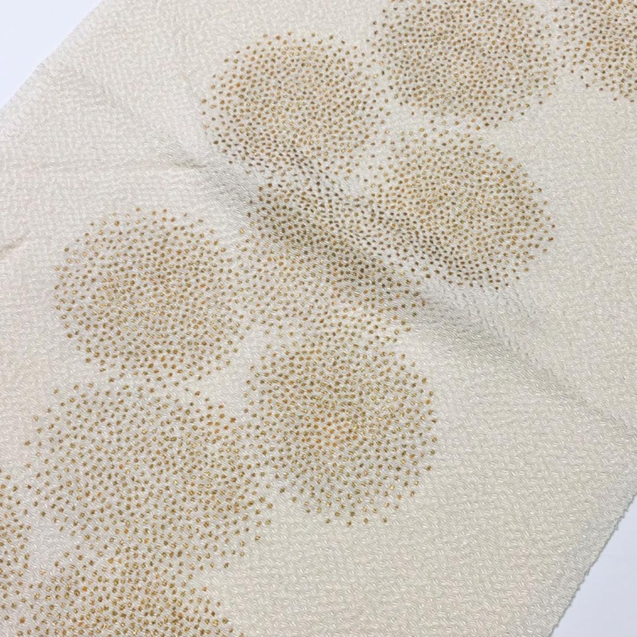 乳白色のお色味に丸がデザインされた素敵な縮緬のお品でございます。