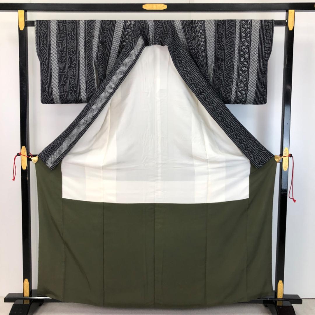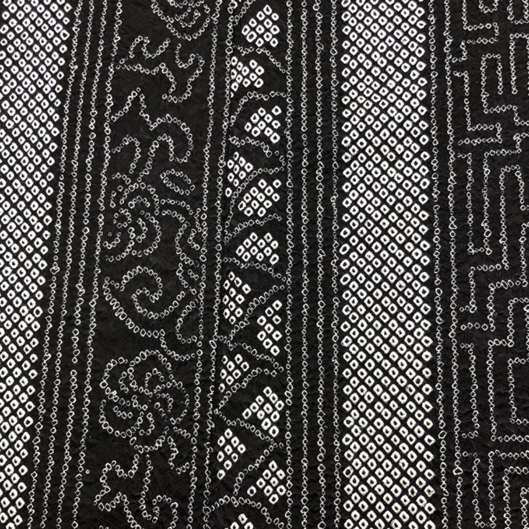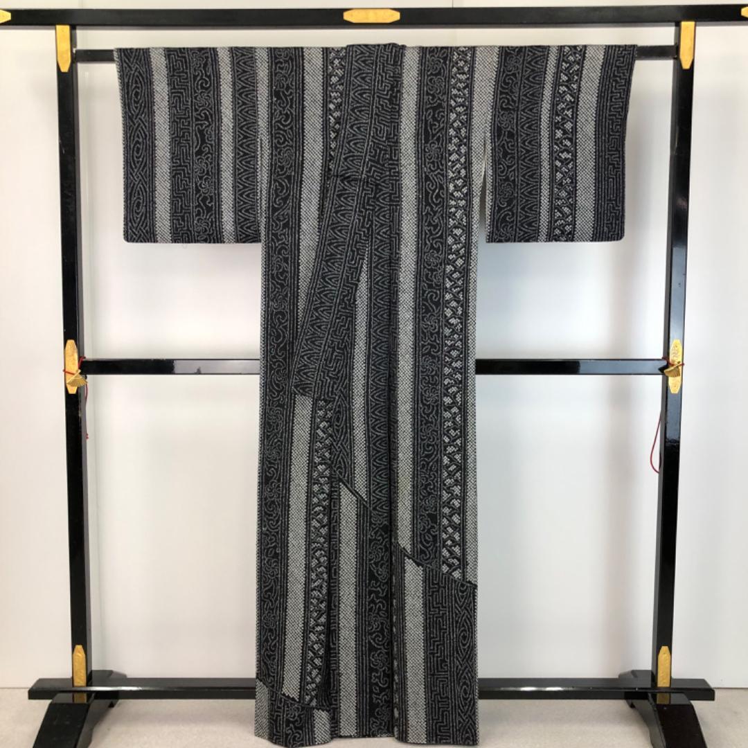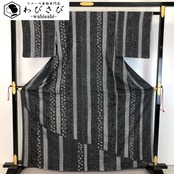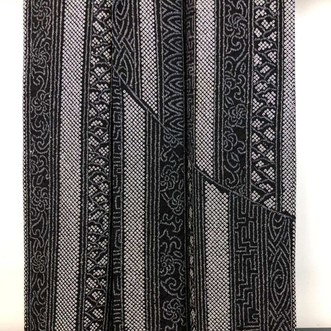 黒色ベースのモノトーンのお色味に縦縞模様、多様な柄行がデザインされた雰囲気の良い素敵なお品でございます。