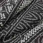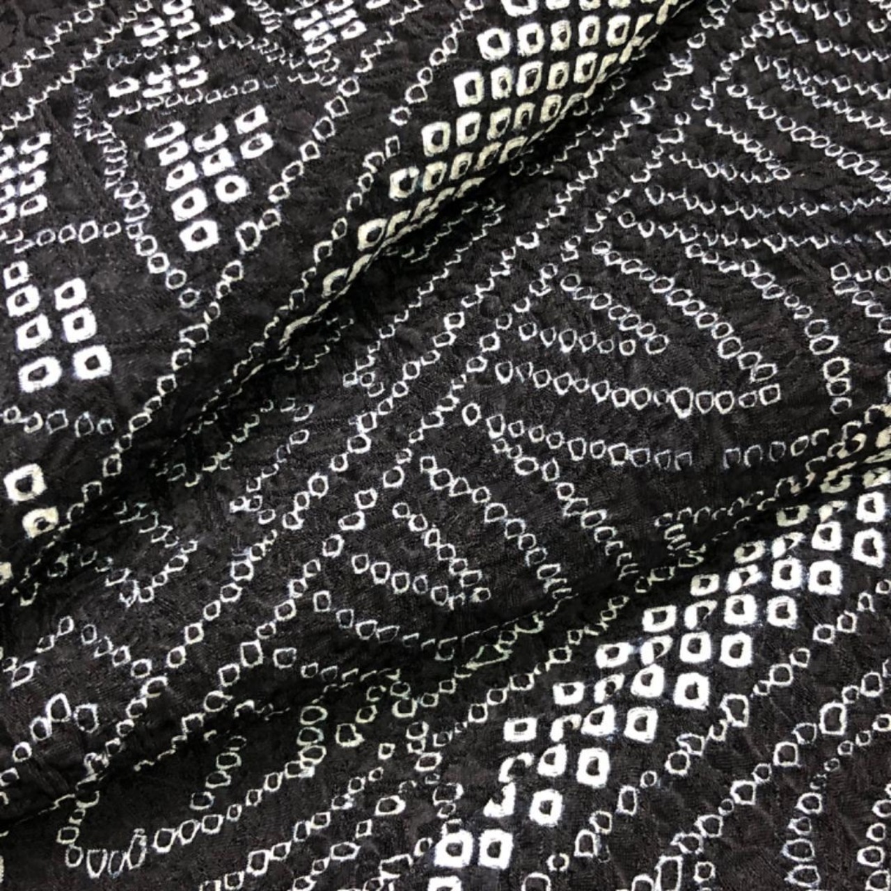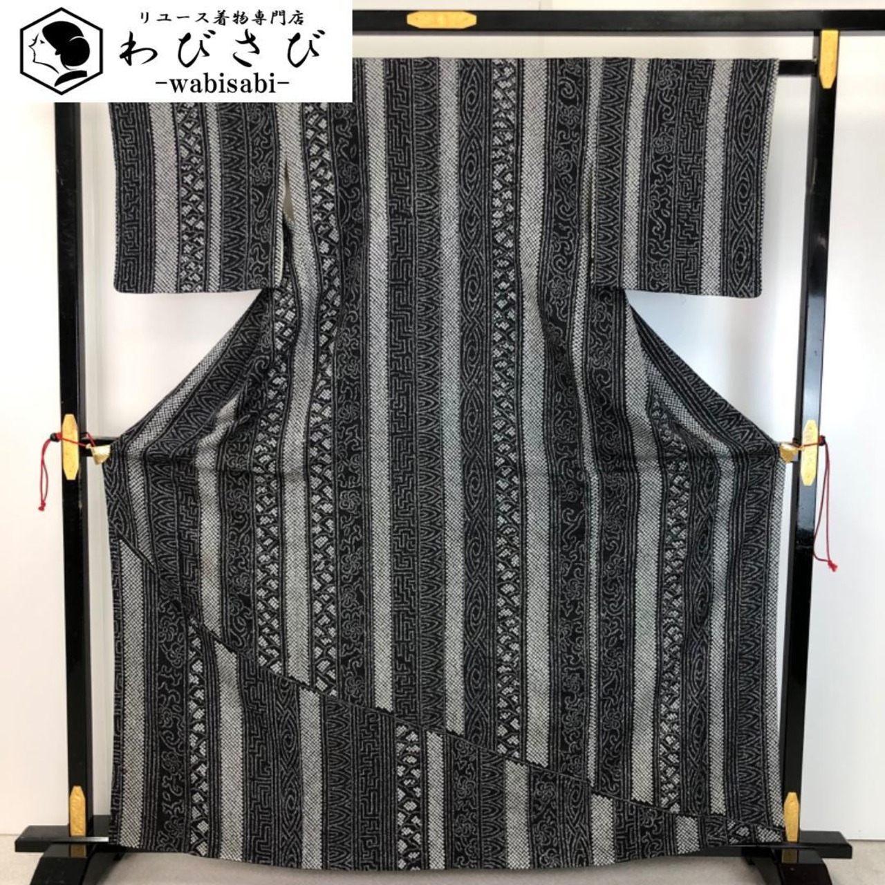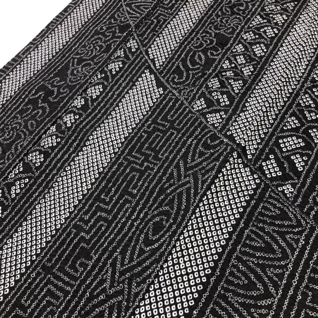 黒色ベースのモノトーンのお色味に縦縞模様、多様な柄行がデザインされた雰囲気の良い素敵なお品でございます。