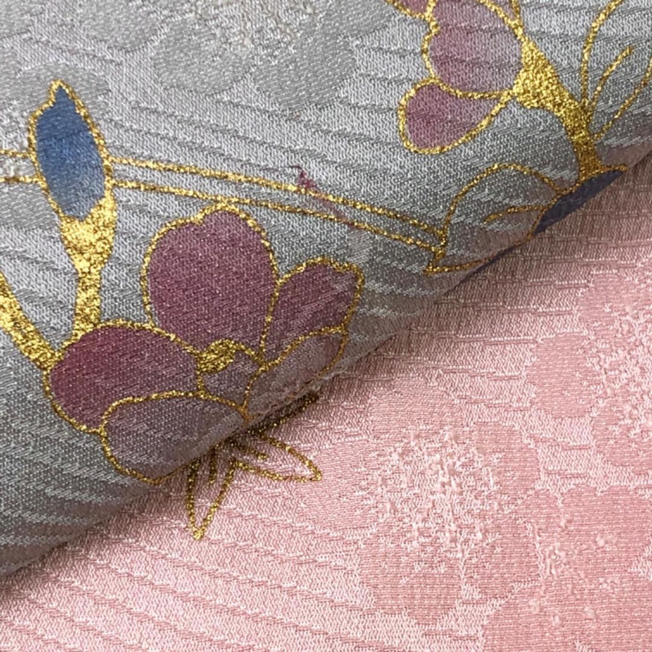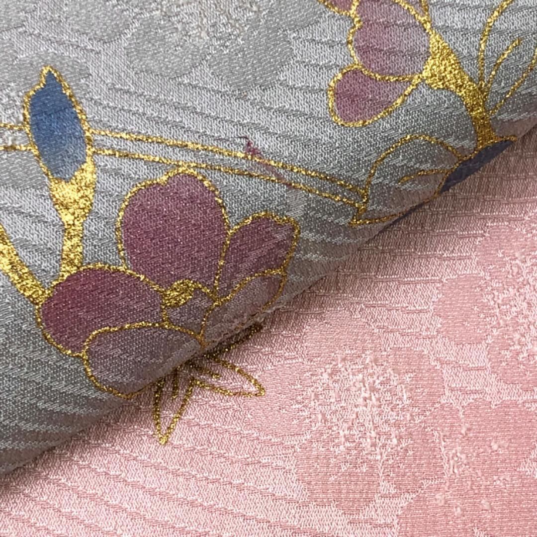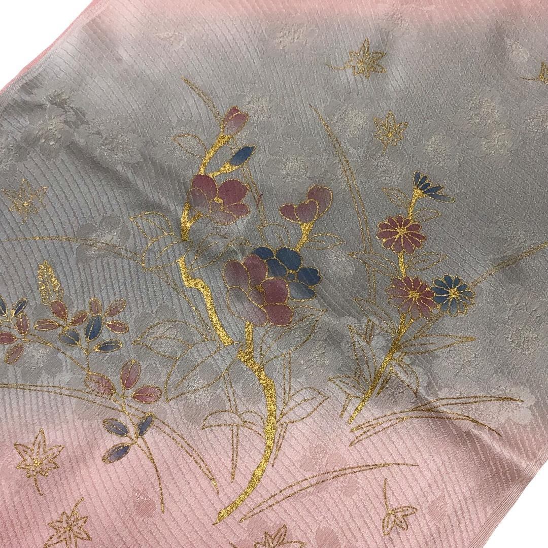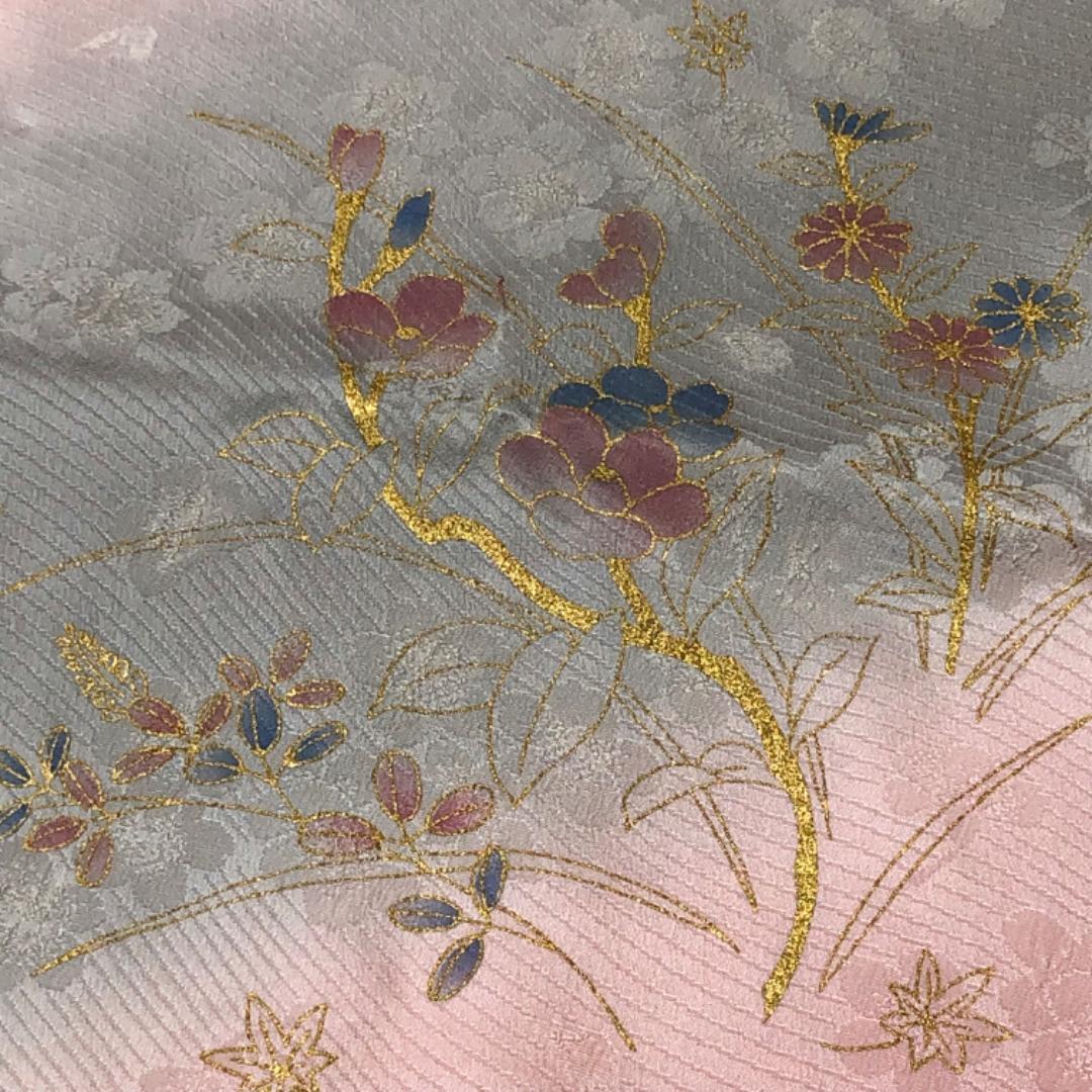 退紅色ベースの暈しのお色味に綸子の帯揚げ、平組紐の帯締めの素敵なお品でございます。